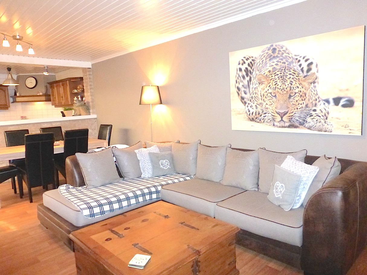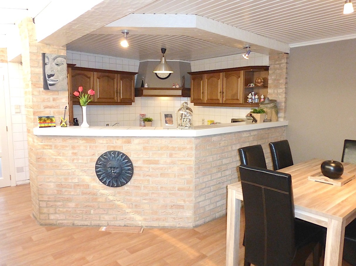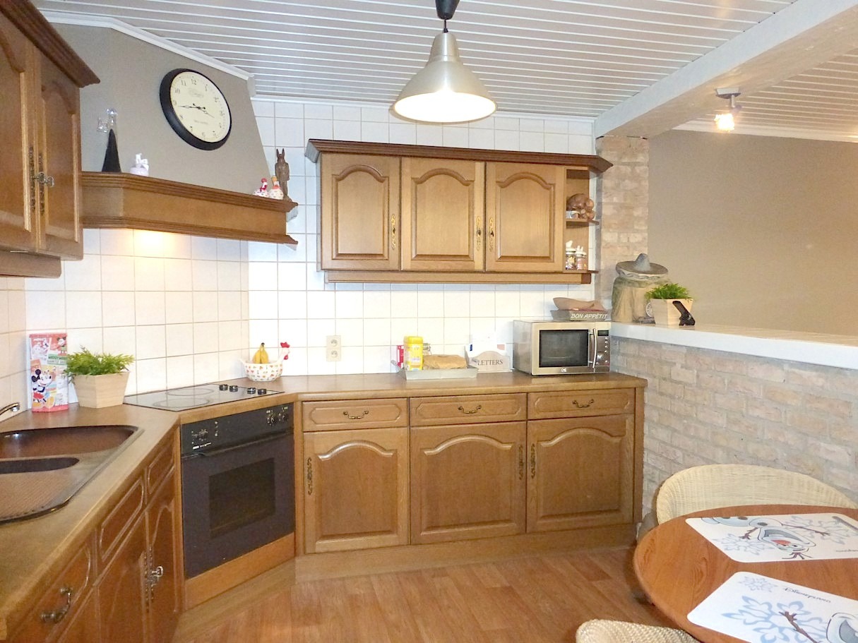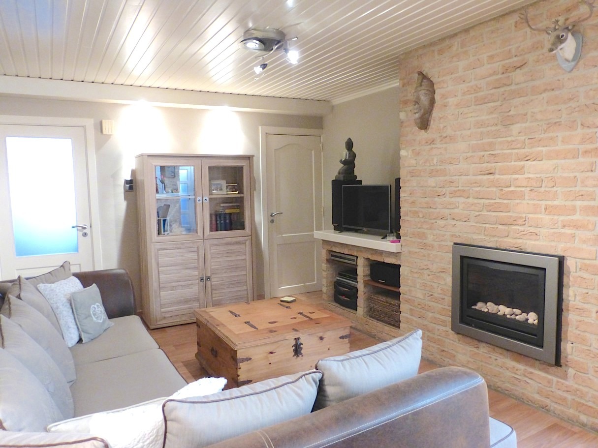 We komen de woonst binnen via de ruime inkomhal met plaats voor vestiaire. Bij het binnenkomen van de leefruimte valt meteen de gezellige, landelijke inrichting op. De open keuken met halfhoog muurtje zorgt ervoor dat er tof contact is met de living, maar er toch een bepaalde afscheiding is.