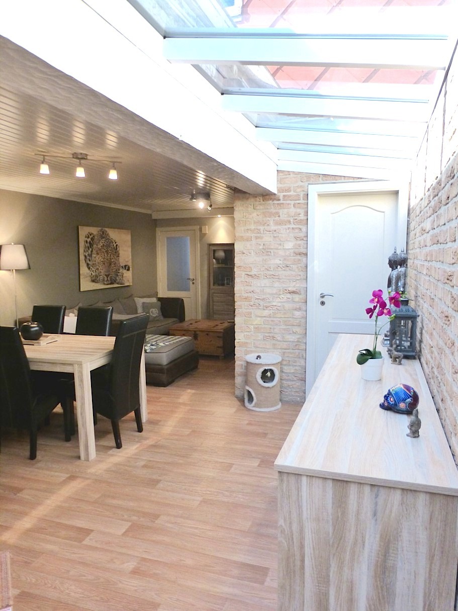 De vernieuwde lichtstraat zorgt voor veel licht en loopt door tot achteraan de woning, waar we de leuke stadstuin terug vinden. Men kan er gans de dag genieten van de zon in alle rust!