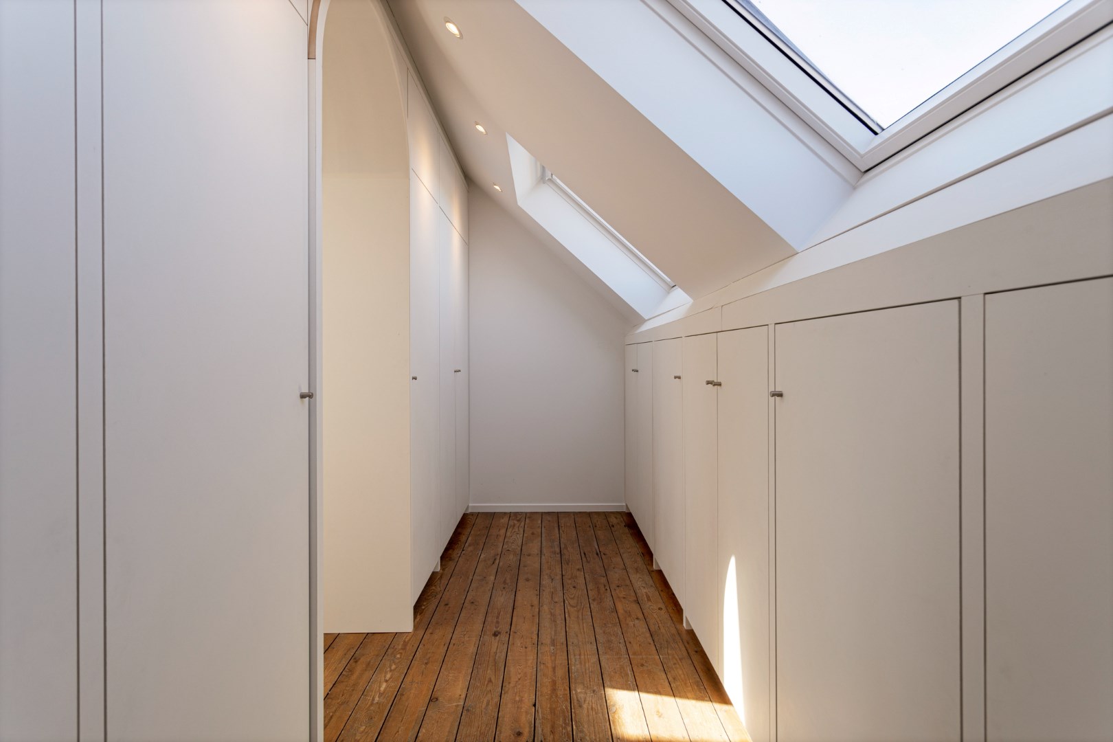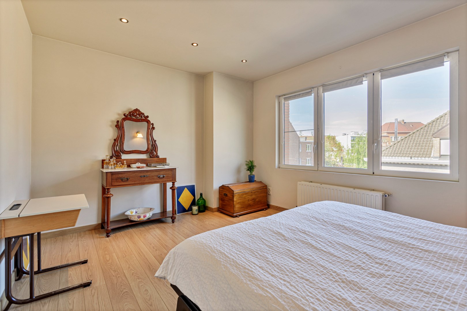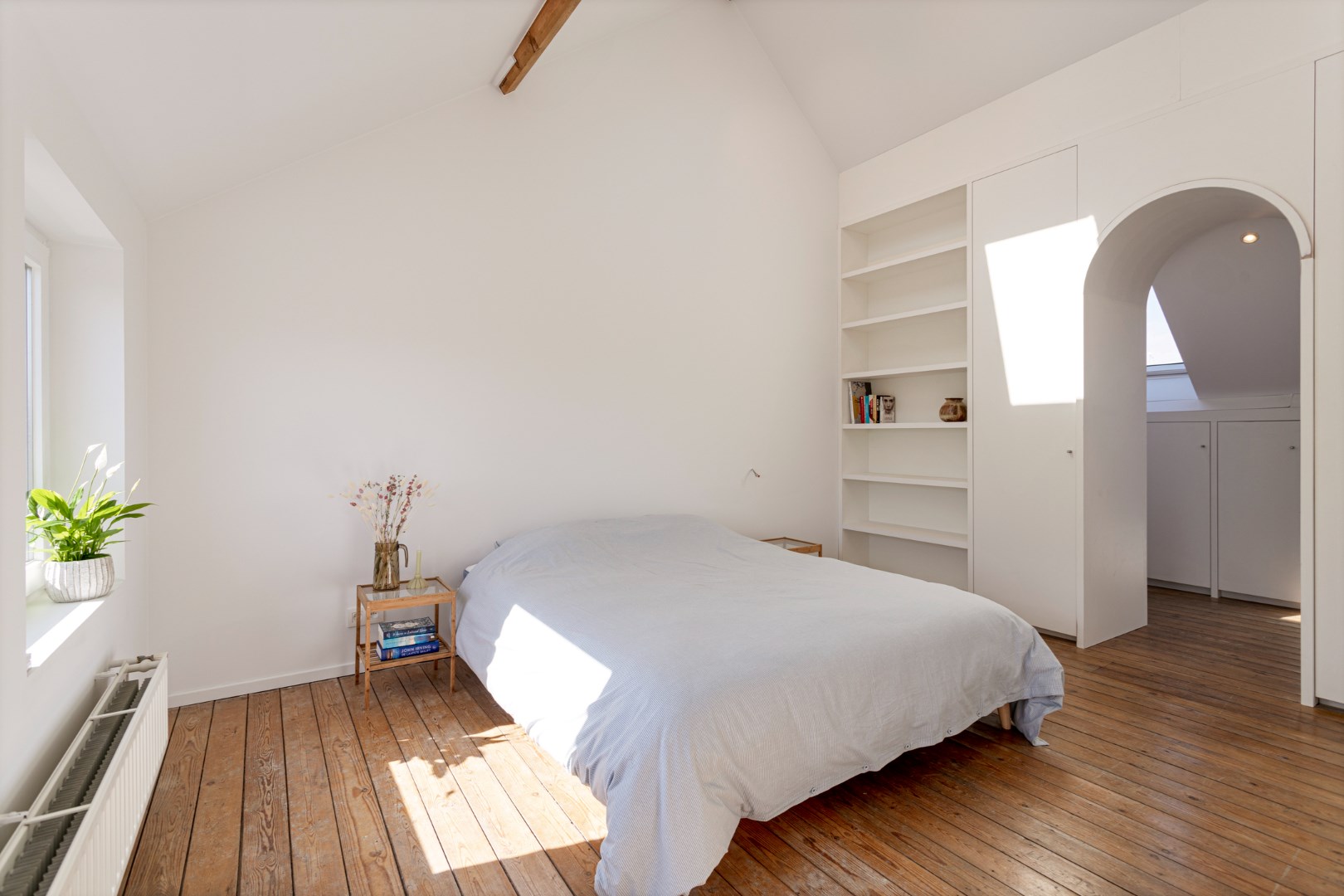 Via een vaste trap bereiken we de zolderverdieping die pas is gerenoveerd als een prachtige master bedroom met dressing.