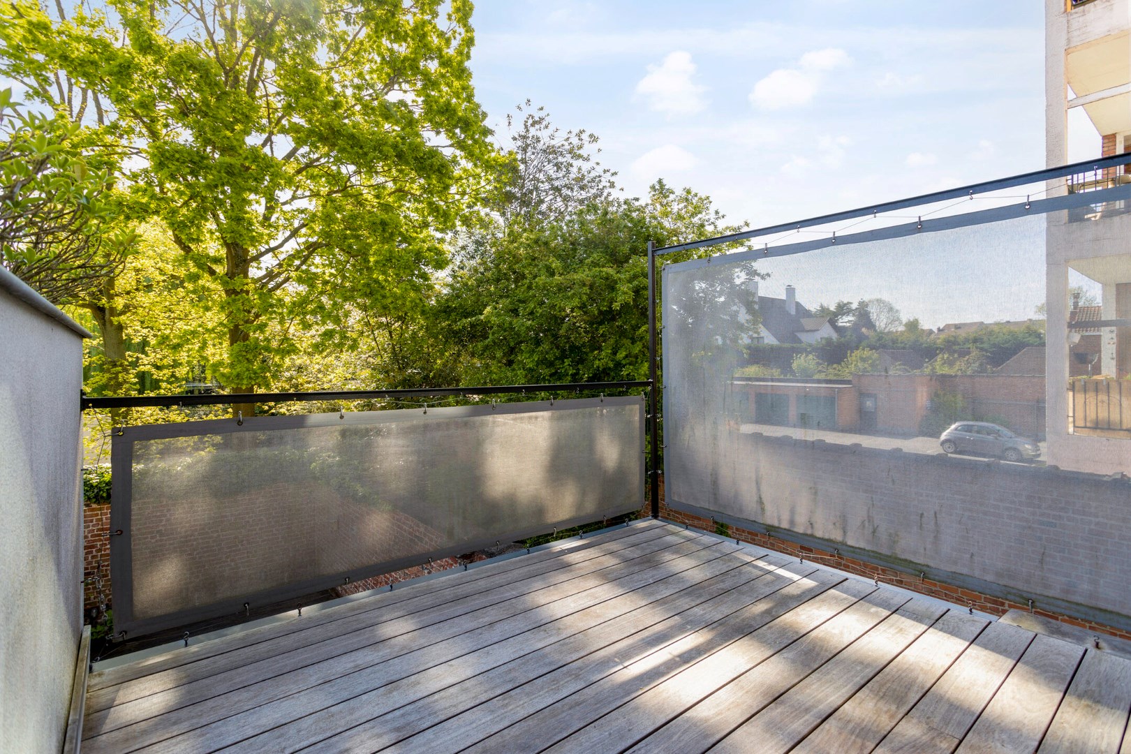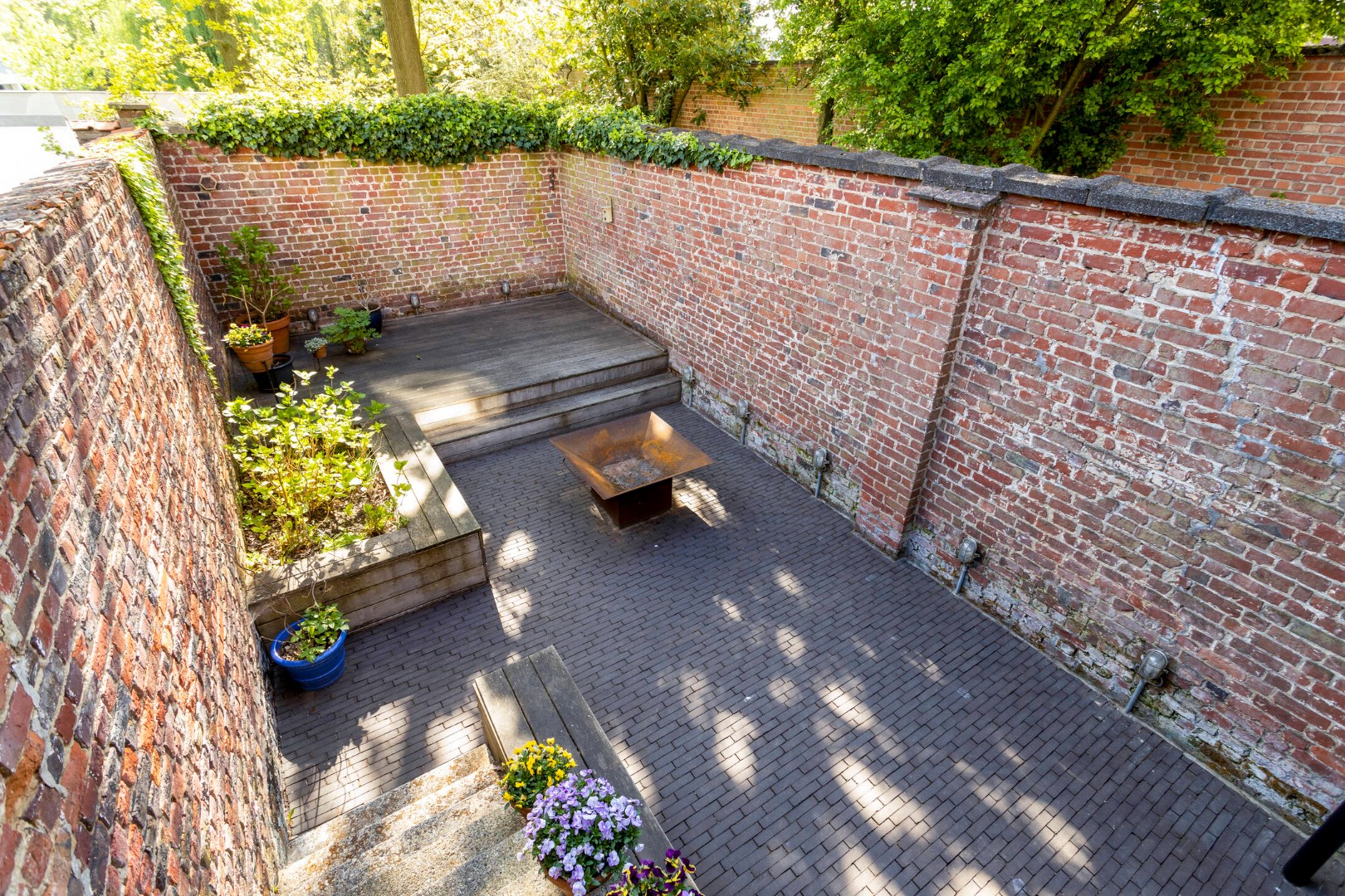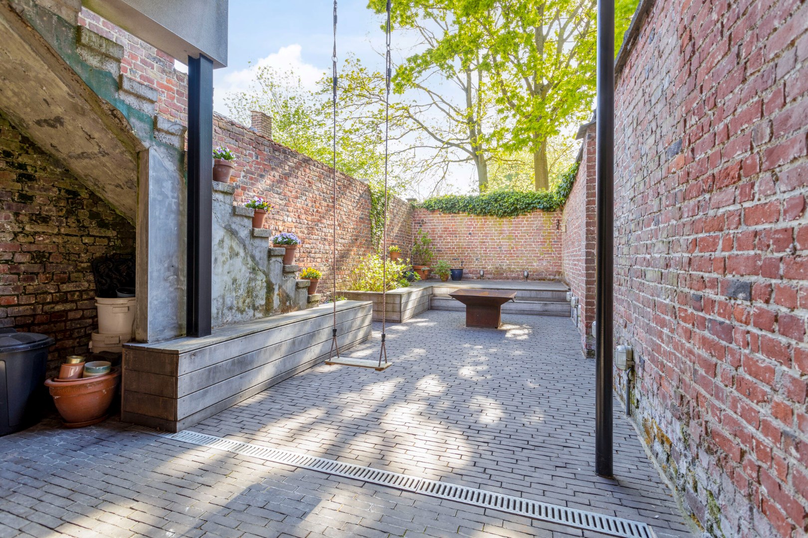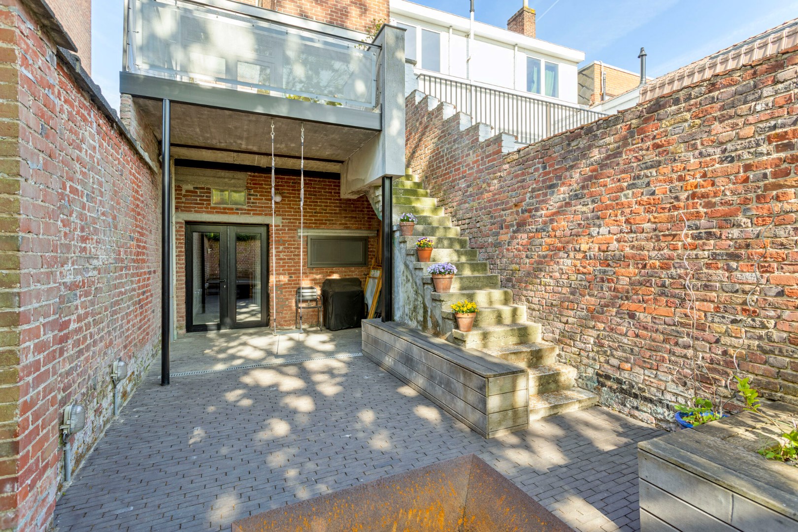 Het grote terras is bereikbaar via de keuken. Een zalige plek om te genieten bij de eerste zonnestraal of tijdens een warme zomeravond, en dit in alle rust en privacy. Via een vaste trap kunnen we naar de toffe stadstuin.