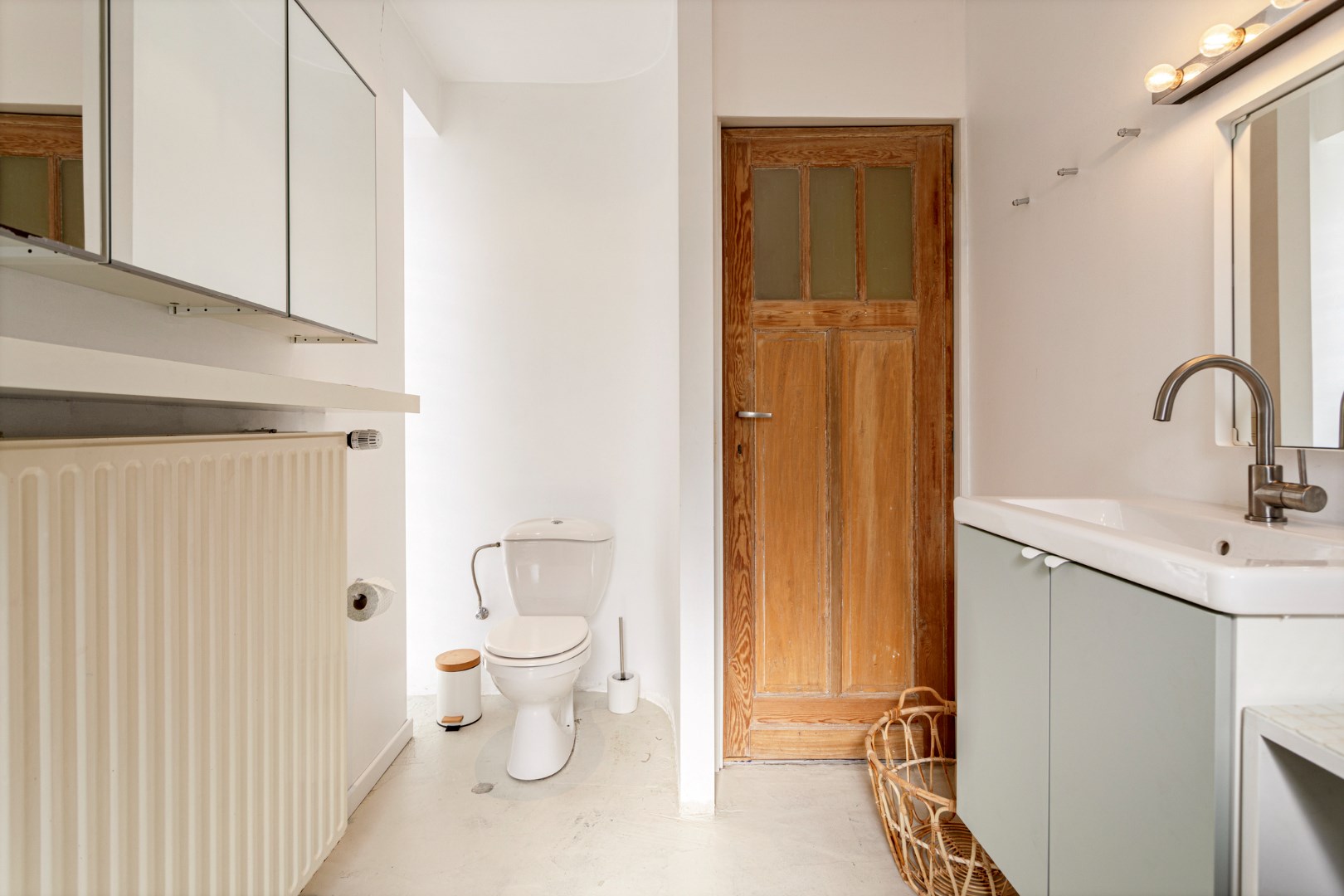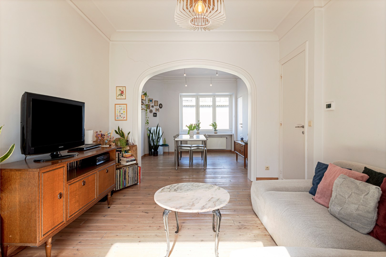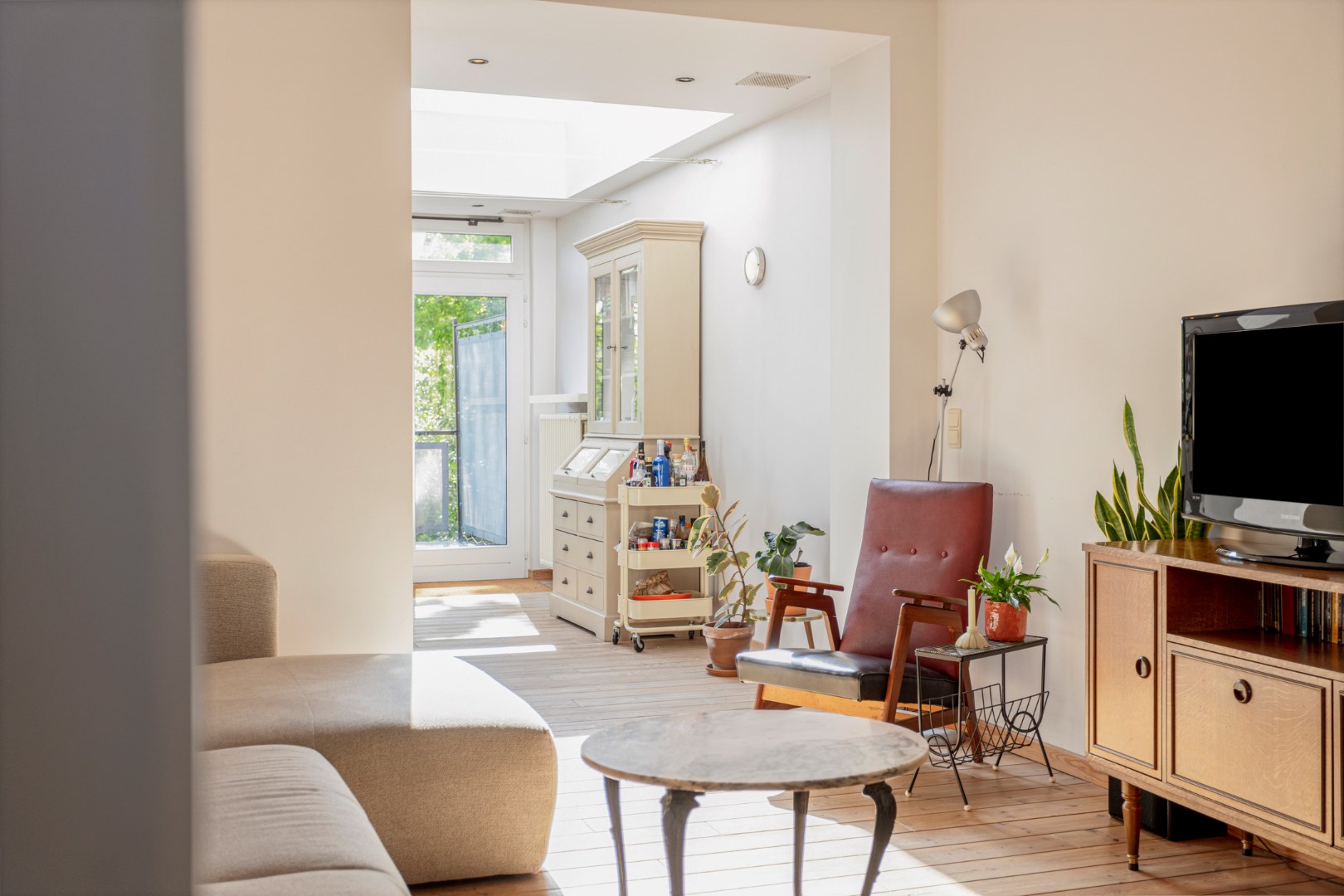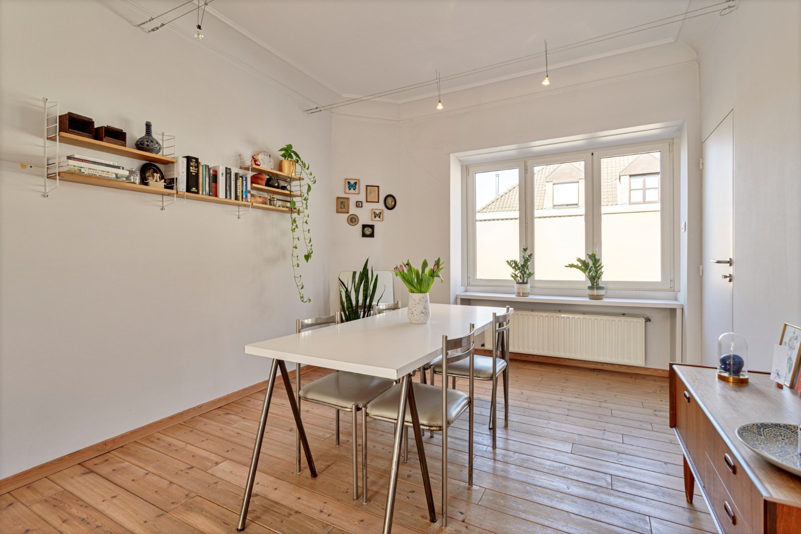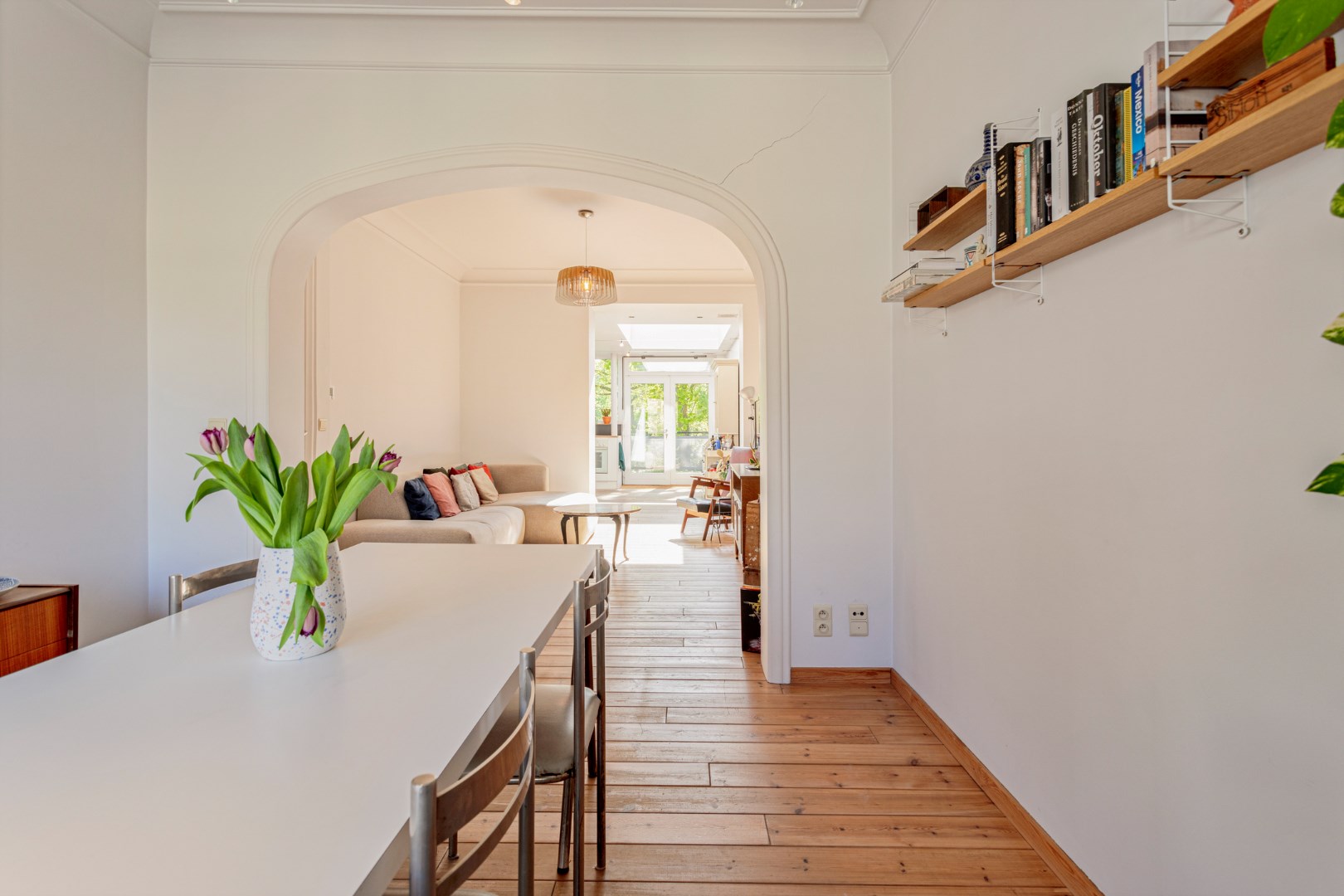 Op de eerste verdieping komen we binnen in de living. De vele fraaie originele elementen, de plankenvloer en de grote ramen zorgen ervoor dat dit een zalige ruimte is om te vertoeven. De open keuken is eenvoudig, maar gebruiksklaar en trekt dezelfde rustige sfeer door. Op deze verdieping vinden we nog een apart toilet en een handige ingewerkte bureaukast.