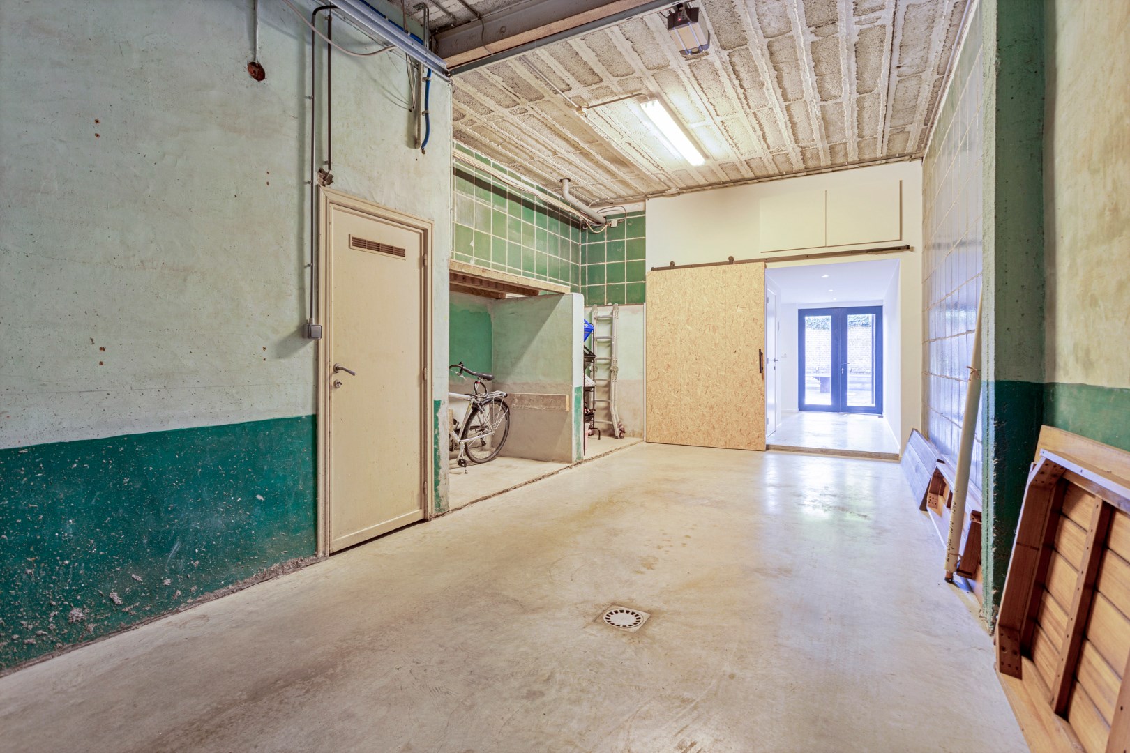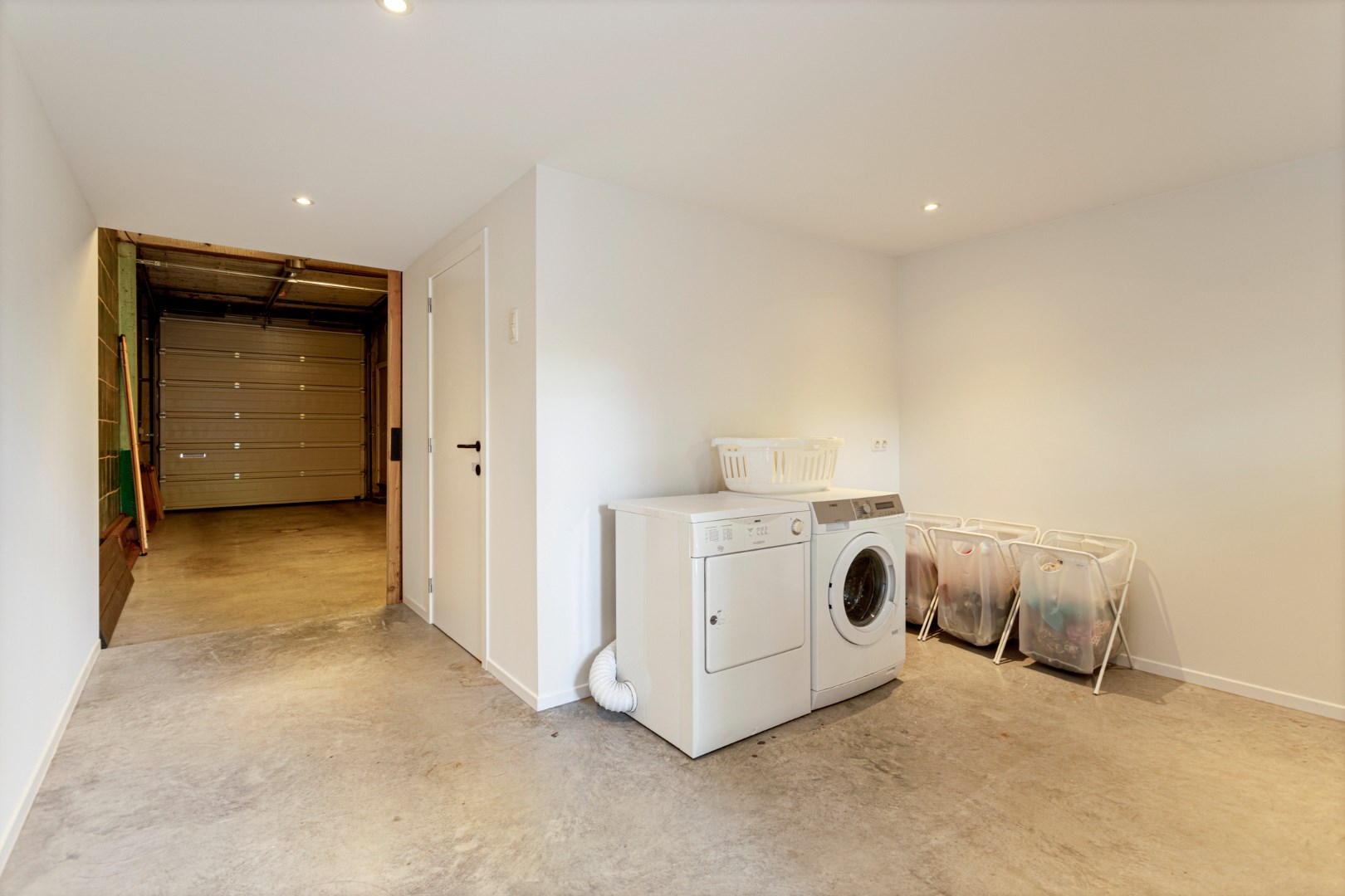 Op de benedenverdieping vinden we de grote garage (60 m²) met elektrische poort. Er is plaats genoeg voor een wagen en aansluitend is er een ruime wasplaats en berging.