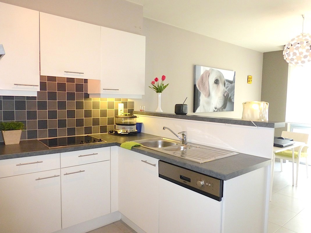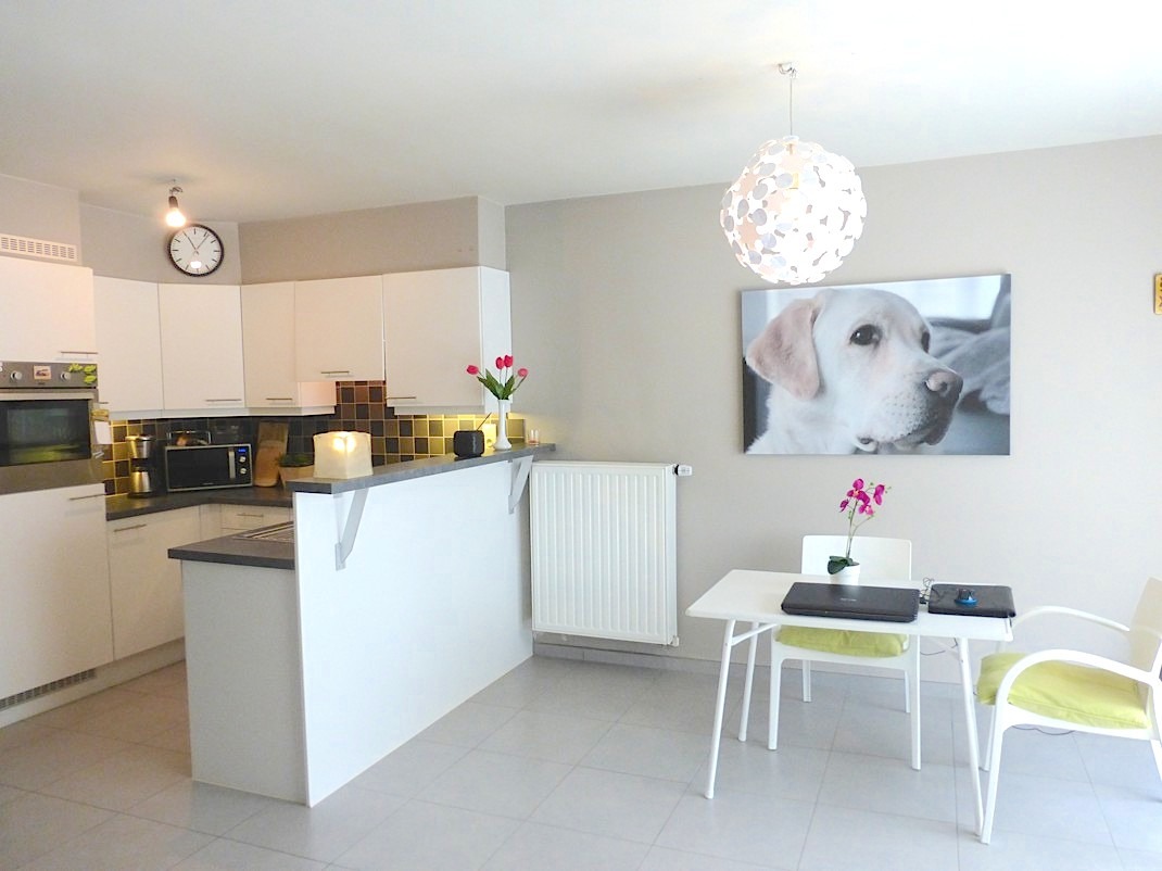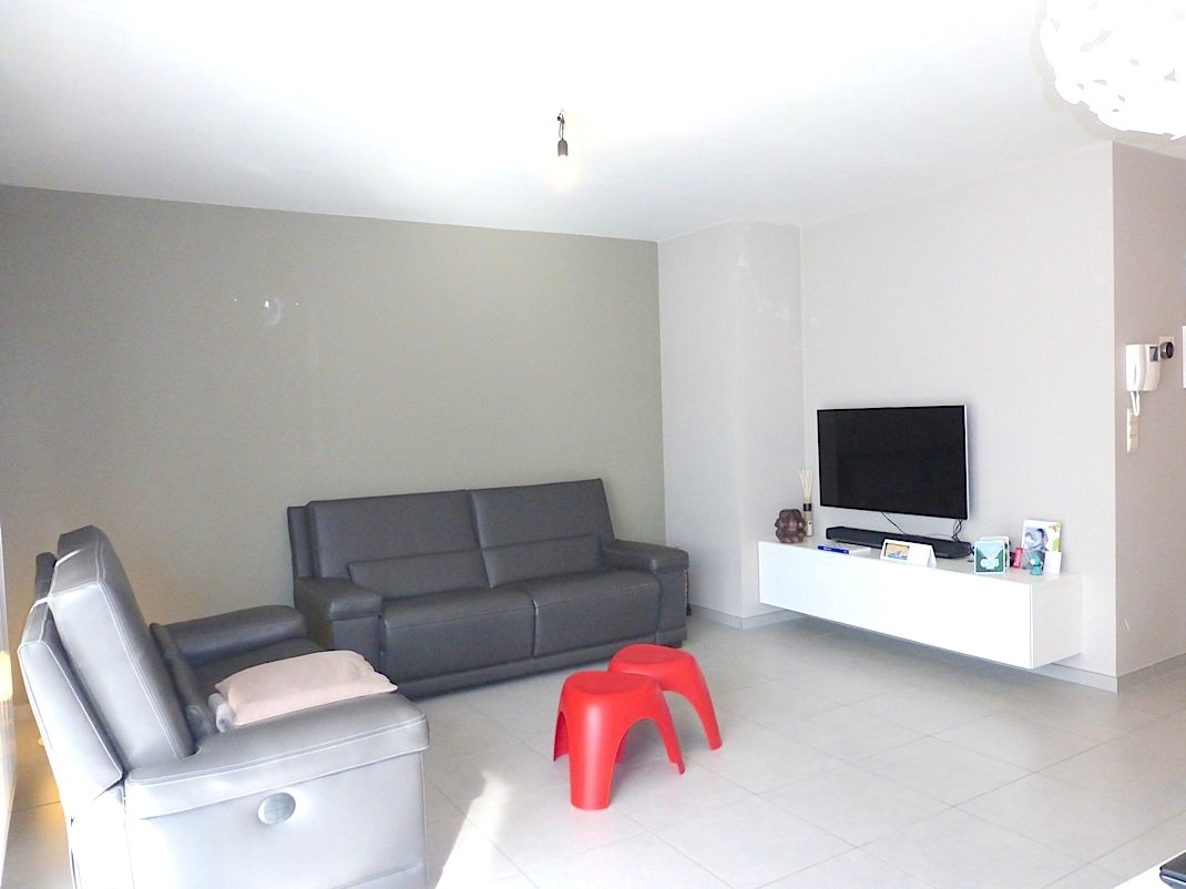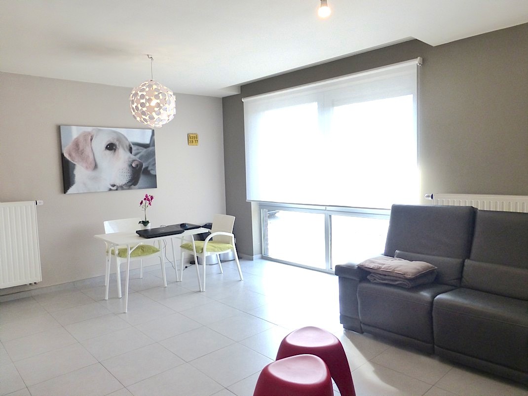 We komen de verzorgde residentie "Hofstede" binnen om verder te gaan naar de private inkomhal van het appartement. Er is een apart gastentoilet en plaats voor een vestiaire. De living is lichtrijk door het grote raam, waar door de goede oriëntatie de zon binnen komt piepen. De open keuken, die voorzien is van alle comfort, zorgt voor een leuk contact met de leefruimte.