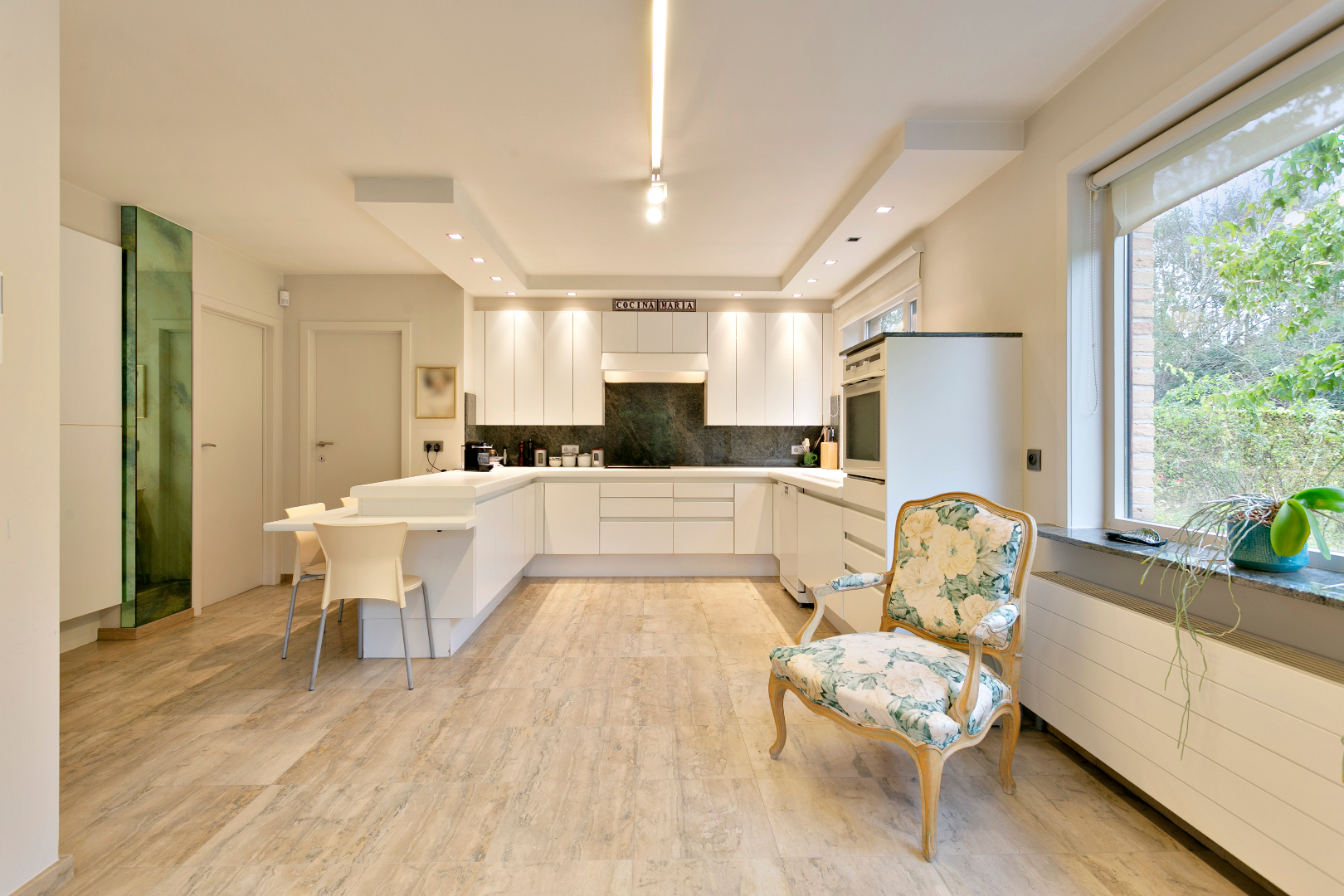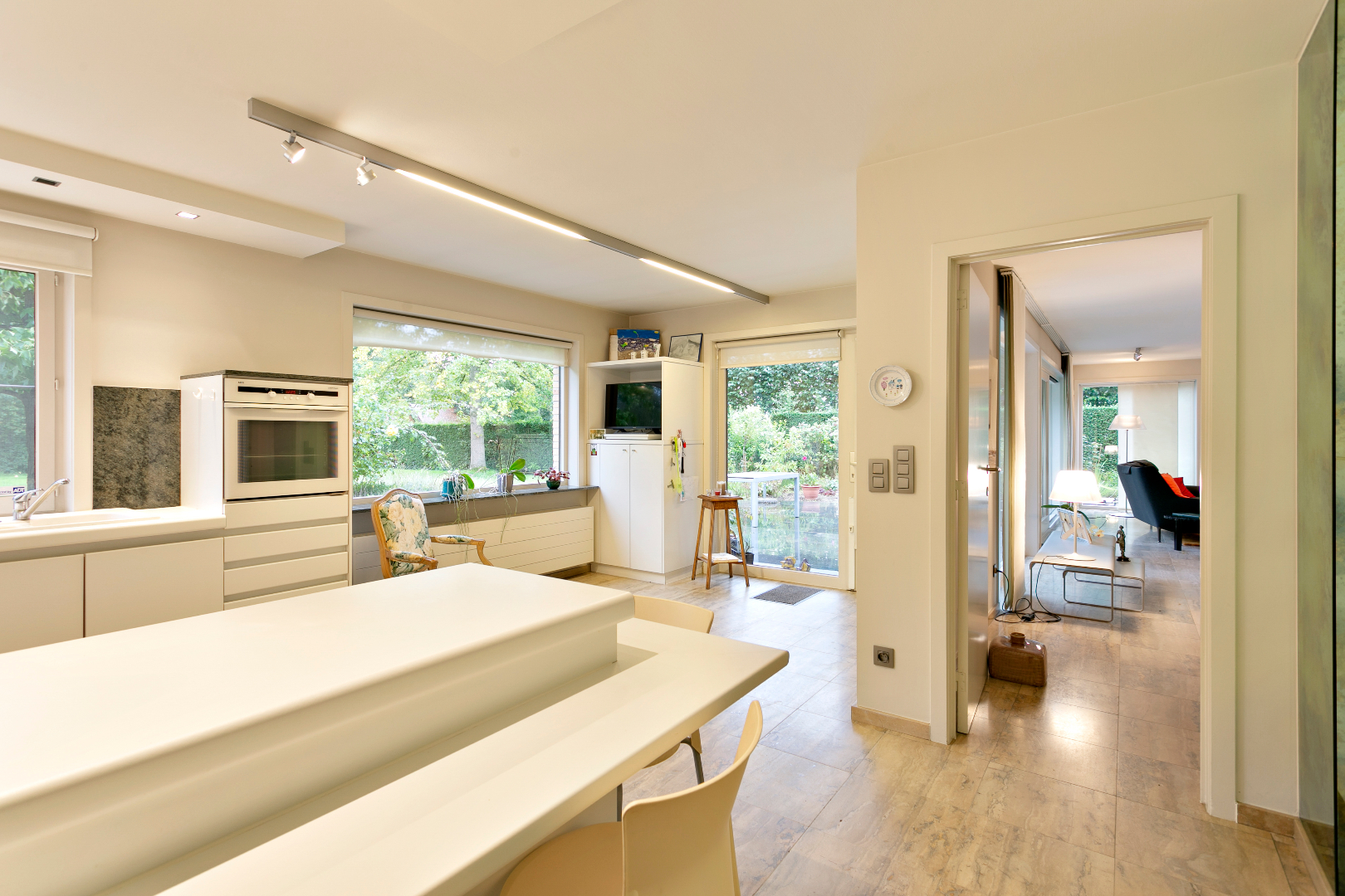 Naast de leefruimte bevindt zich de keuken. Deze is ruim genoeg voor een ontbijttafel. Tijdens het koken kunnen we ook aanschuiven aan het gezellige eiland om bij te praten. Aangrenzend zijn er een handige berging en de grote dubbele garage waar we ook een tweede toilet terugvinden.