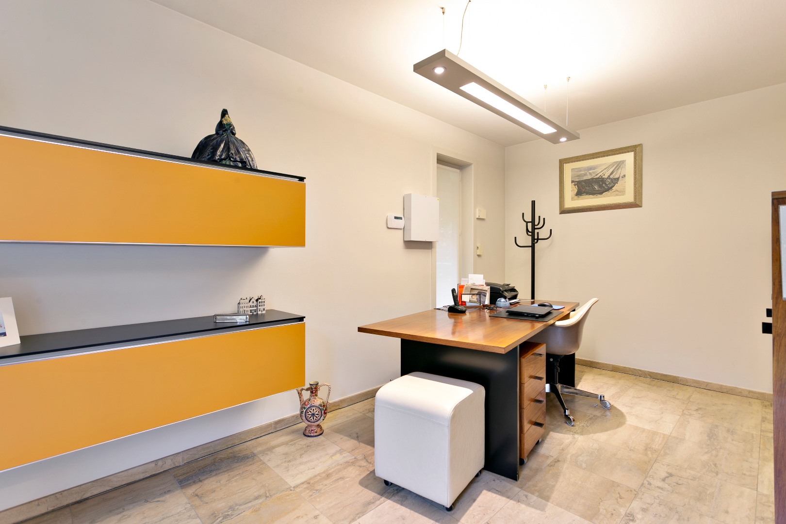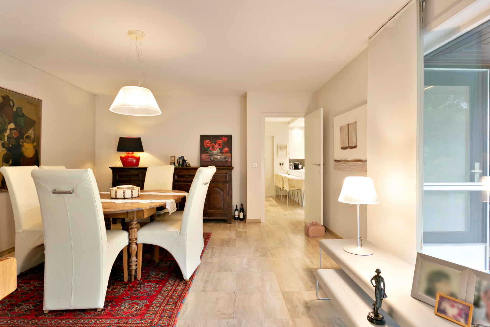 Via de grote voortuin komen we aan bij dit mooie eigendom, ‘De Cleyn Wolvinne’. De prachtige inkomhal is voorzien van een gastentoilet en een mooie trap naar de bovenverdieping. Door de glazen deur kunnen we reeds een blik werpen op de mooie leefruimte. Deze is opgedeeld in een leuke zithoek met houtcasette en het eetgedeelte. Door de vele ramen is het er zeer lichtrijk. We hebben er ook toegang tot de mooie tuin. Vanuit de zitruimte kunnen we ook naar het aanpalend, open bureau.