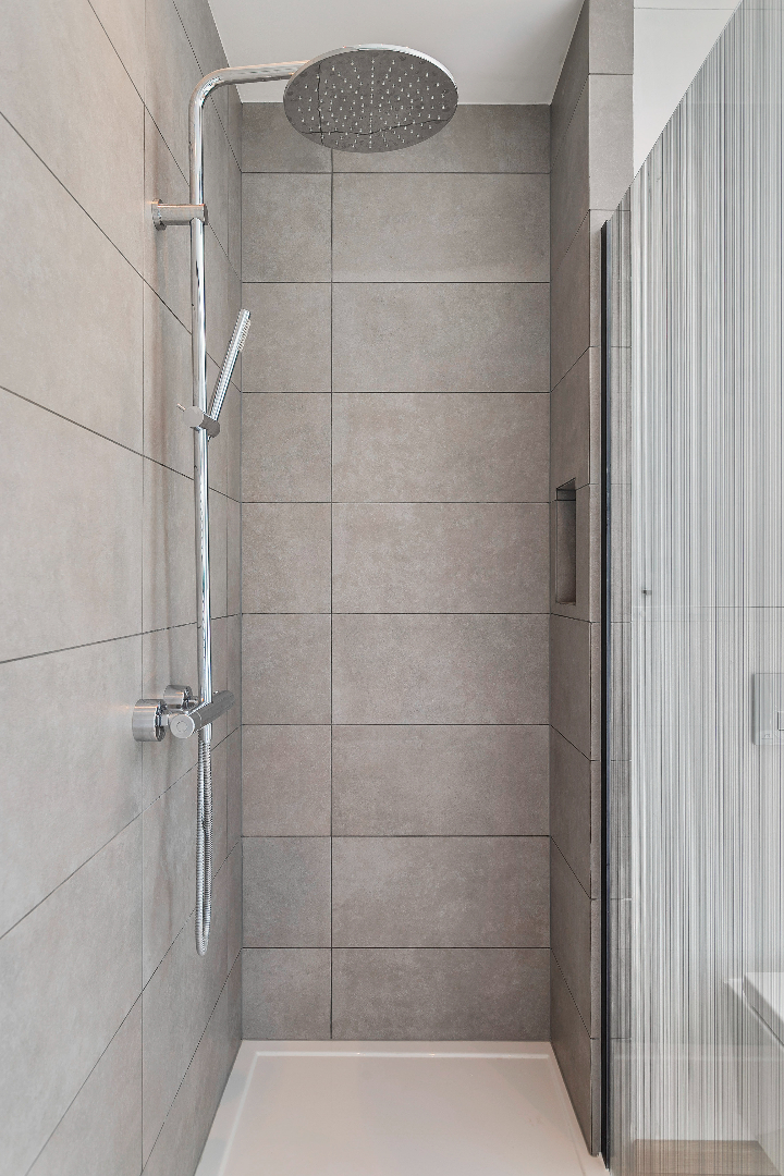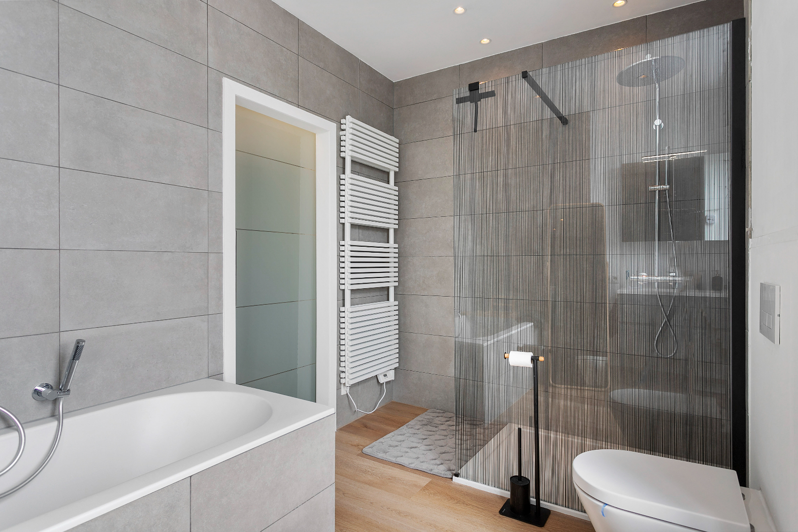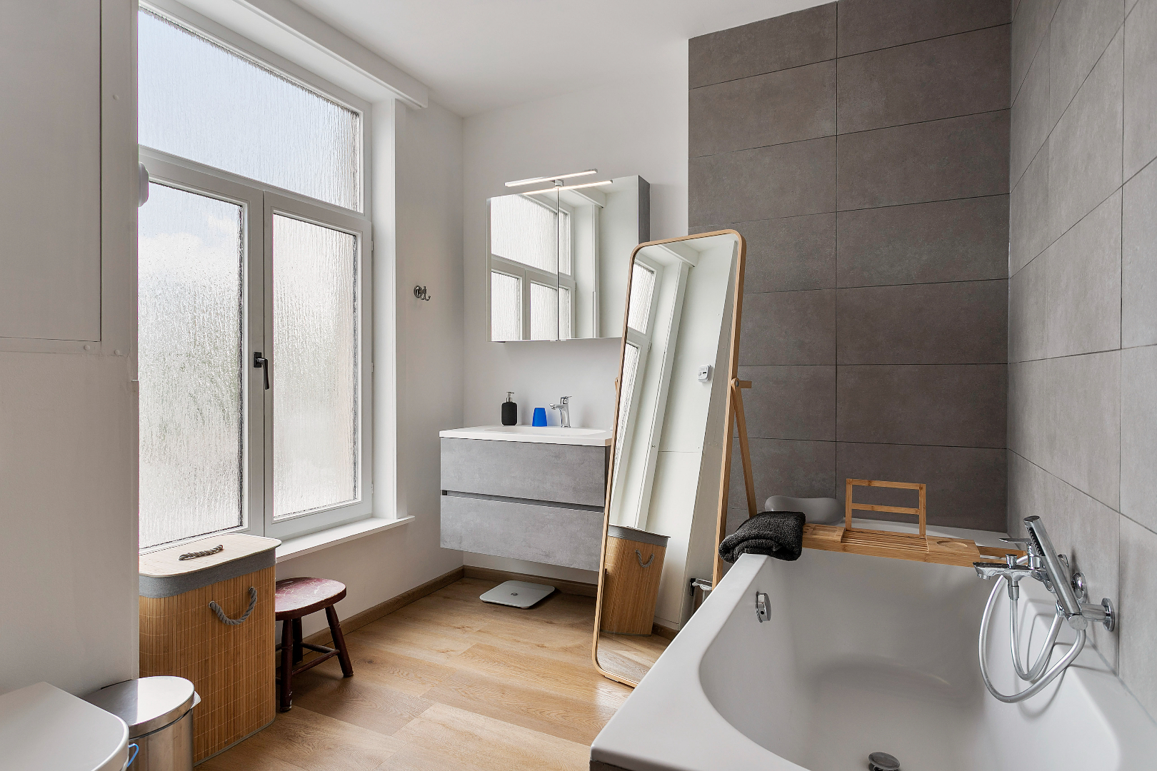 De eerste verdieping beschikt over een ruime slaapkamer en een prachtige vernieuwde badkamer met bad, inloopdouche, lavabomeubel en toilet.