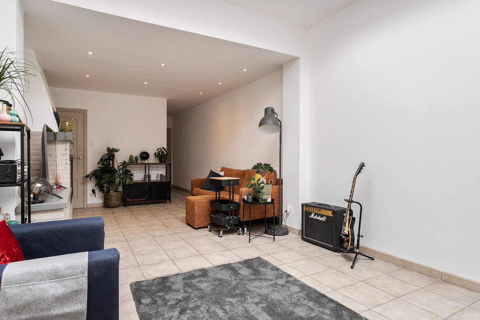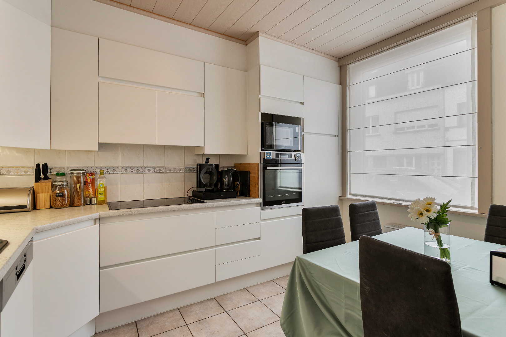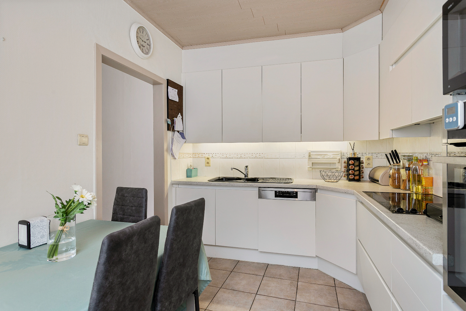 We betreden de woning via het halletje en komen meteen in de zeer gezellige leefruimte. Aangrenzend is er de gerieflijke keuken met veel kastruimte en plaats voor een ontbijttafel.