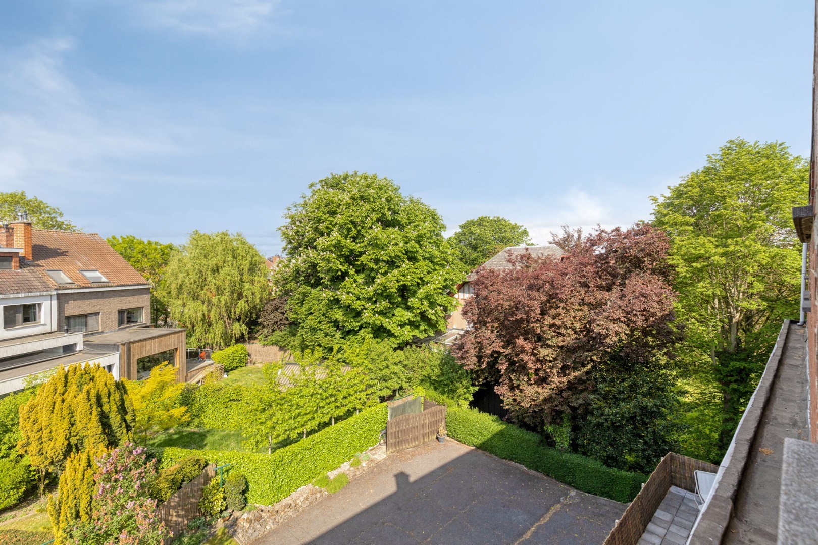 We rijden de groene Vredelaan met de prachtige bomen binnen en kunnen parkeren op de privéparking of in de garage.