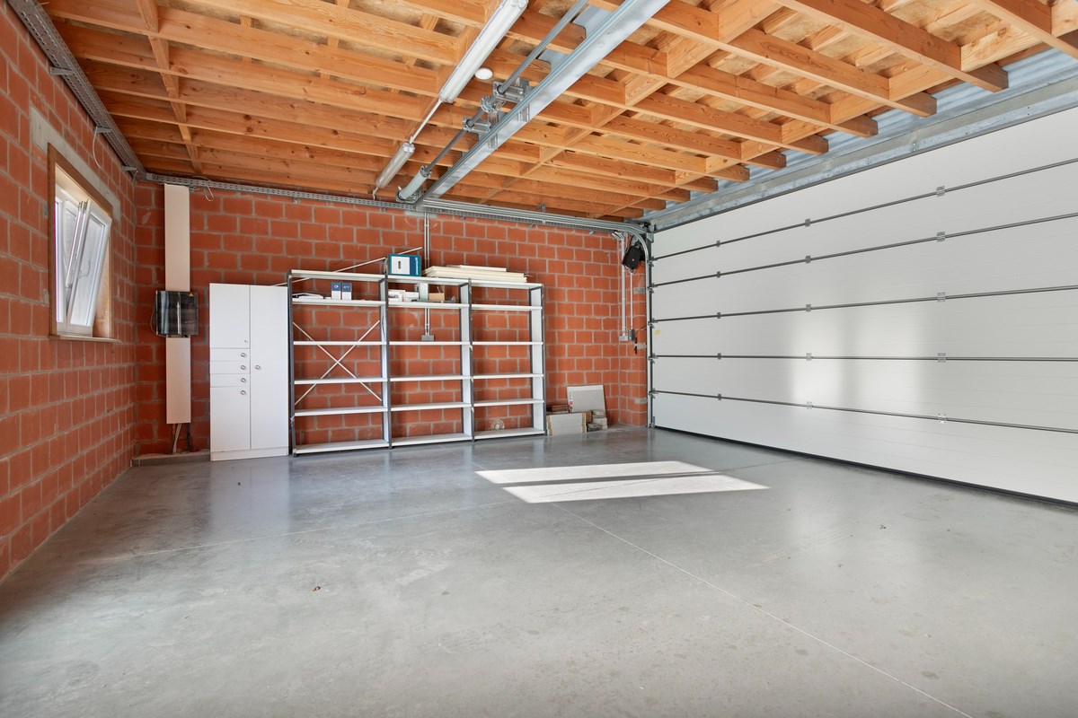 Via een achterliggende garageweg is er toegang tot de nieuw gebouwde dubbele garage, die met een hoge industriele automatische sectionaalpoort is afgesloten. Hoge wagens kunnen hier dus ook perfect binnen gestald worden.