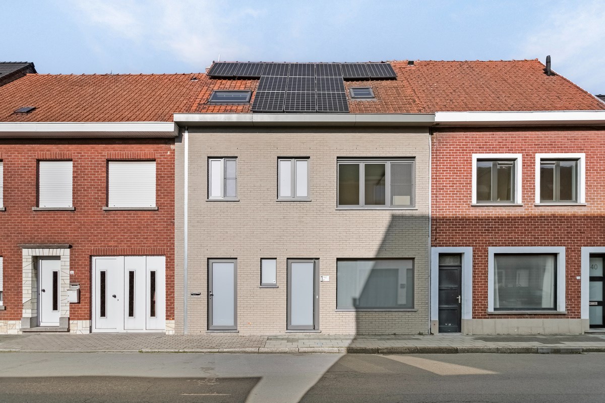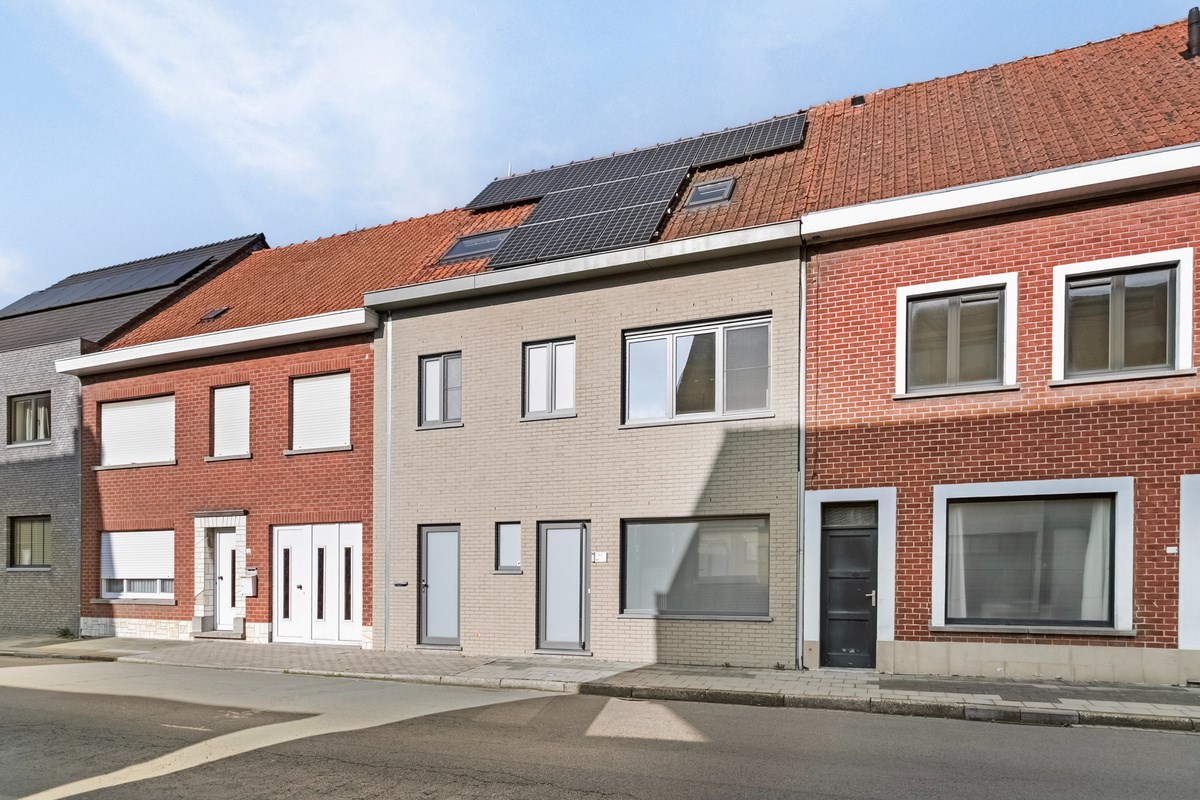 De voorgevel verraadt al dat deze woning volledig gerenoveerd werd en deels herbouwd werd. Er zijn 2 toegangsdeuren en een dak vol zonnepanelen zichtbaar.