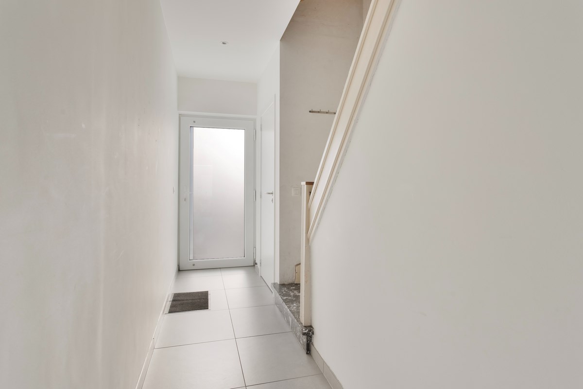 Via de centrale inkomhal met apart gastentoilet komen we rechtstreeks in de lichtrijke leefruimte met open keuken en zicht op de diepe en brede tuin. Vanuit deze ruimte is er nog toegang tot de kelder en eveneens tot de was- en technische berging, die opnieuw uitkomt via een deur uitkomt op de straatzijde.