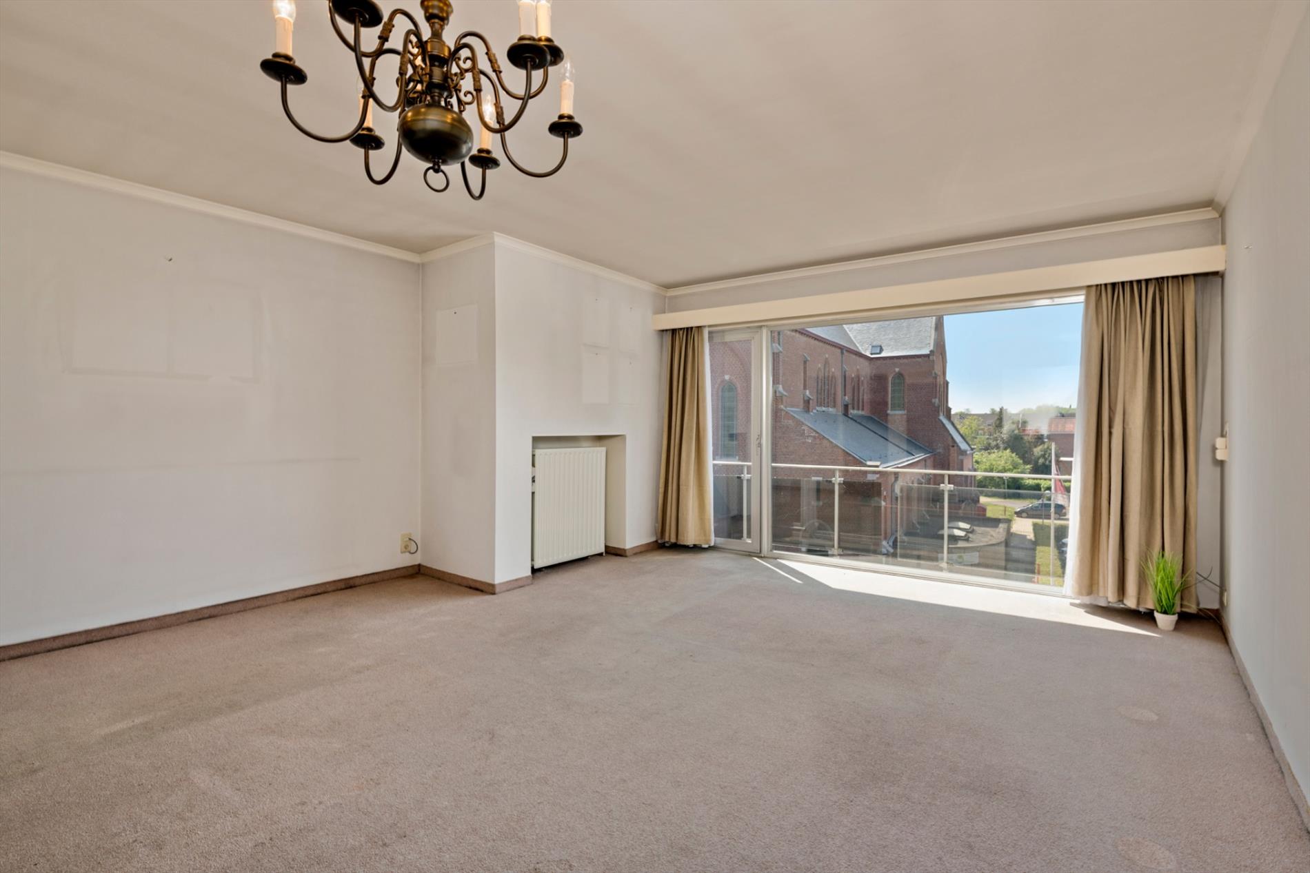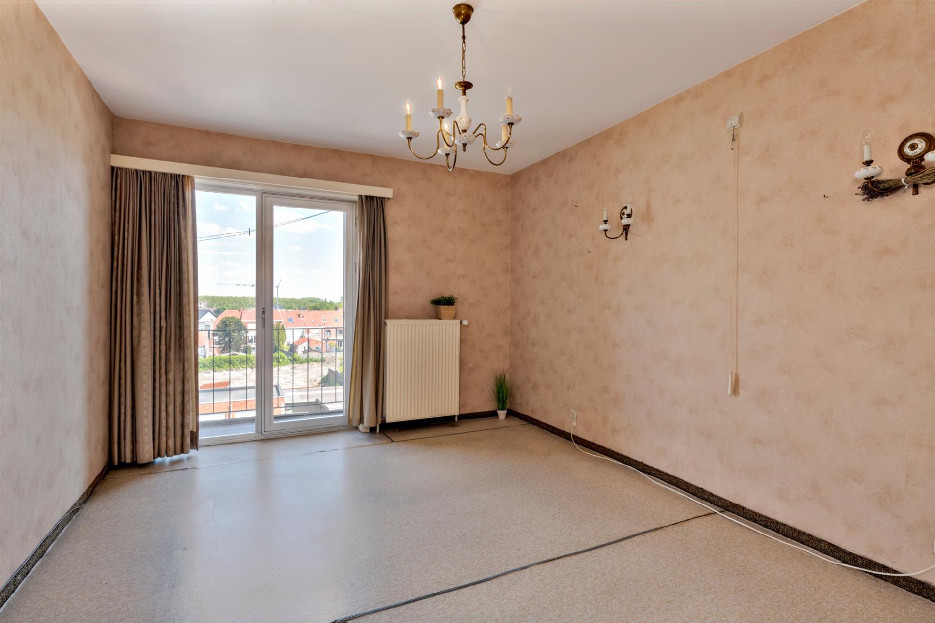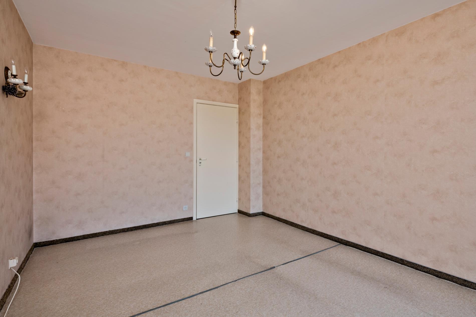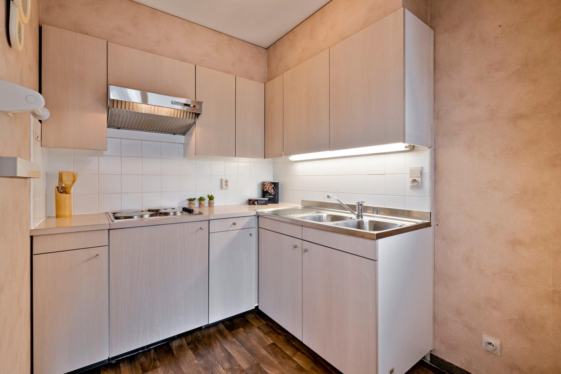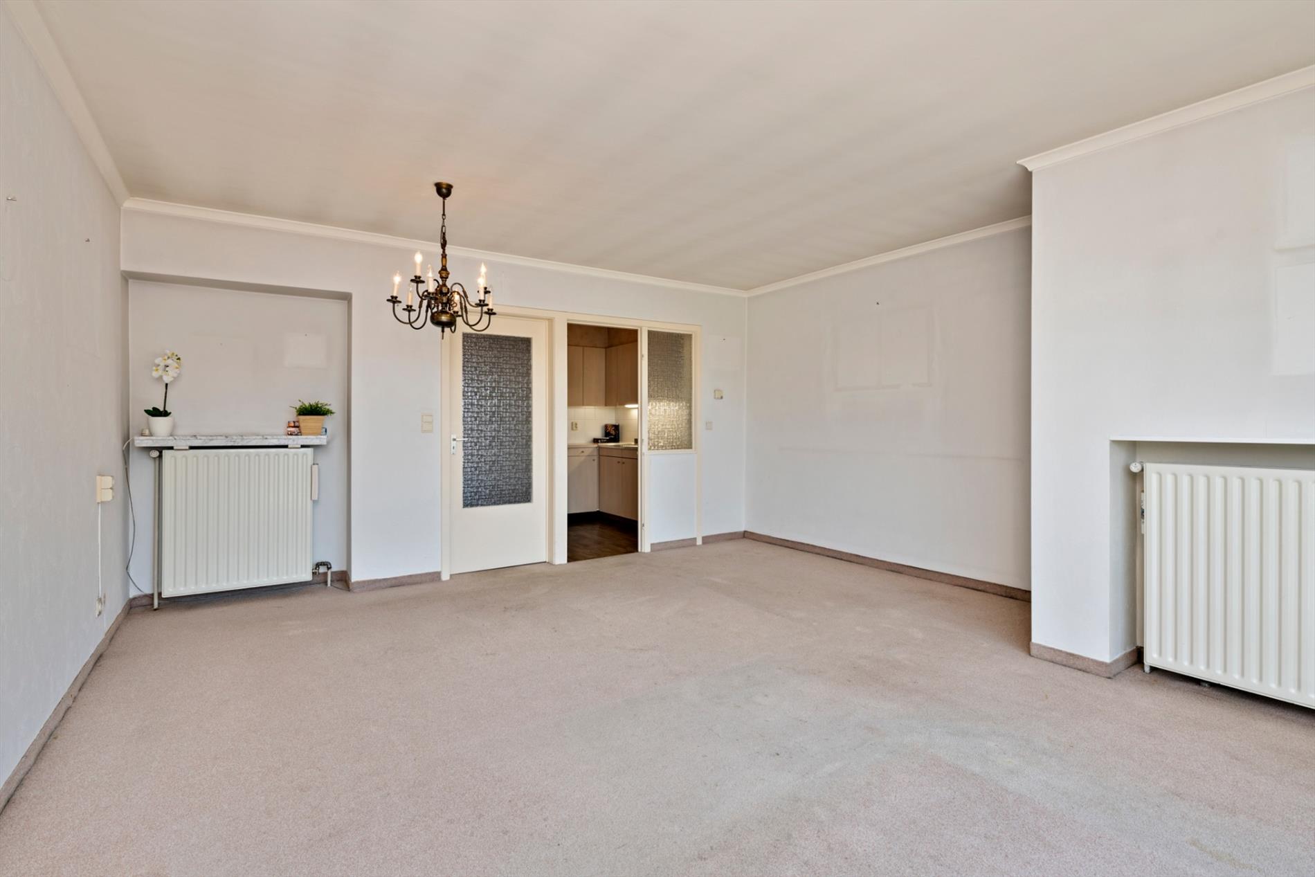 via de centrale inkomhal is aan de voorzijde de leefruimte met vernieuwd keukentje bereikbaar.