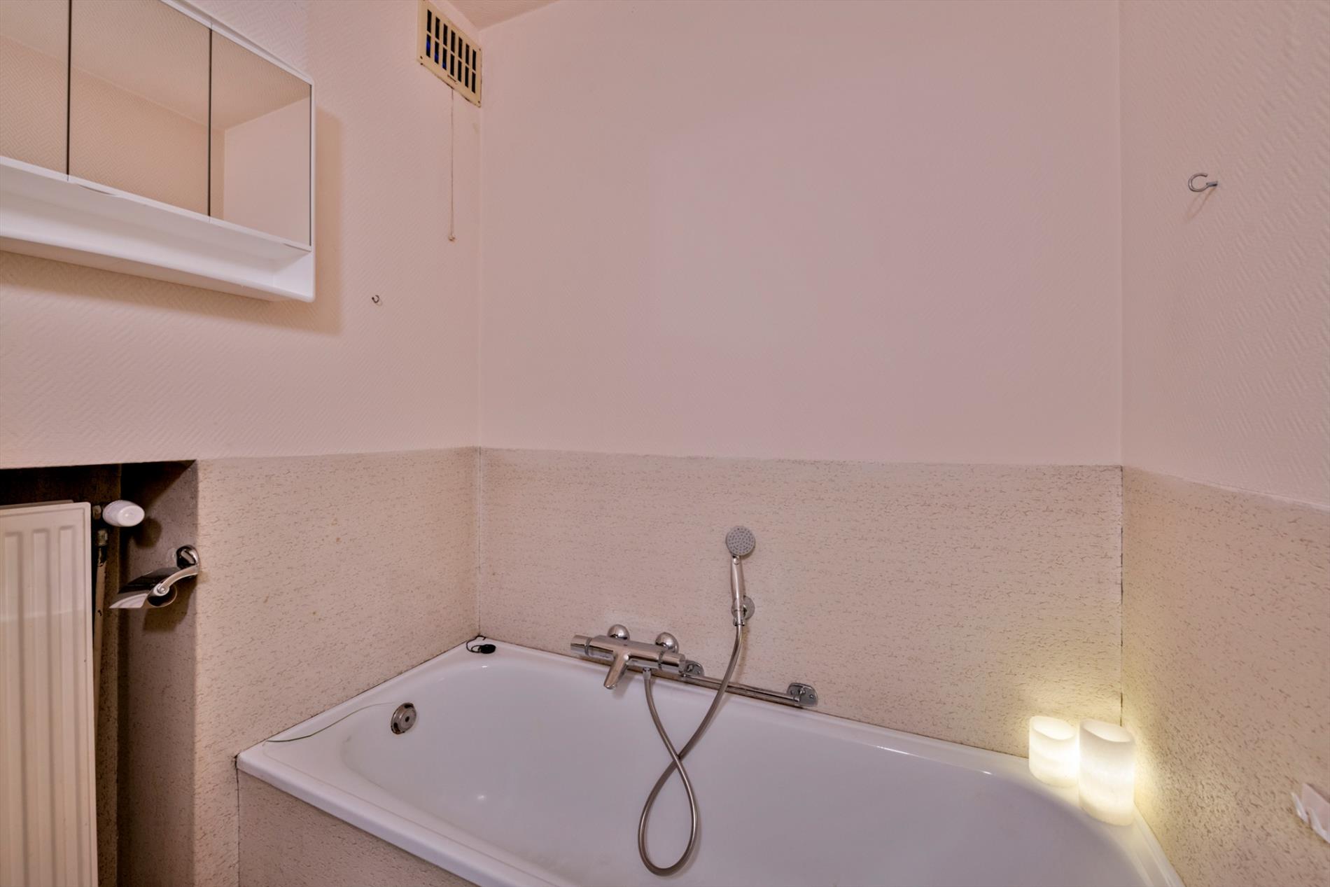 De badkamer is via de centrale hal bereikbaar en beschikt over een toilet, lavabo en bad.