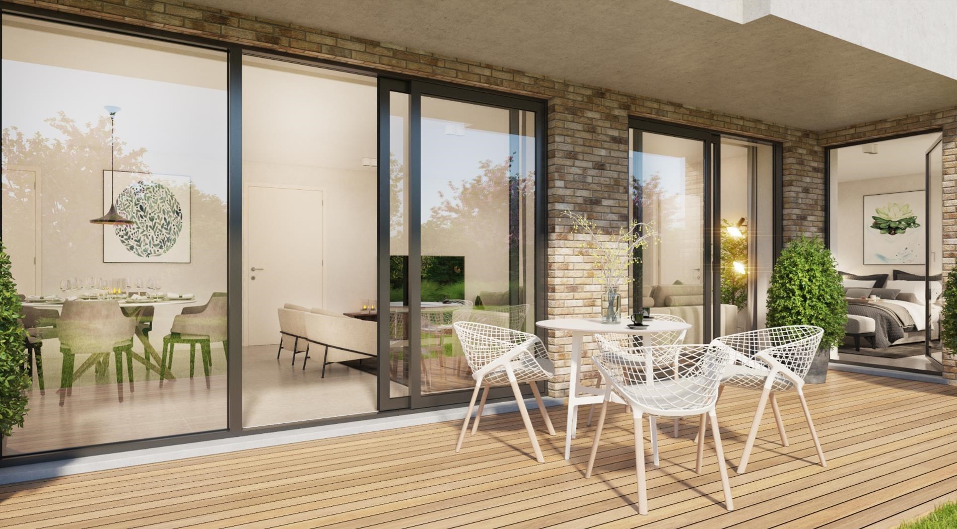 De prachtige architectuur van de buitenkant van deze residentie is ook doorgetrokken naar de binnenzijde van het appartement. Het appartement is heel lichtrijk en bevindt zich aan de straatkant. Vanaf het terras heeft u een goed zicht op wat zich in het centrum van Lauwe afspeelt. Doordat het terras helemaal ingesloten is, heeft u heel veel privacy.
