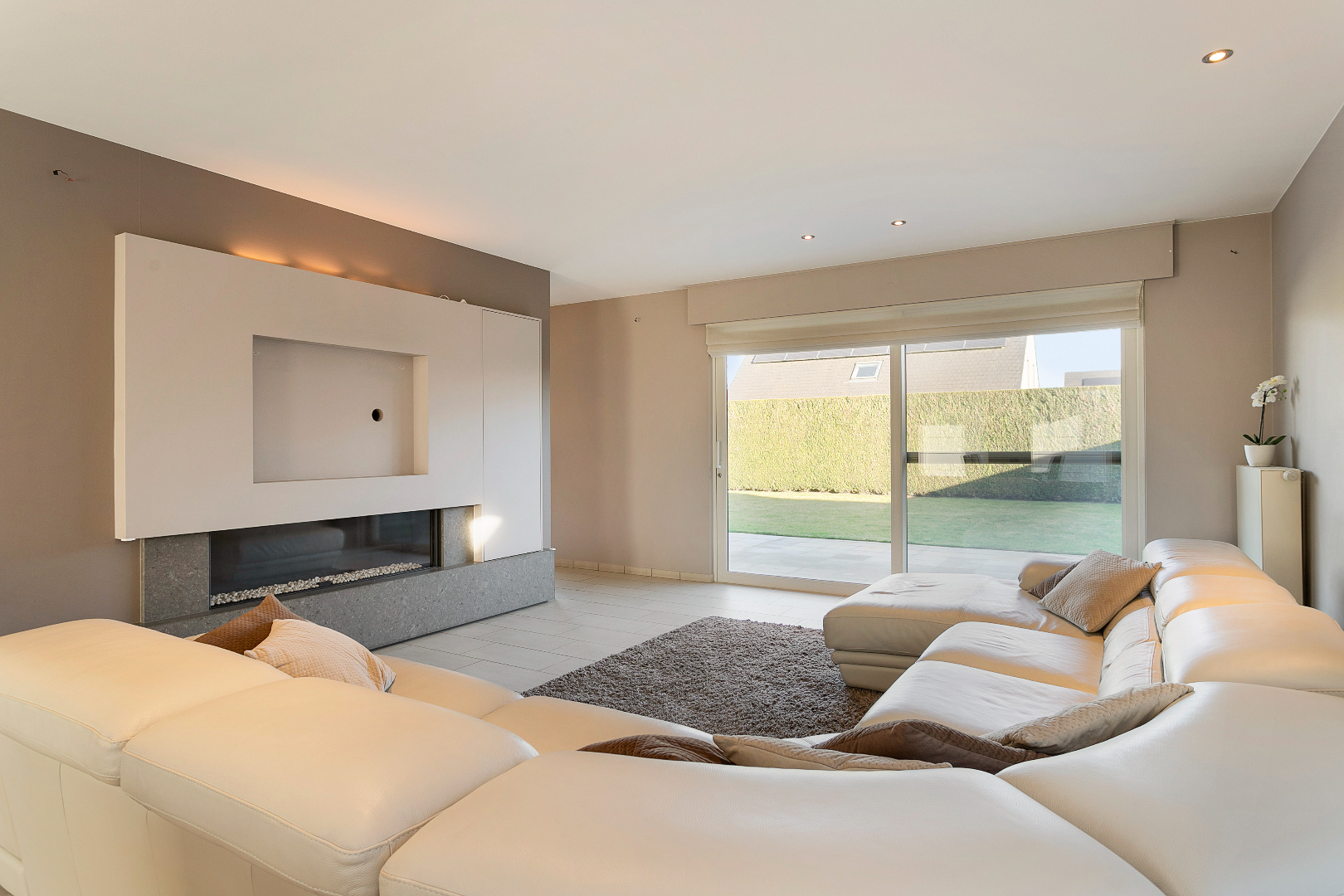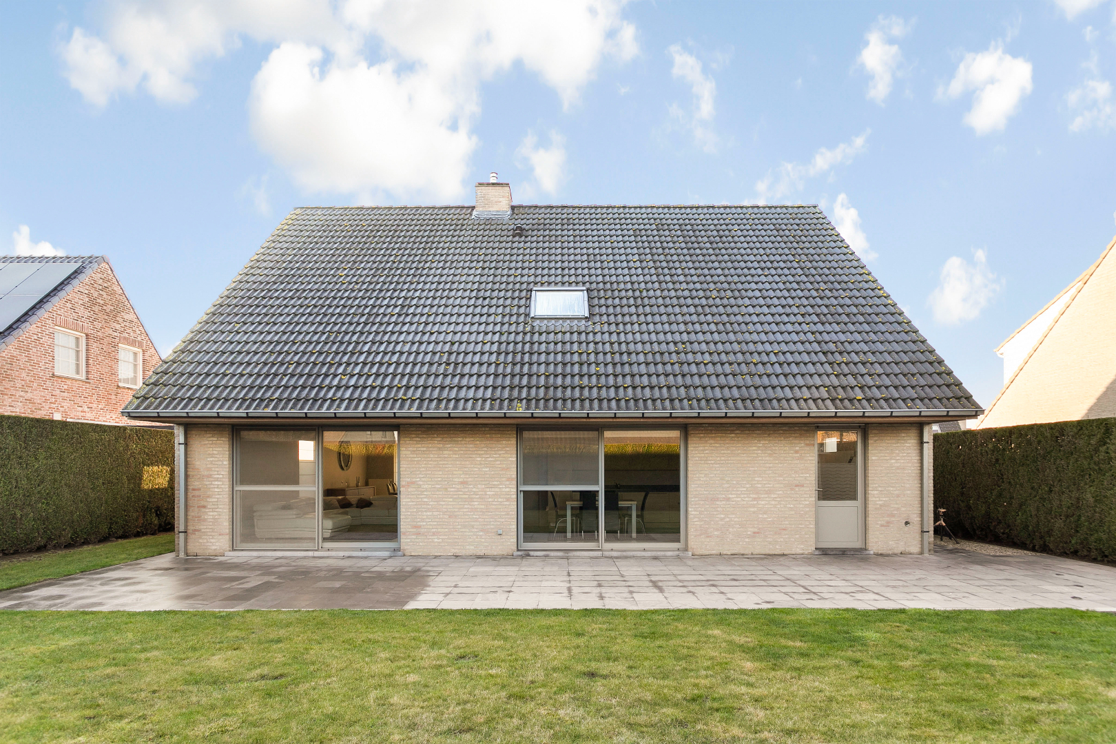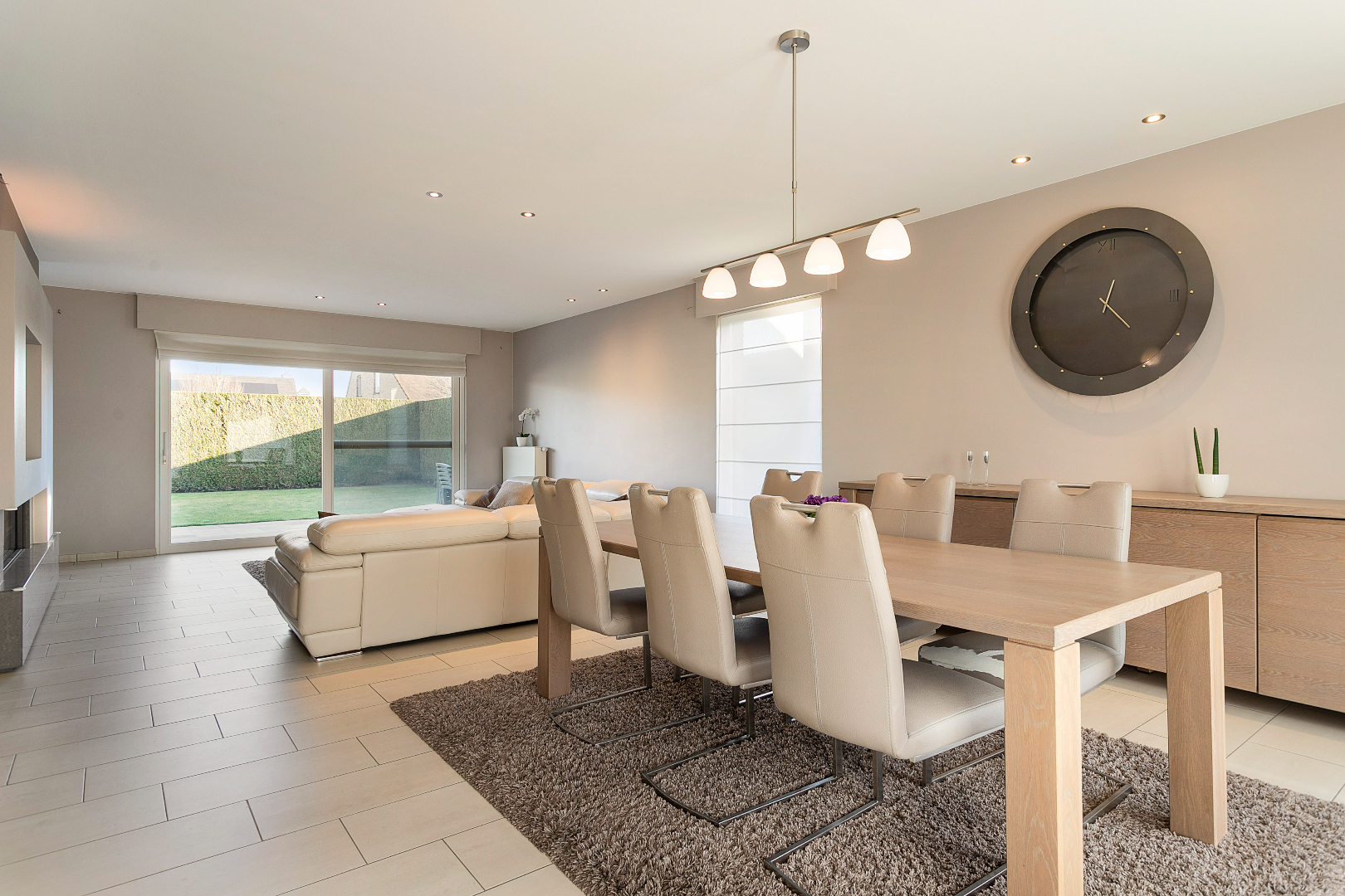 Op het einde van een doodlopende straat in een residentiële buurt vinden we deze prachtige villa terug. Het eigendom bevindt zich op een boogscheut van de Leie én niet ver van het centrum van Lauwe. Meteen valt op dat de omgeving één en al rust uitstraalt. De onderhoudsvriendelijke tuin met dubbele oprit leidt ons naar de woning. In de inkomhal vinden we een apart gastentoilet. Bij het binnenkomen van de grote leefruimte is de vele lichtinval opvallend. De grote raampartijen geven ook een schitterend zicht op de tuin rondom. De gashaard zorgt voor een extra gezellige toets. De aanpalende keuken is heel groot en kijkt eveneens uit over de tuin. Naast de keuken is er een handige koele berging. Vanuit de keuken hebben we ook toegang tot de dubbele garage. Hier is ook nog ook berging/wasplaats met ruimte voor een wasmachine, droogkast, fietsen, …. Van hieruit kunnen we ook rechtstreeks naar de tuin.
