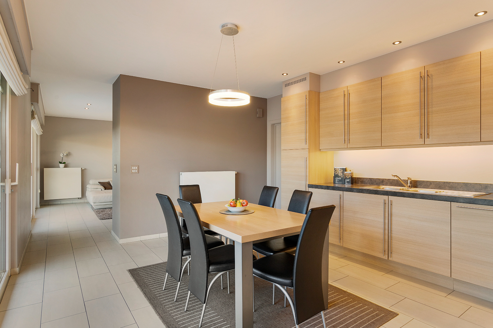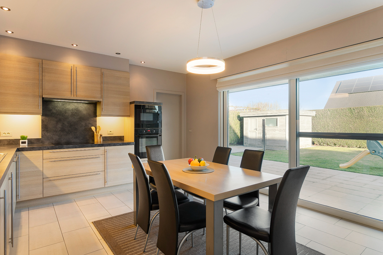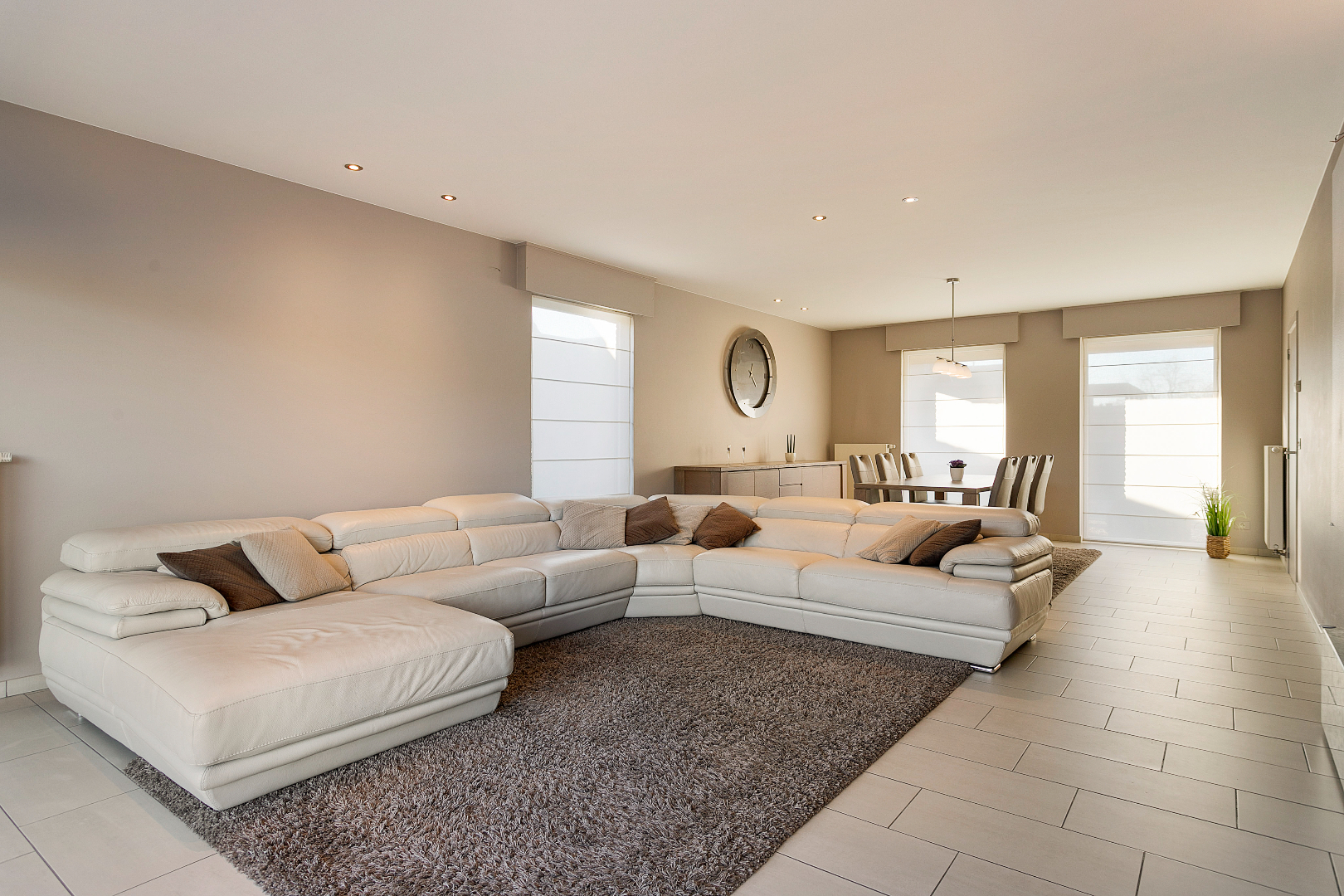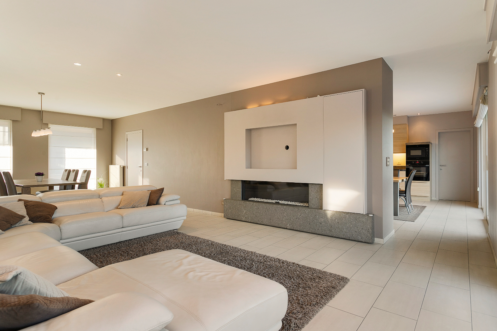 Op het einde van een doodlopende straat in een residentiële buurt vinden we deze prachtige villa terug. Het eigendom bevindt zich op een boogscheut van de Leie én niet ver van het centrum van Lauwe. Meteen valt op dat de omgeving één en al rust uitstraalt. De onderhoudsvriendelijke tuin met dubbele oprit leidt ons naar de woning. In de inkomhal vinden we een apart gastentoilet. Bij het binnenkomen van de grote leefruimte is de vele lichtinval opvallend. De grote raampartijen geven ook een schitterend zicht op de tuin rondom. De gashaard zorgt voor een extra gezellige toets. De aanpalende keuken is heel groot en kijkt eveneens uit over de tuin. Naast de keuken is er een handige koele berging. Vanuit de keuken hebben we ook toegang tot de dubbele garage. Hier is ook nog ook berging/wasplaats met ruimte voor een wasmachine, droogkast, fietsen, …. Van hieruit kunnen we ook rechtstreeks naar de tuin.