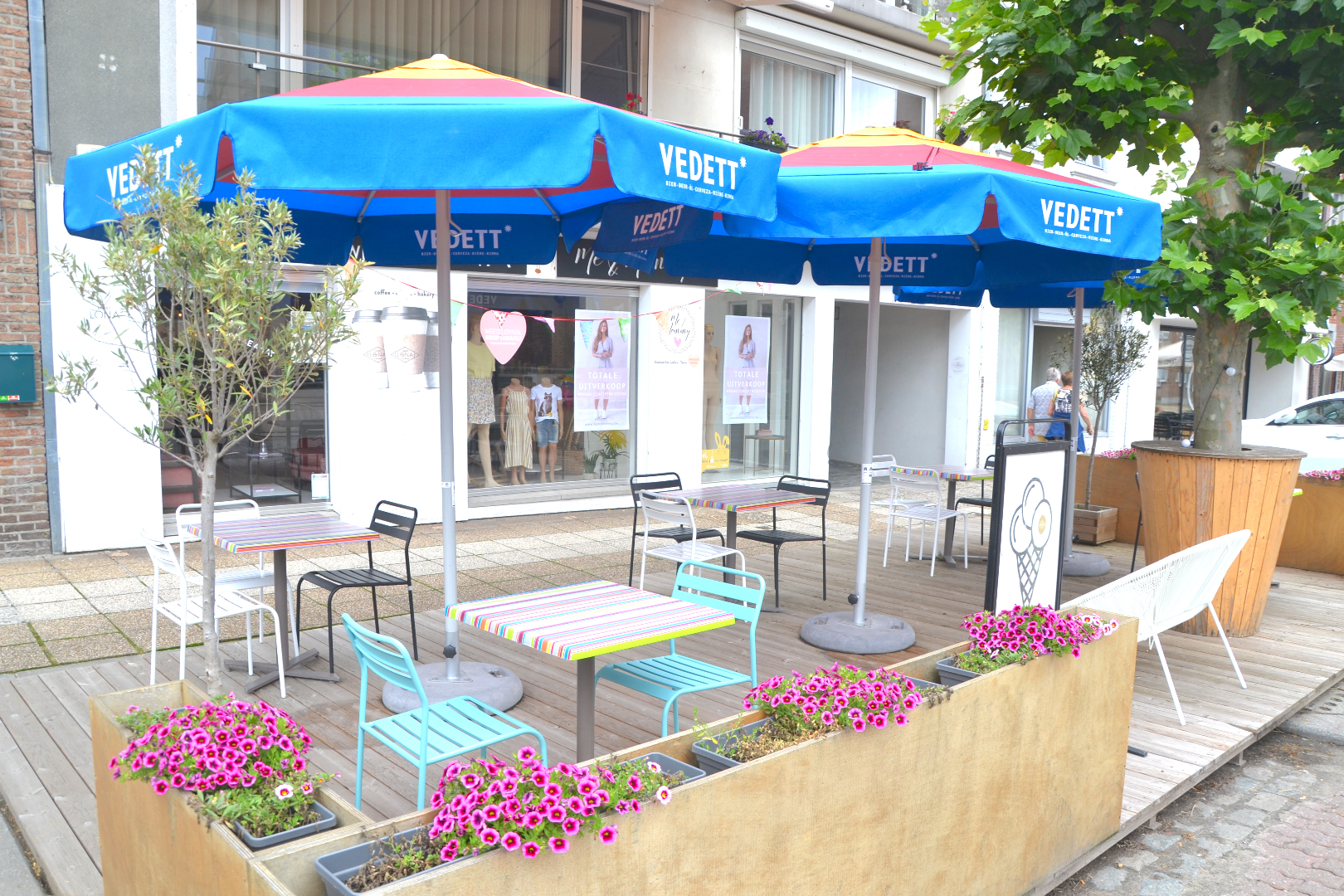 Er is toelating verkregen tot het plaatsen van een ruim terras vooraan het gebouw.