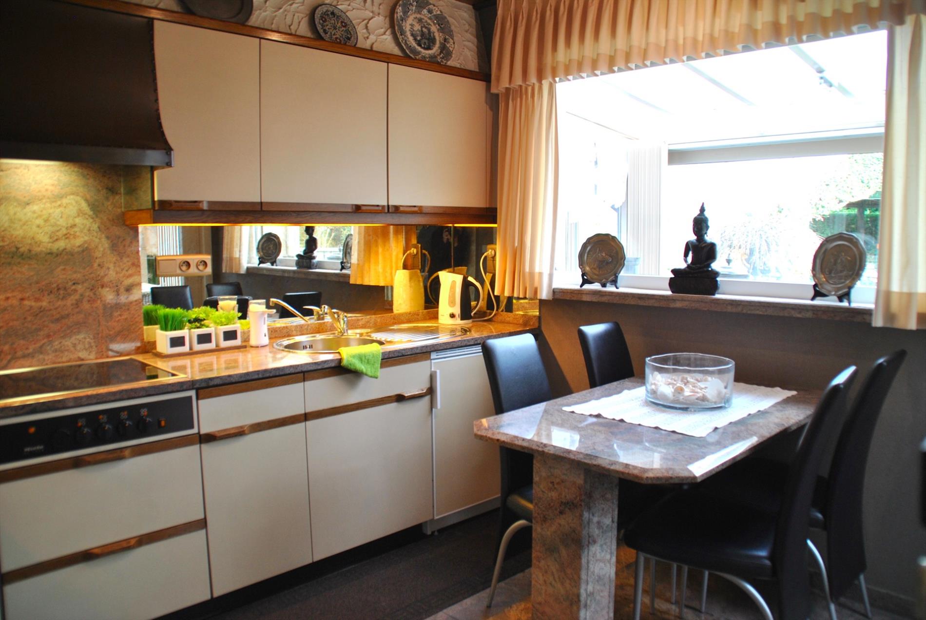 De keuken sluit aan bij de living en de veranda. Via de keuken kunnen we naar de garage, die ruim genoeg is voor extra stockage, wasmachine,...