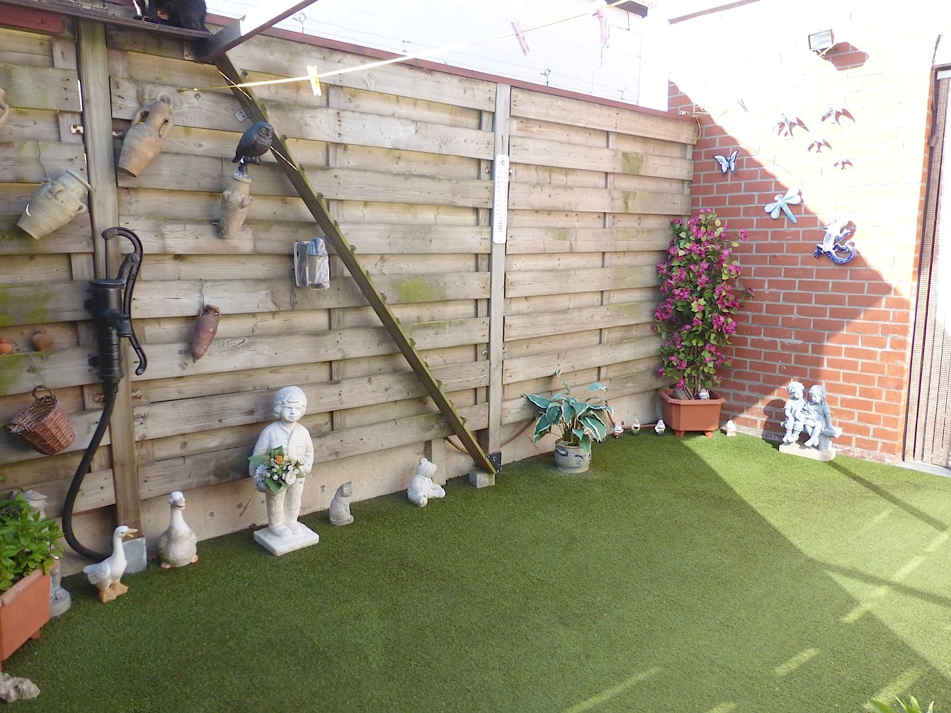 Achteraan is er een leuk tuintje/binnenkoer met tuinhuis. Via een doorgang naast de woning kunnen we rechtstreeks vanop de straatzijde naar achteren!
