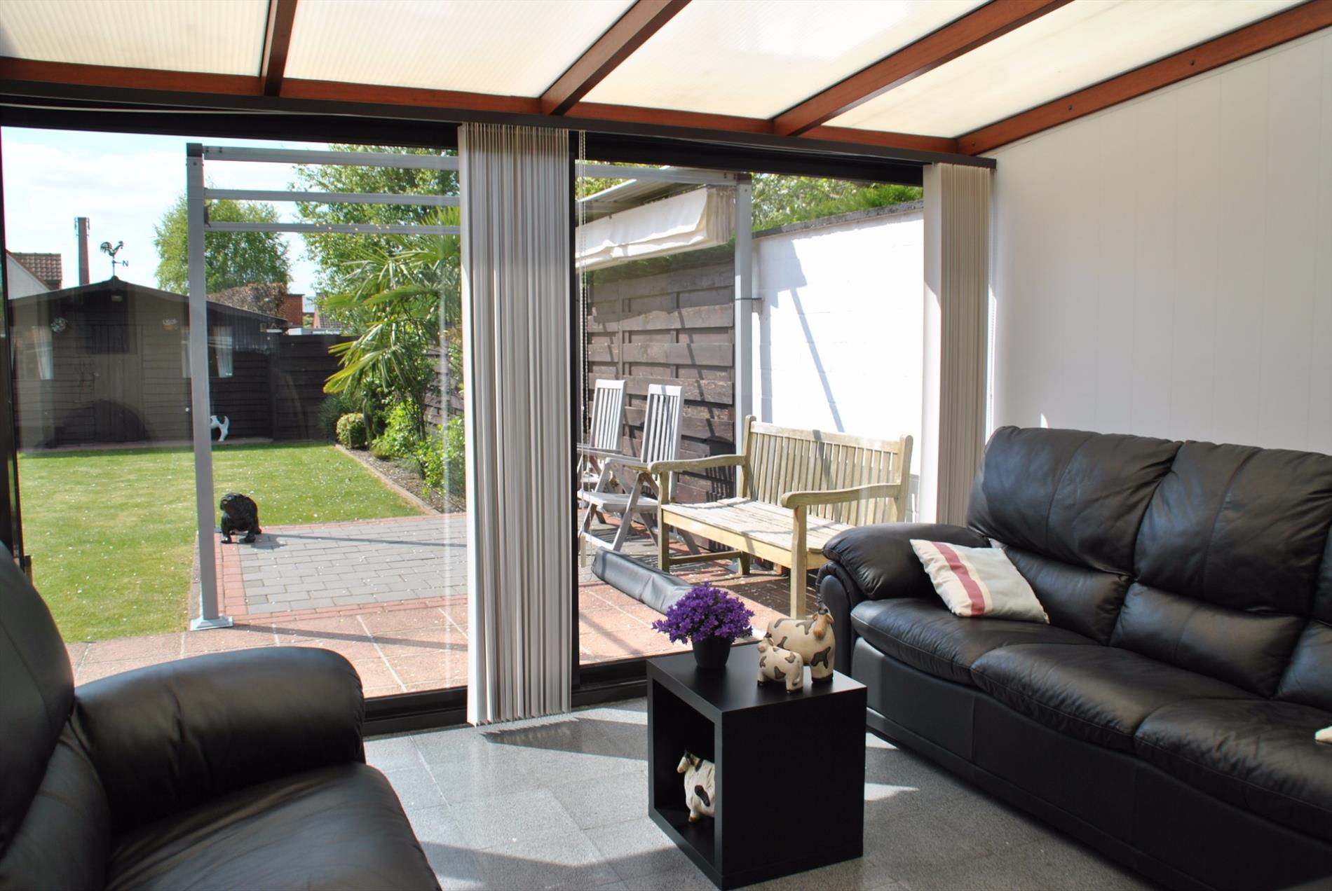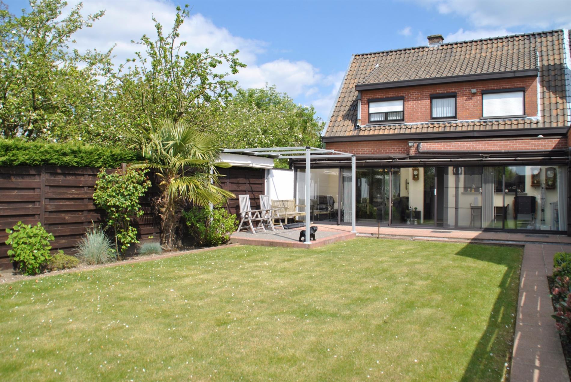 De zonrijke tuin met tuinhuisje is heel gezellig ingericht. Er is eveneens een ruim terras met beweegbaar zonnescherm. Door de oriëntatie is dit het perfecte zonnestekje.