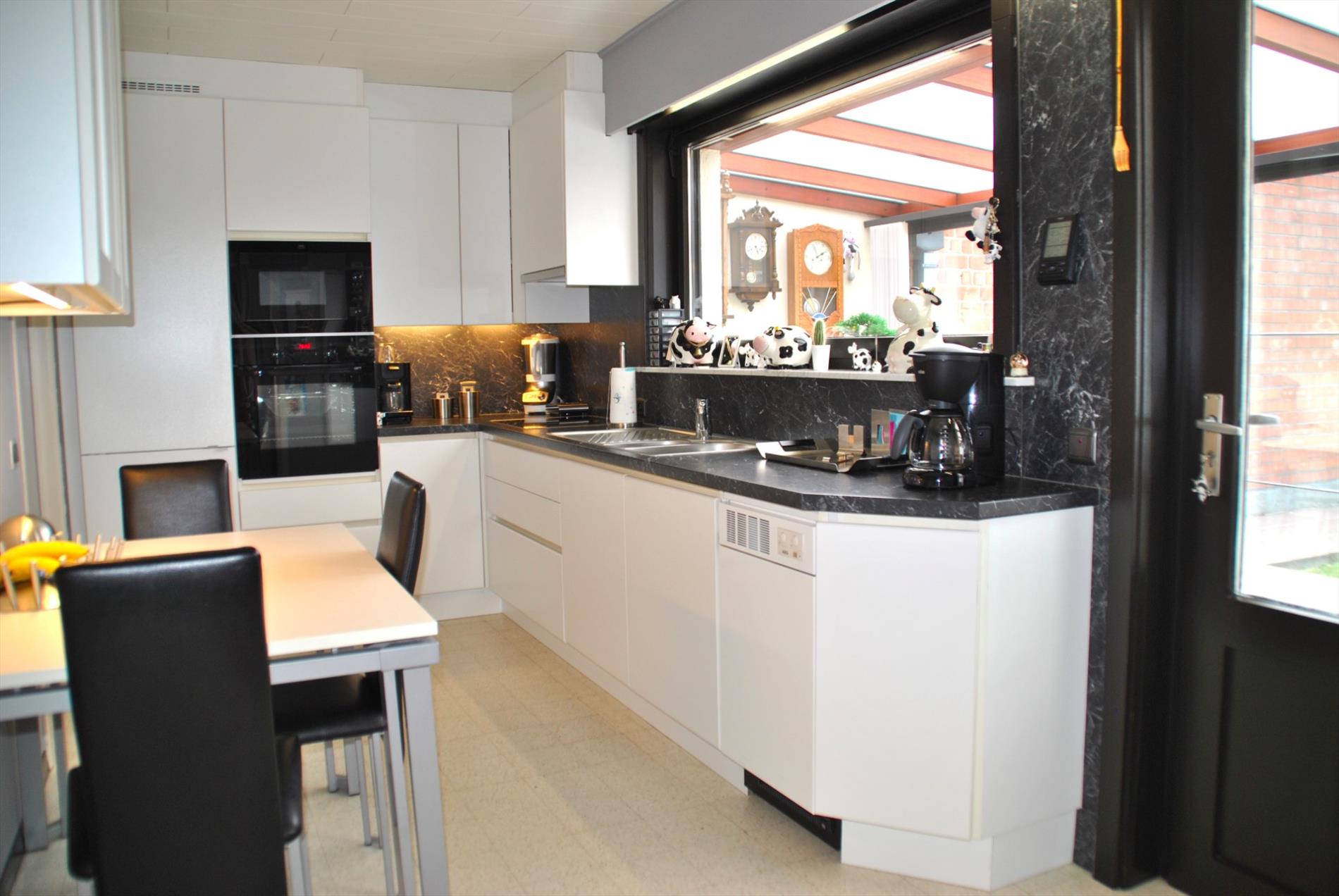 We komen de woonst binnen via de inkomhal met apart gastentoilet. Van hieruit kunnen we naar de living of de bovenverdieping. De leefruimte die volledig in het zonlicht baadt, is groot en enorm lichtrijk. Hieraan palend is de mooie keuken met berging. Zowel vanuit de leefruimte als de keuken is er mooi zicht op de verzorgde tuin. In de veranda is het eveneens heel aangenaam vertoeven.