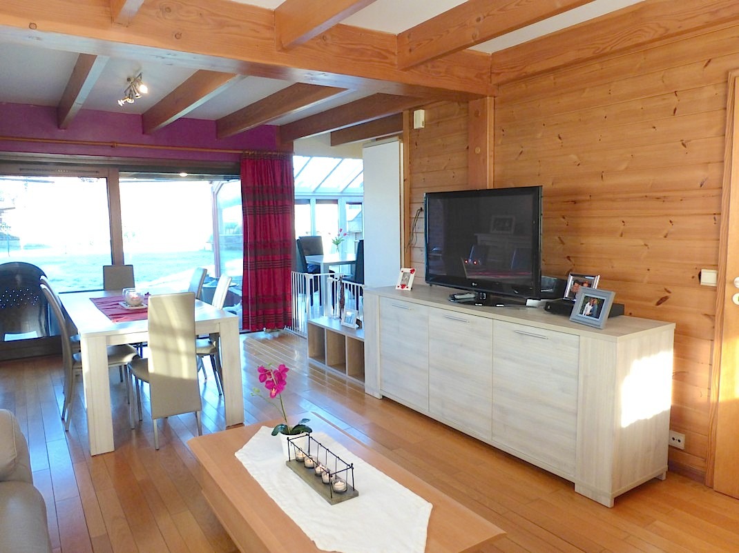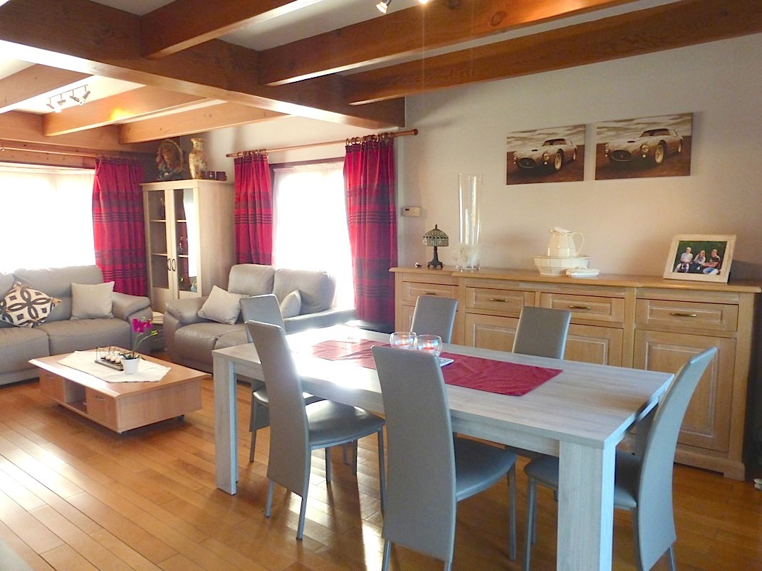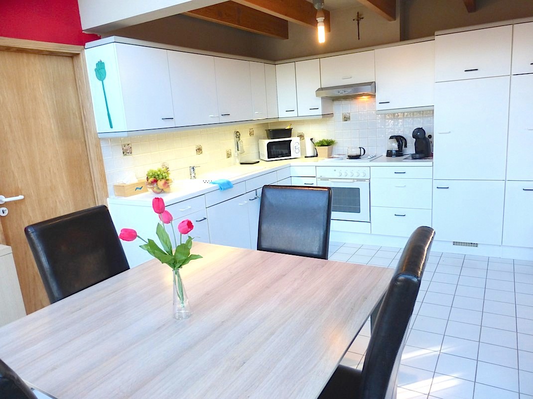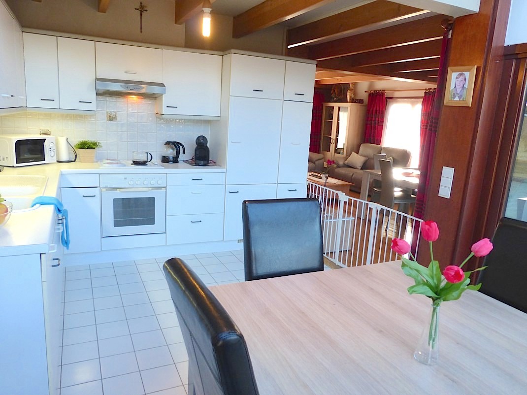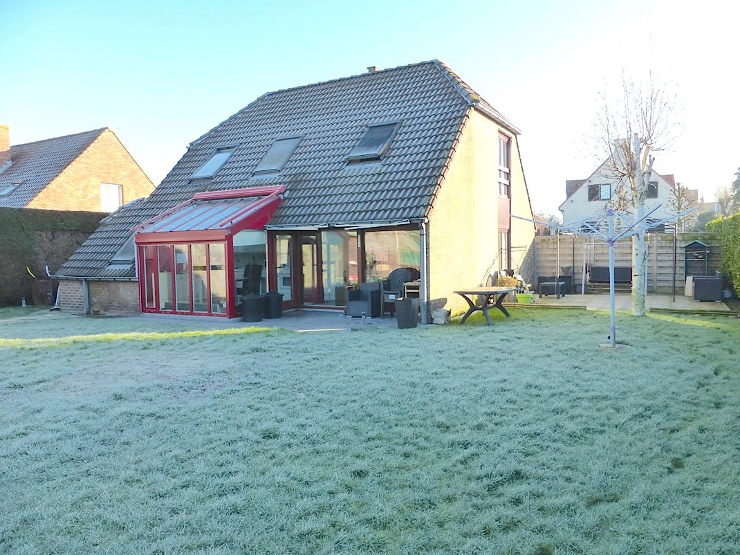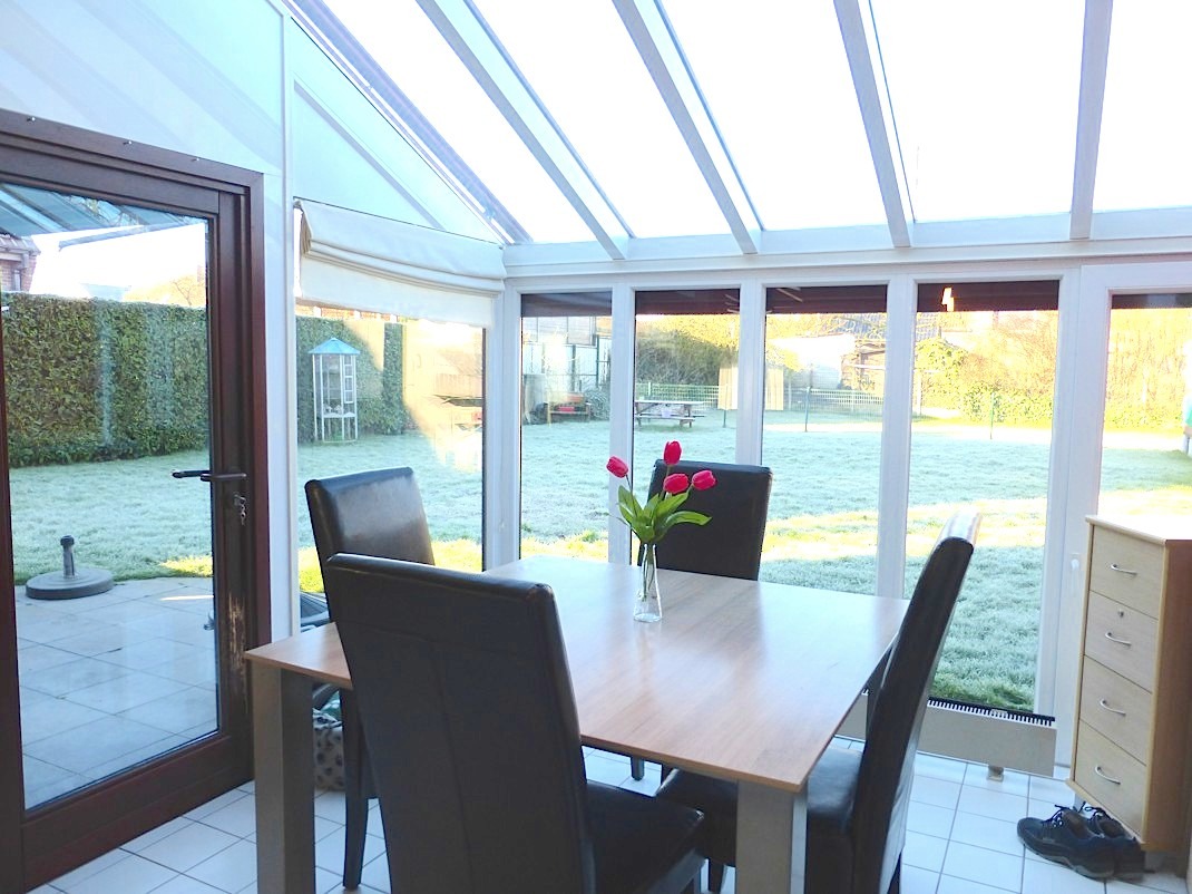 Aangrenzend vinden we de ruime leefkeuken. De vernieuwde beglaasde aanbouw met zonnewering zorgt ervoor dat er steeds een optimaal contact is met de tuin, en dit zowel in de winter als de zomer.