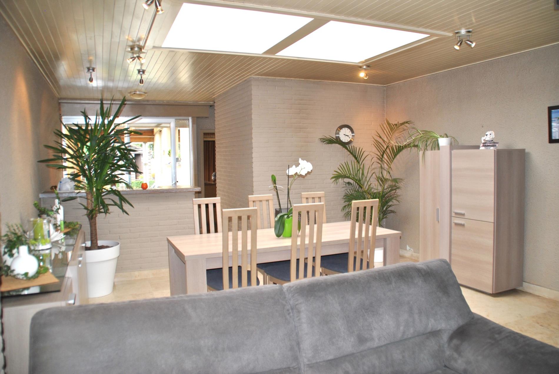 We vinden deze eigendom terug in een centrale maar toch rustige straat. We kunnen de woning binnenstappen via de inkomhal met apart toilet of via de garage. De leefruimte is gezellig en lichtrijk door de lichtkoepels en schuifraam achteraan. Aansluitend is er een praktische keuken met bergruimte en een veranda. De badkamer met lavabo en douche op de benedenverdieping is onlangs gerenoveerd.