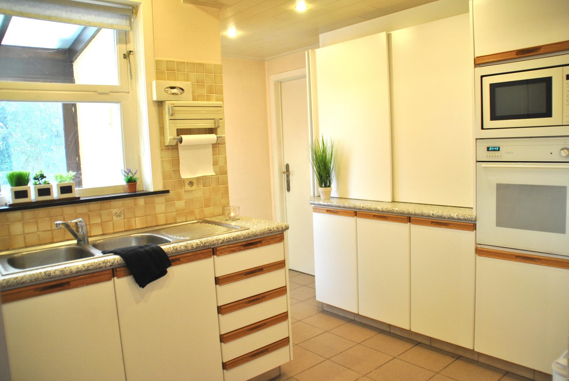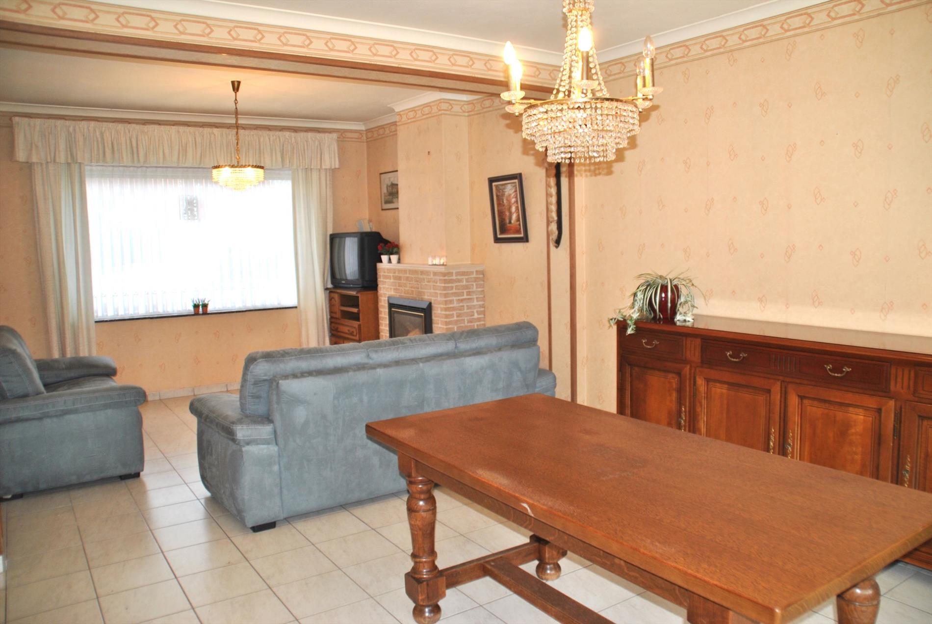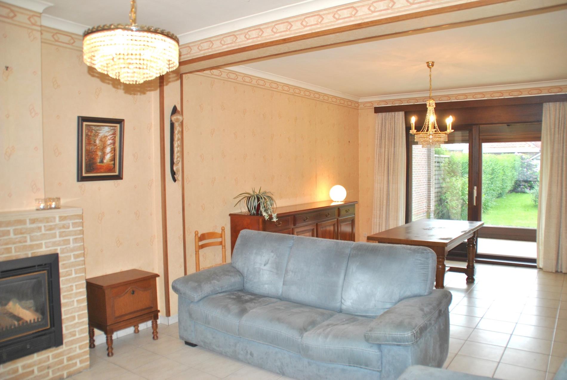 De leefruimte is ruim en lichtrijk en heeft een gashaard. Van hieruit gaan we naar de keuken met aanpalend een bijkeuken/berging met apart toilet. Ook de veranda is bereikbaar vanuit de living of de keuken. We hebben er een mooi zicht op de grote tuin.
