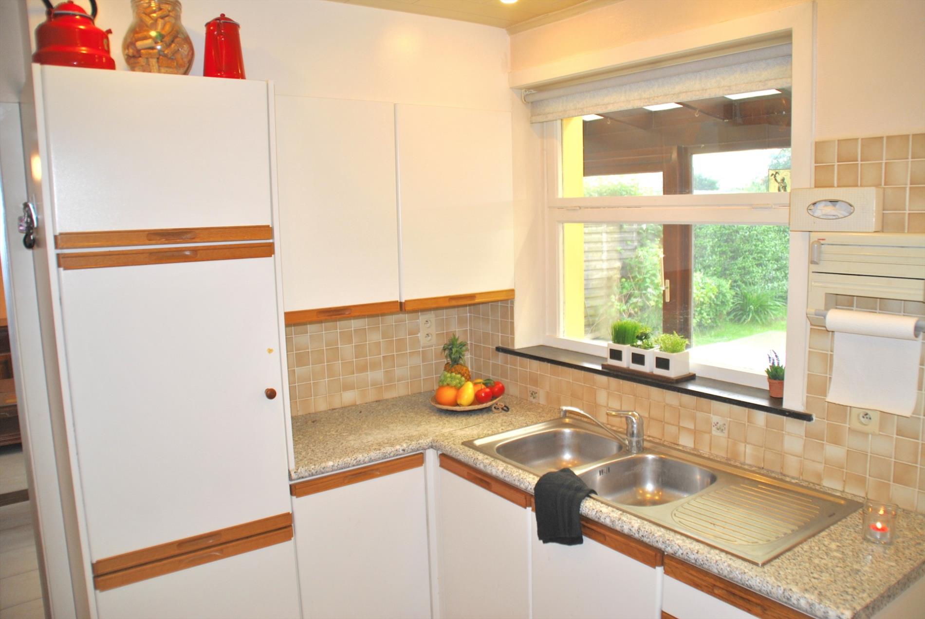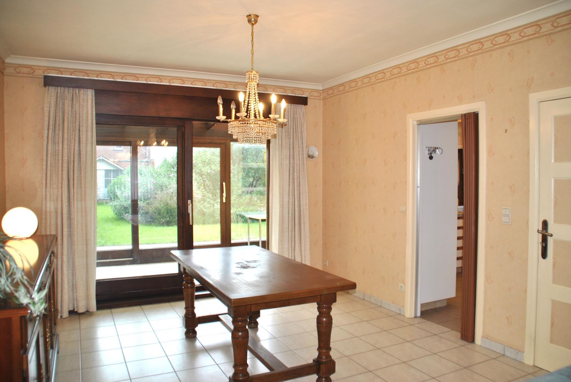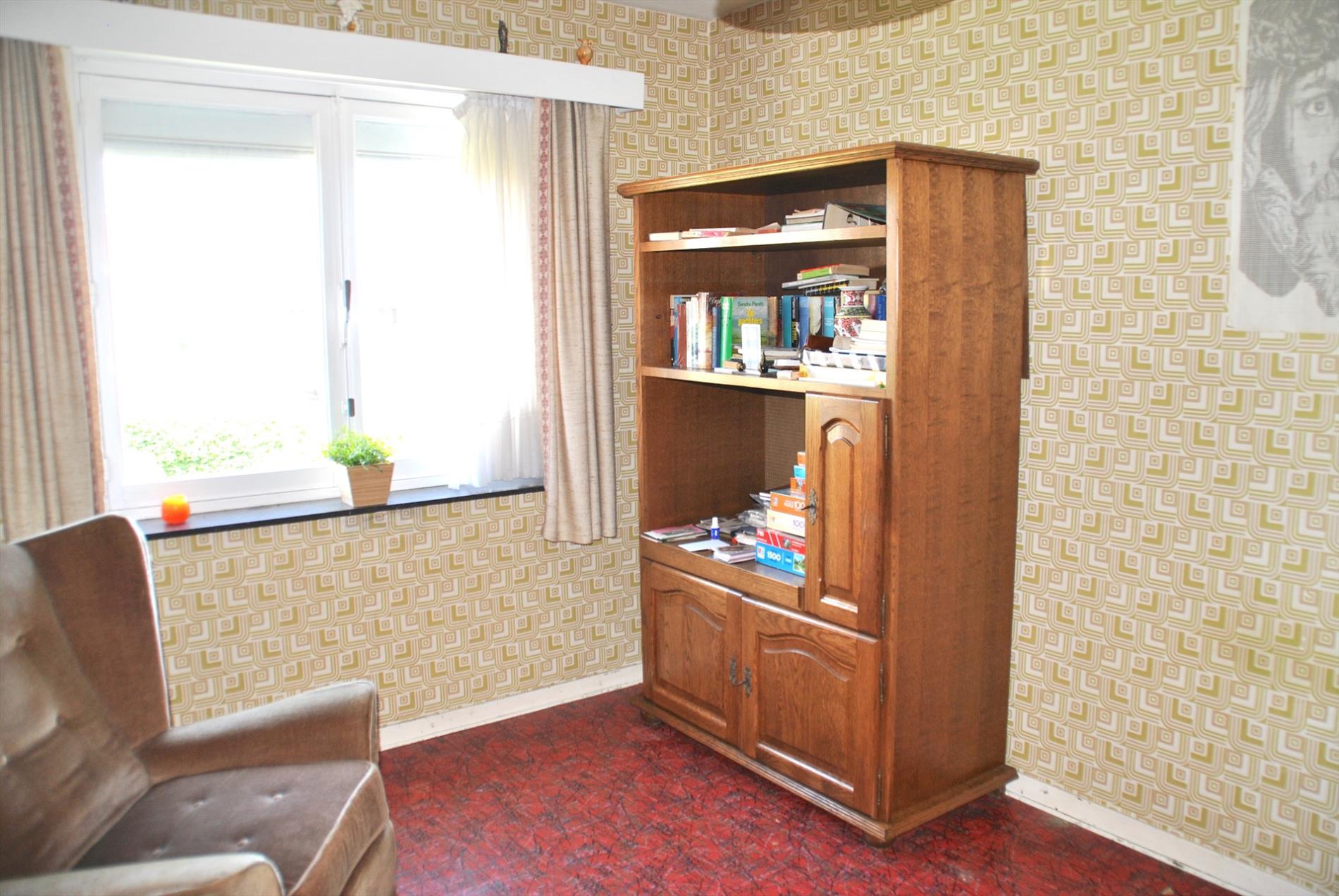 De leefruimte is ruim en lichtrijk en heeft een gashaard. Van hieruit gaan we naar de keuken met aanpalend een bijkeuken/berging met apart toilet. Ook de veranda is bereikbaar vanuit de living of de keuken. We hebben er een mooi zicht op de grote tuin.