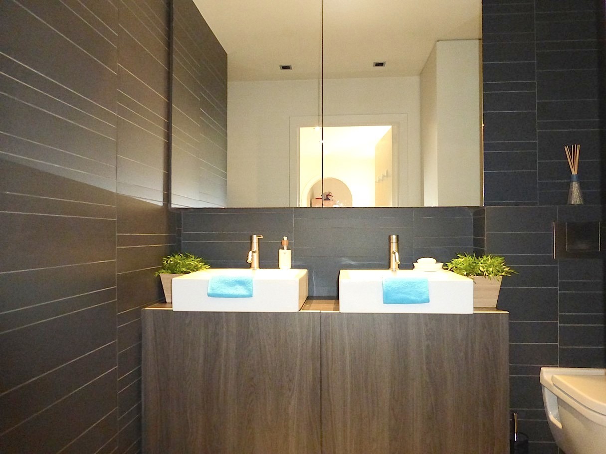 De moderne badkamer is voorzien van een dubbele lavabo, toilet en inloopdouche.