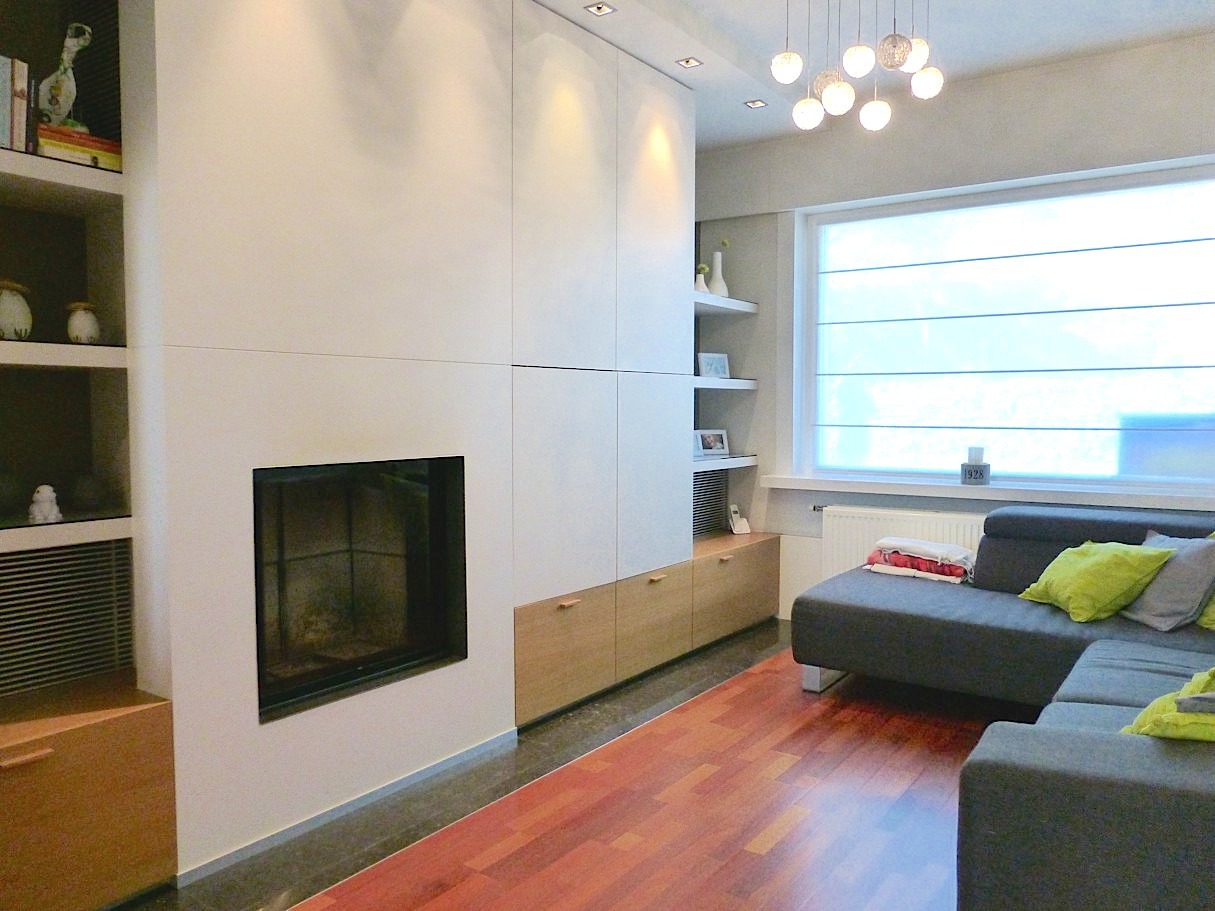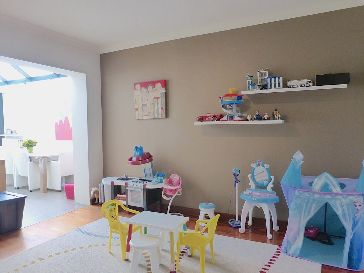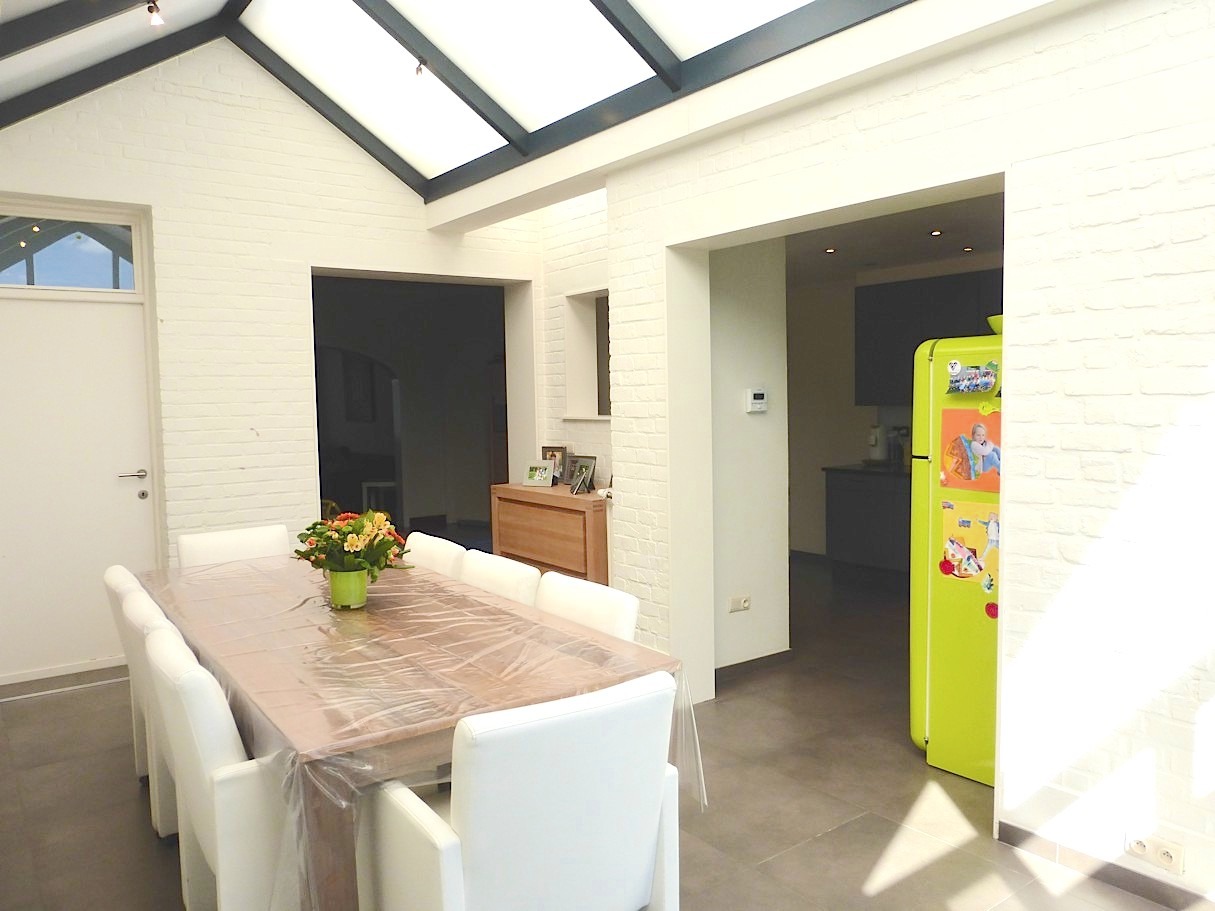 Achter deze mooie gevel schuilt een verrassend ruime woning. We komen binnen via de hal in de living. Deze is vooraan ingericht als een zeer gezellige zitruimte met ingebouwde haard en ingemaakte kastenwand. Centraal is er een eetkamer/bureau/zithoek. Achteraan vinden we een schitterende veranda die zorgt voor een zee aan licht in de woning. De keuken is volledig ingericht en door de originele inrichting, deels apart, maar toch met het nodige contact met de leefruimtes.