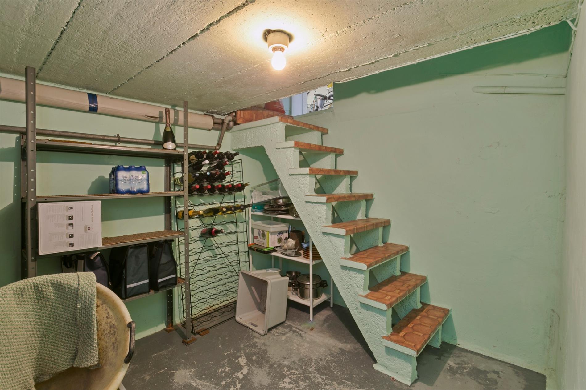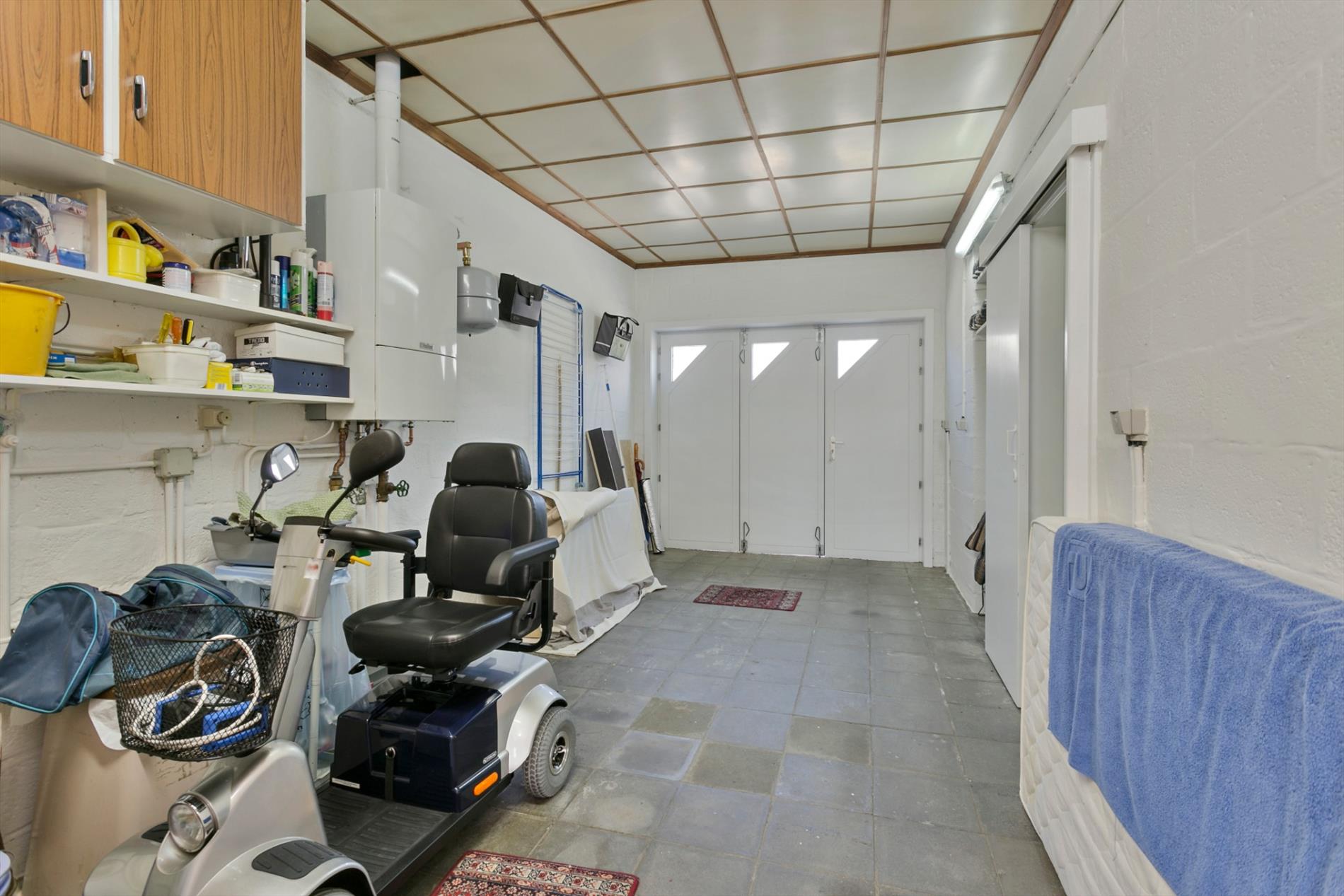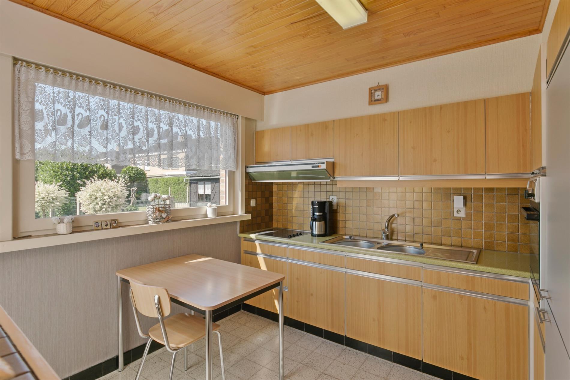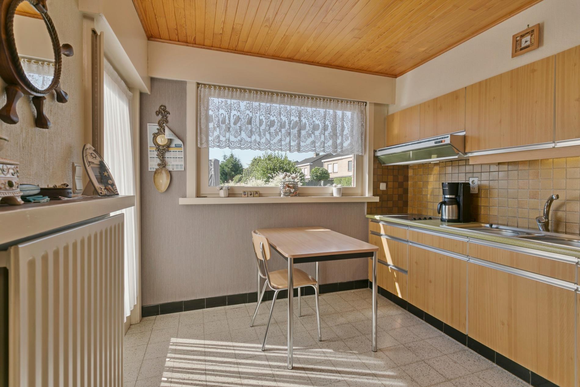De praktische keuken sluit aan bij de leefruimte en is eveneens grenzend aan de tuin achteraan. Via de keuken kunnen we naar de garage, die ruim genoeg is voor extra stockage, wasmachine,...
