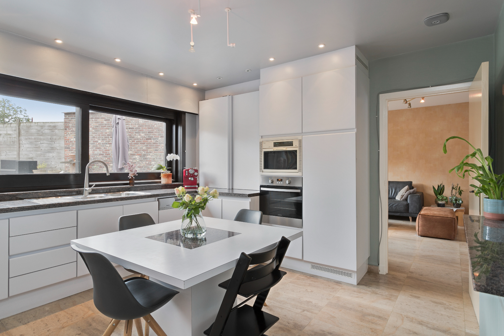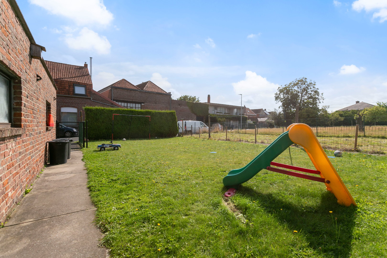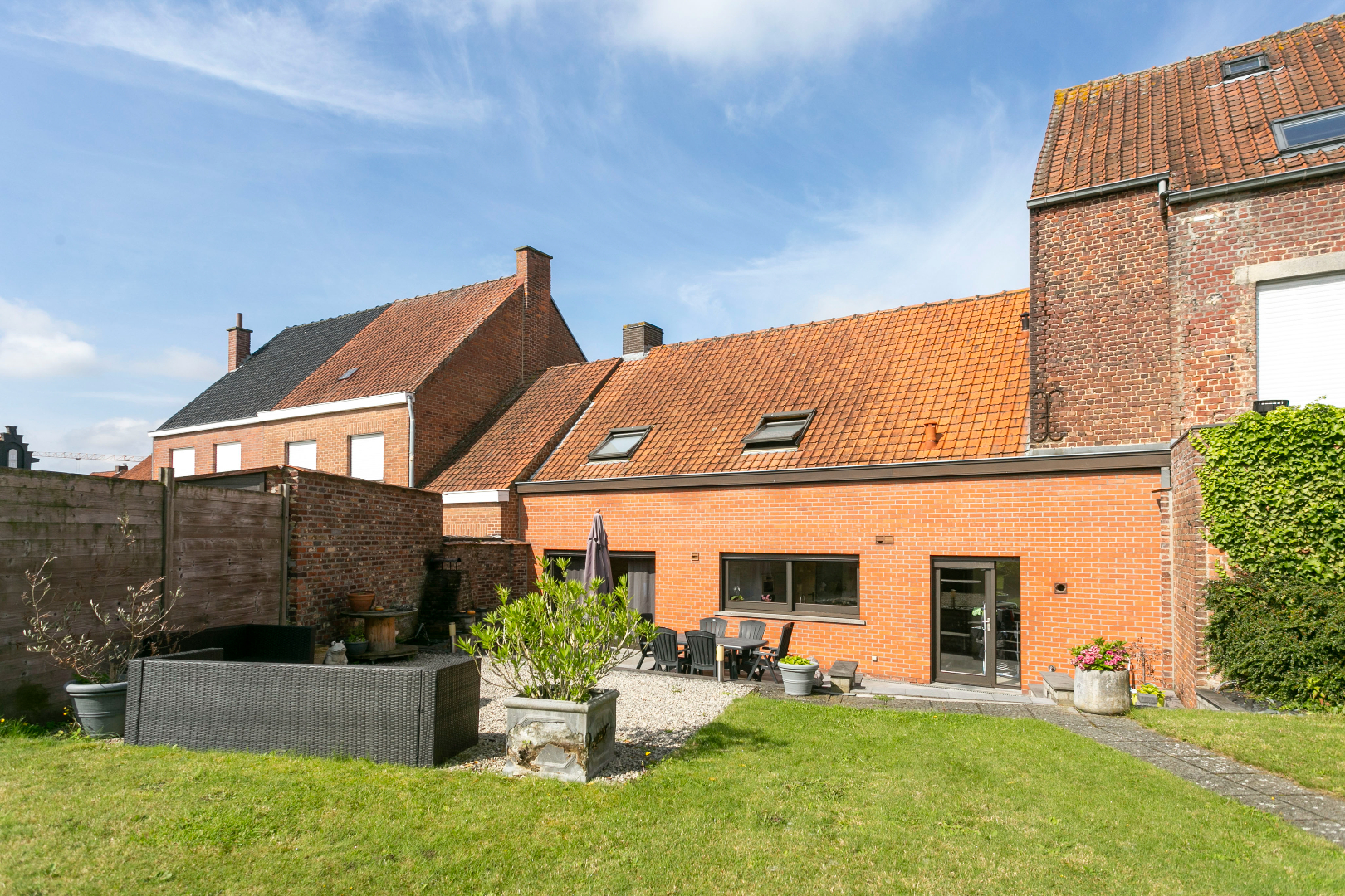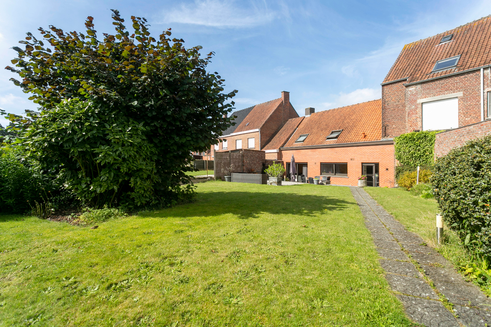 Centraal gelegen vinden we dit aangenaam eigendom terug. De mooie inkomhal met gastentoilet en vestiaire brengt ons via een dubbele deur in de living die baadt in het zonlicht. De vele ramen en de perfecte oriëntatie zorgen ervoor dat het hier de dag rond genieten is. Vanuit deze leefruimte hebben we mooi zicht op de enorme tuin. Aanpalend is er de ingerichte, eveneens zonnige keuken met ernaast een grote was-/bergruimte met aparte douche. Hierlangs hebben we ook toegang tot een zijdeur langs de straatzijde als tot de tuin achteraan.