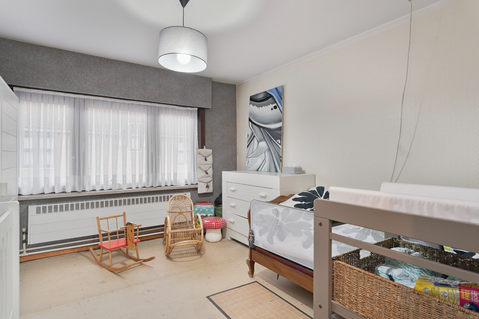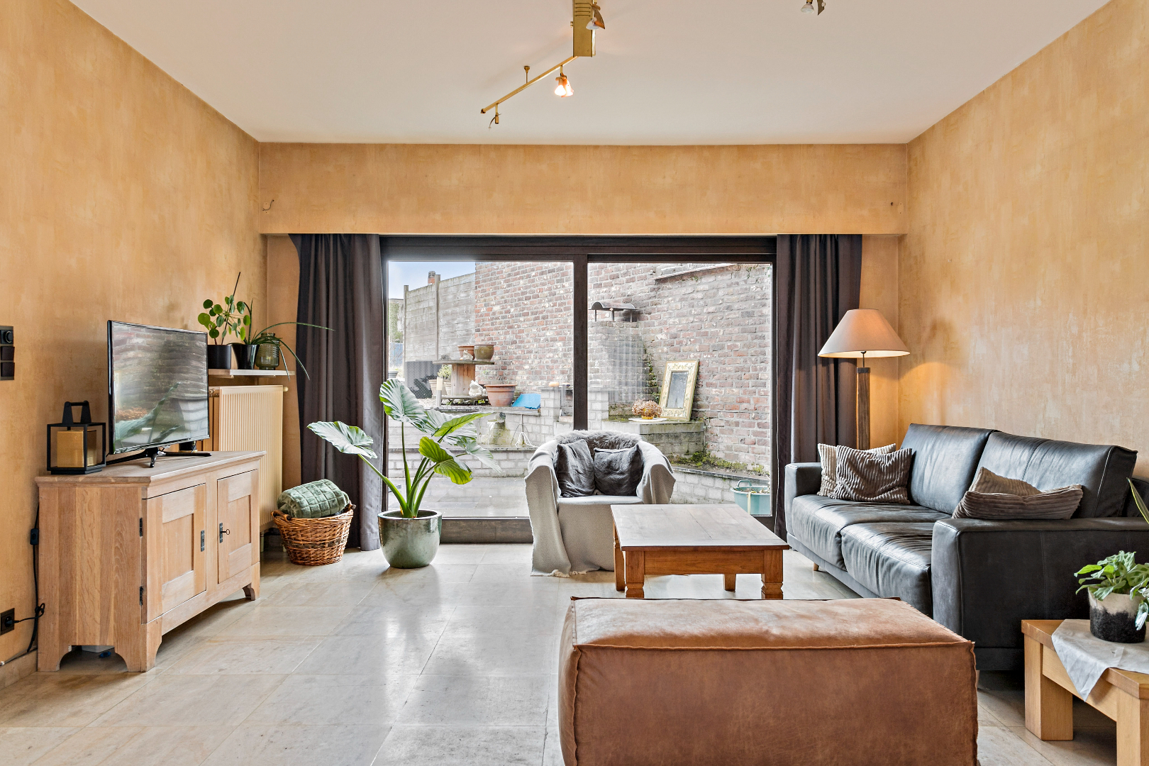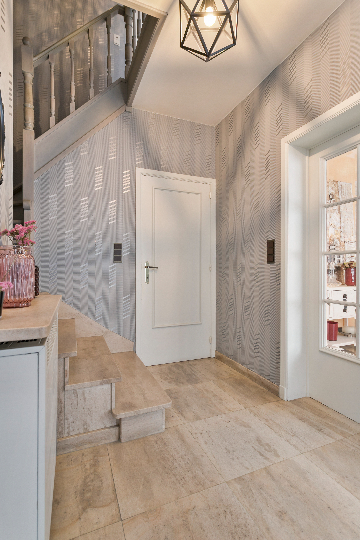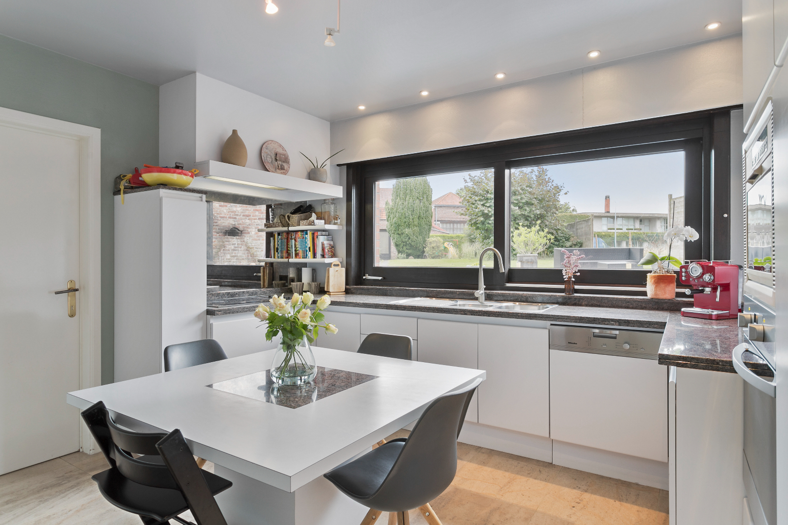 Centraal gelegen vinden we dit aangenaam eigendom terug. De mooie inkomhal met gastentoilet en vestiaire brengt ons via een dubbele deur in de living die baadt in het zonlicht. De vele ramen en de perfecte oriëntatie zorgen ervoor dat het hier de dag rond genieten is. Vanuit deze leefruimte hebben we mooi zicht op de enorme tuin. Aanpalend is er de ingerichte, eveneens zonnige keuken met ernaast een grote was-/bergruimte met aparte douche. Hierlangs hebben we ook toegang tot een zijdeur langs de straatzijde als tot de tuin achteraan.