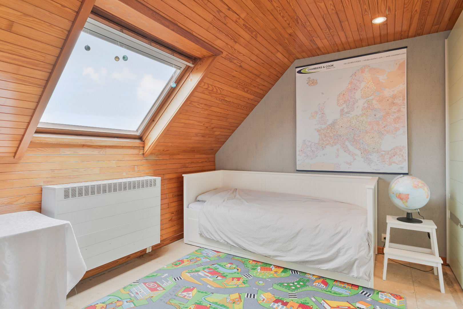 Op de bovenverdieping vinden we een ruime badkamer met bad, lavabo en toilet terug. Er zijn ook vier slaapkamers. Ingemaakte kasten zorgen hier voor extra bergruimte. Er is ook nog een berging van waaruit we ook toegang hebben tot de zolder.