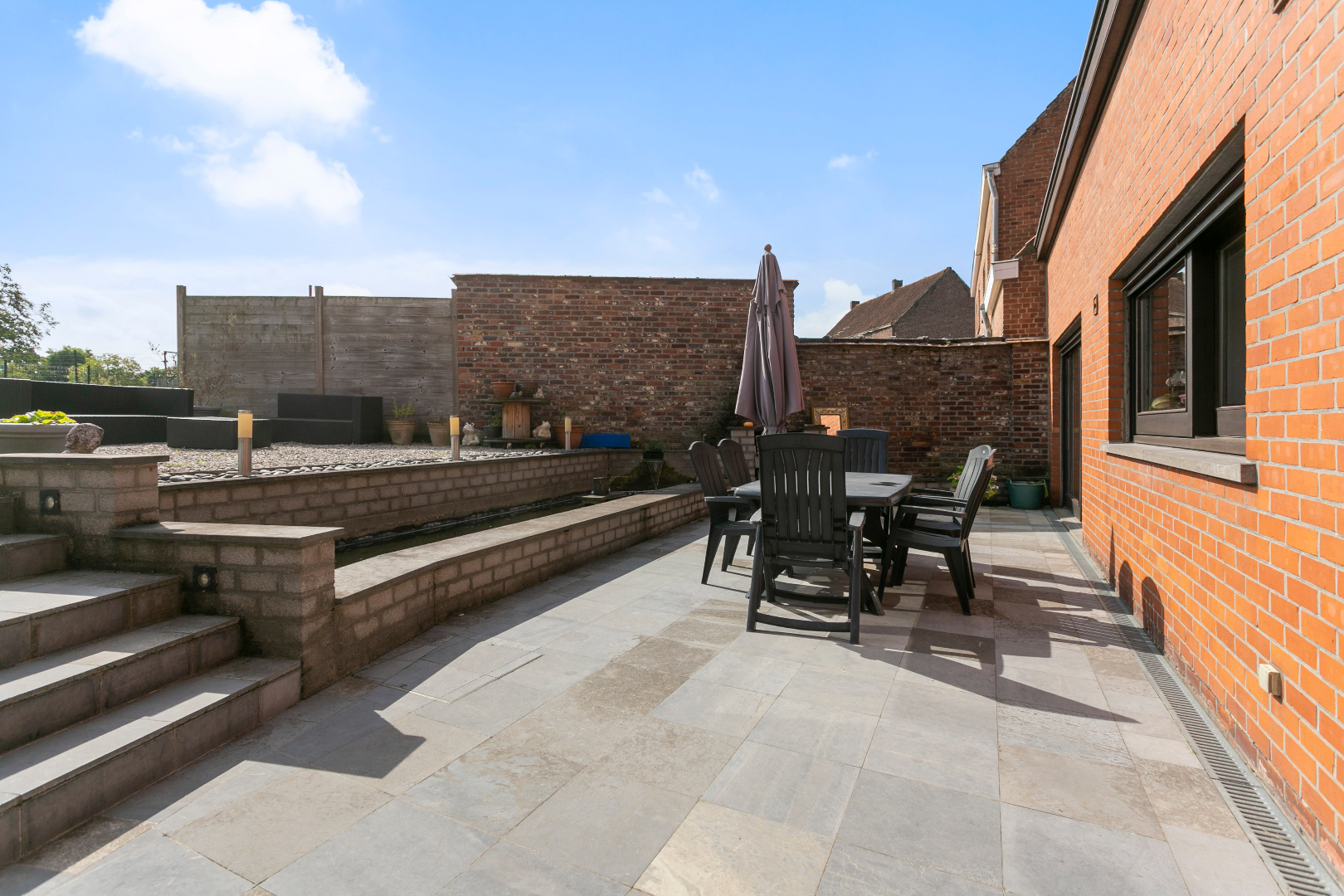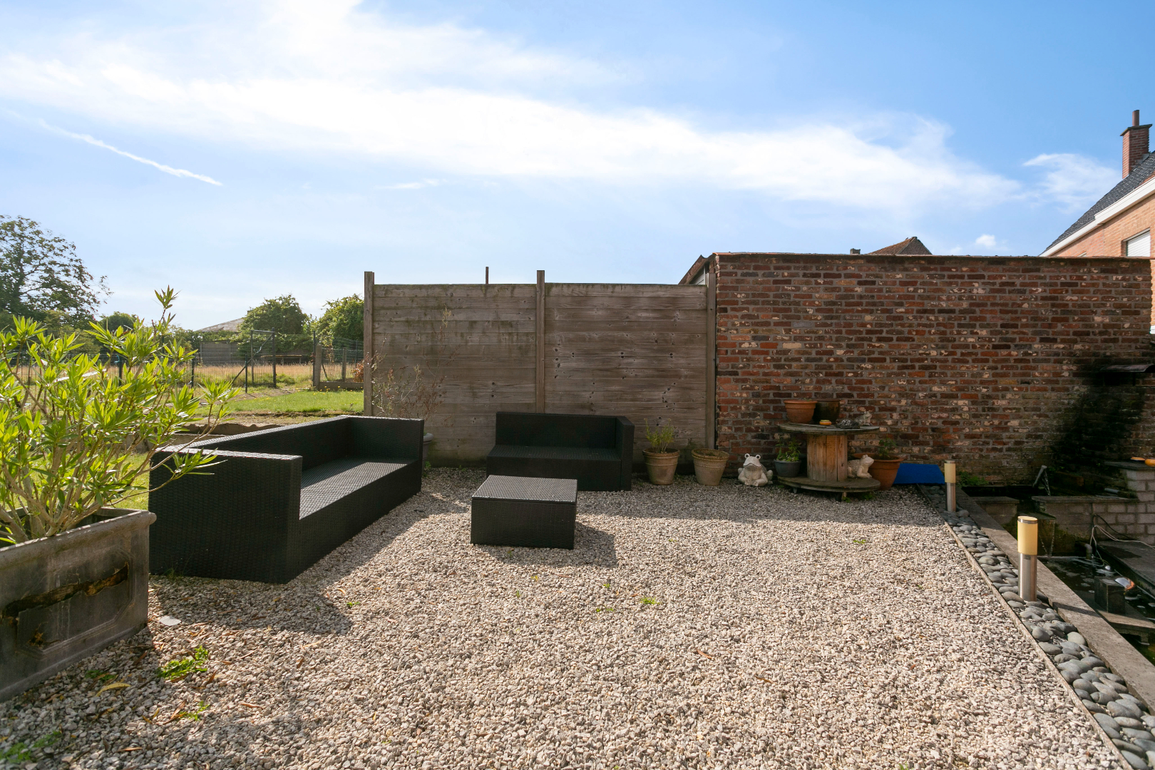 Buiten is er een mooi terras in natuursteen en een gezellige waterpartij. Via trapjes komen we zo in de zuidoost-gerichte tuin. Hier is een zee aan ruimte. Achteraan is er een garage met berging. De toegang via een klein straatje achteraan is een enorme troef.