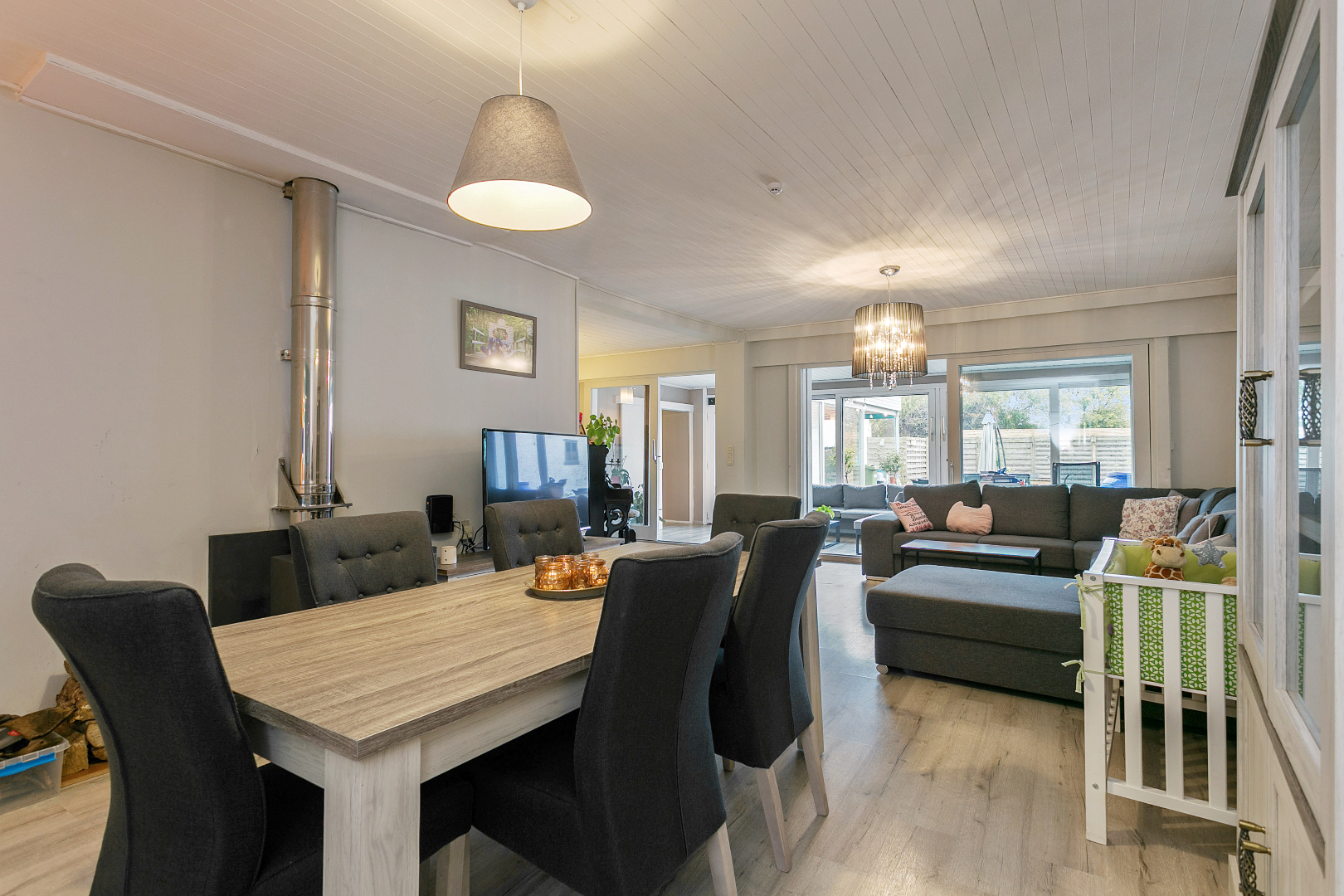 Het woongedeelte bestaat op de gelijkvloerse verdieping uit een ruime garage met daarachter de leefruimte. Er is een zit- en eetkamergedeelte. Vervolgens is er een ruime keuken met daarnaast een handige berging. We vinden er ook een veranda, apart toilet en badkamer met lavabo, bad en douche terug.