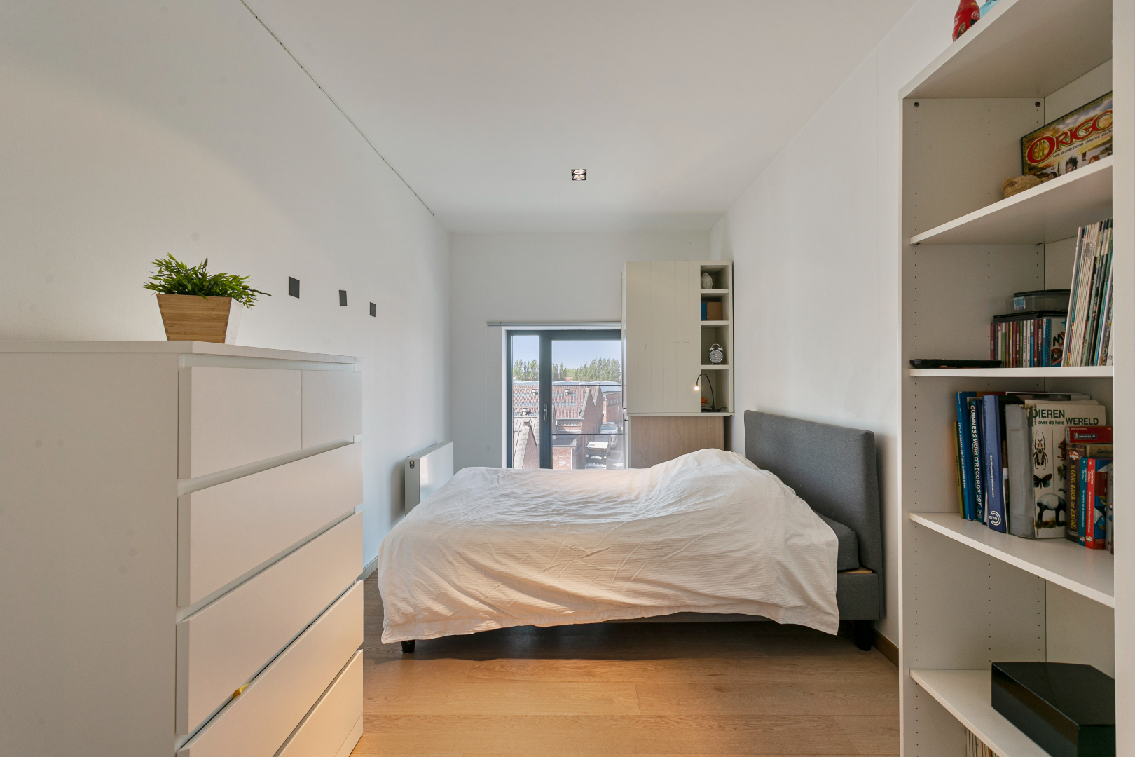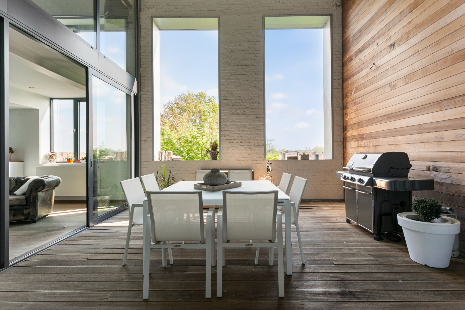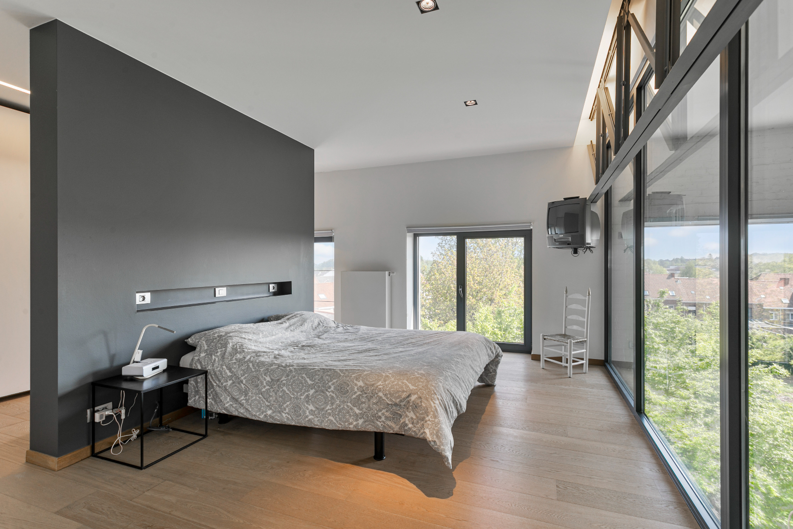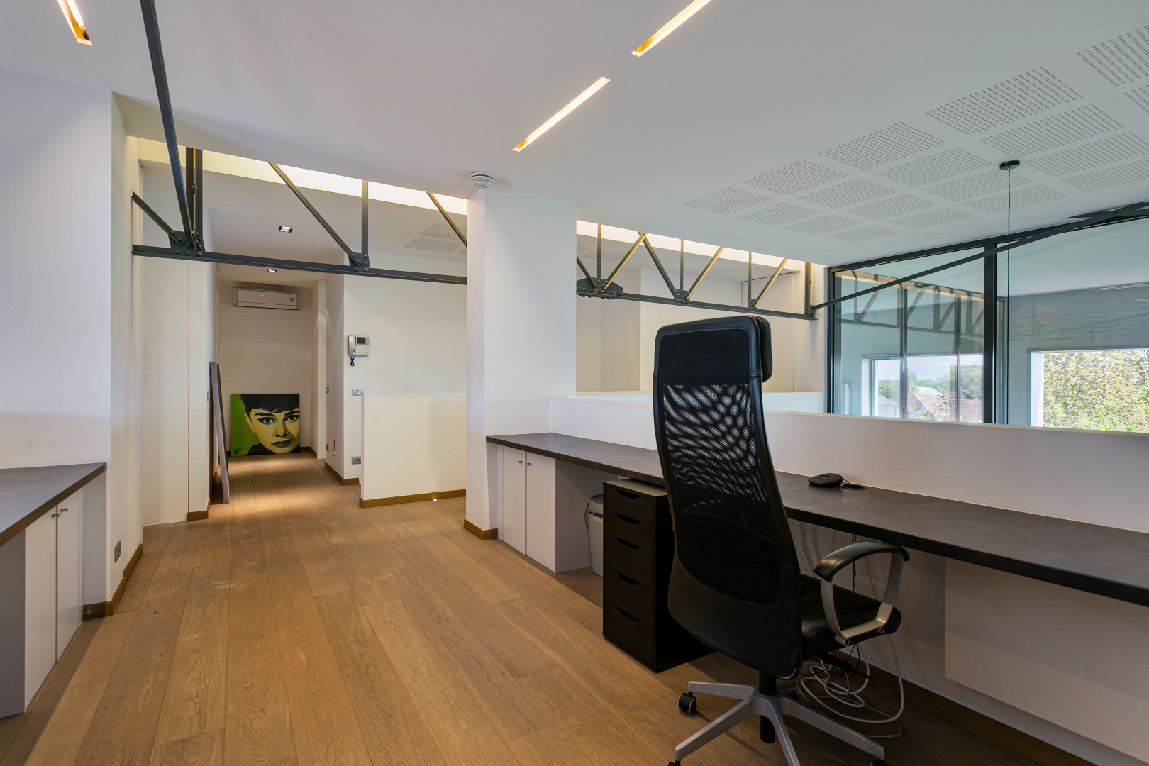 Via de mooie, stalen trap stappen we verwachtingsvol naar de 2e verdieping. Ook hier worden die verwachtingen ruimschoots ingelost. De originele, stalen elementen zijn schitterend. We treffen er 3 slaapkamers en een prachtig, zwevend, open buro. Vanuit de ouderslaapkamer annex dressing hebben we een schitterend zicht op het terras. Deze ruimtes zijn ook allemaal op parket. De grote badkamer bevindt zich tussen de slaapkamers. Deze is voorzien van een bad, inloopdouche, toilet en dubbele lavabo. De glazen deuren zorgen hier voor een maximum aan lichtinval.