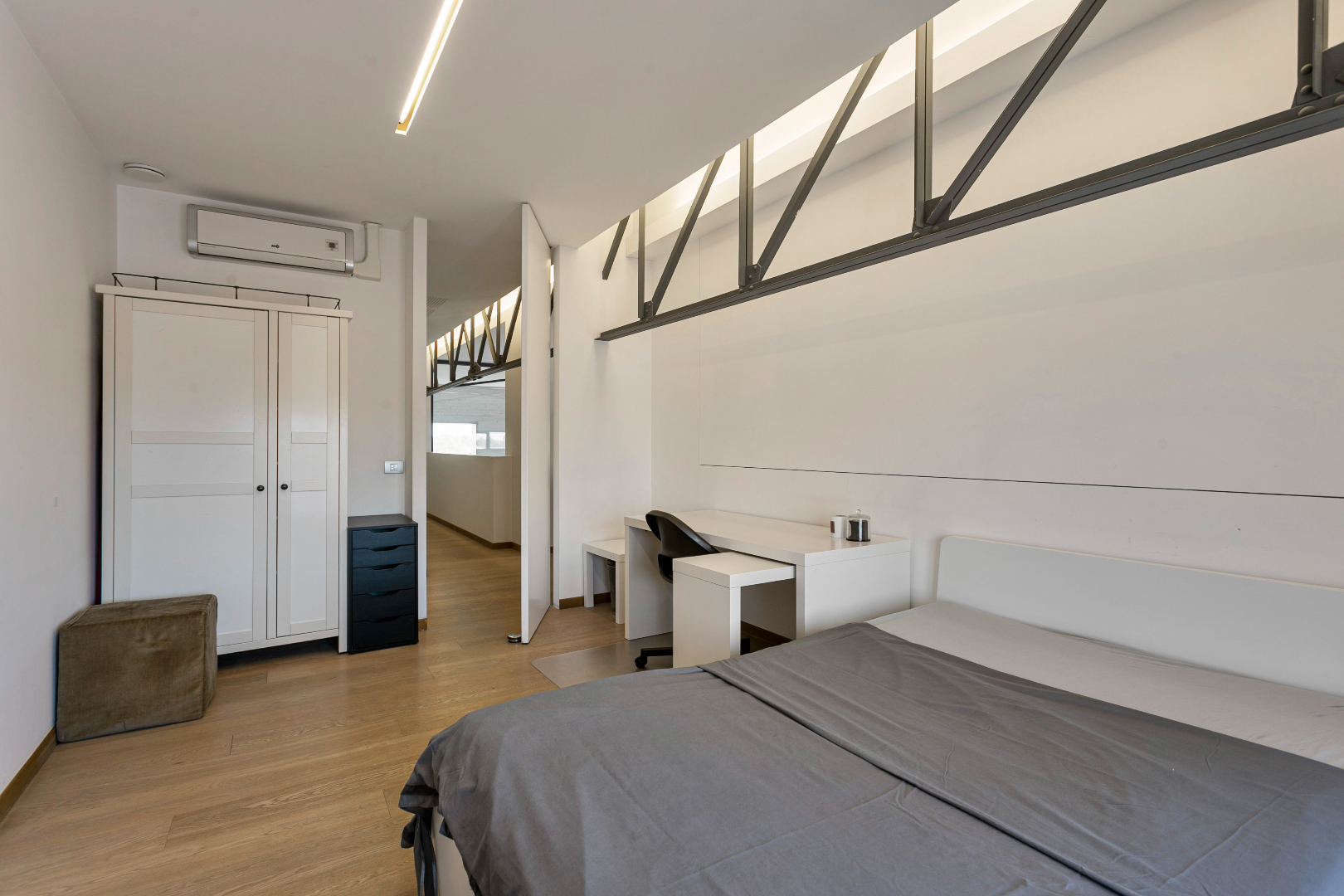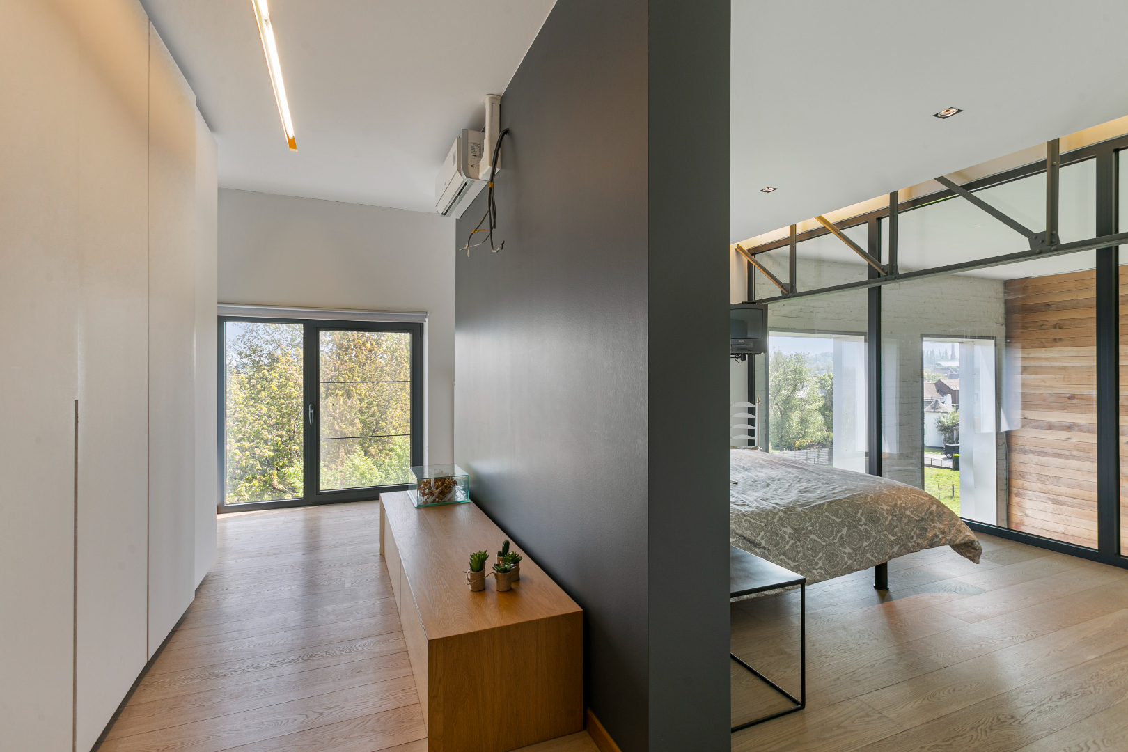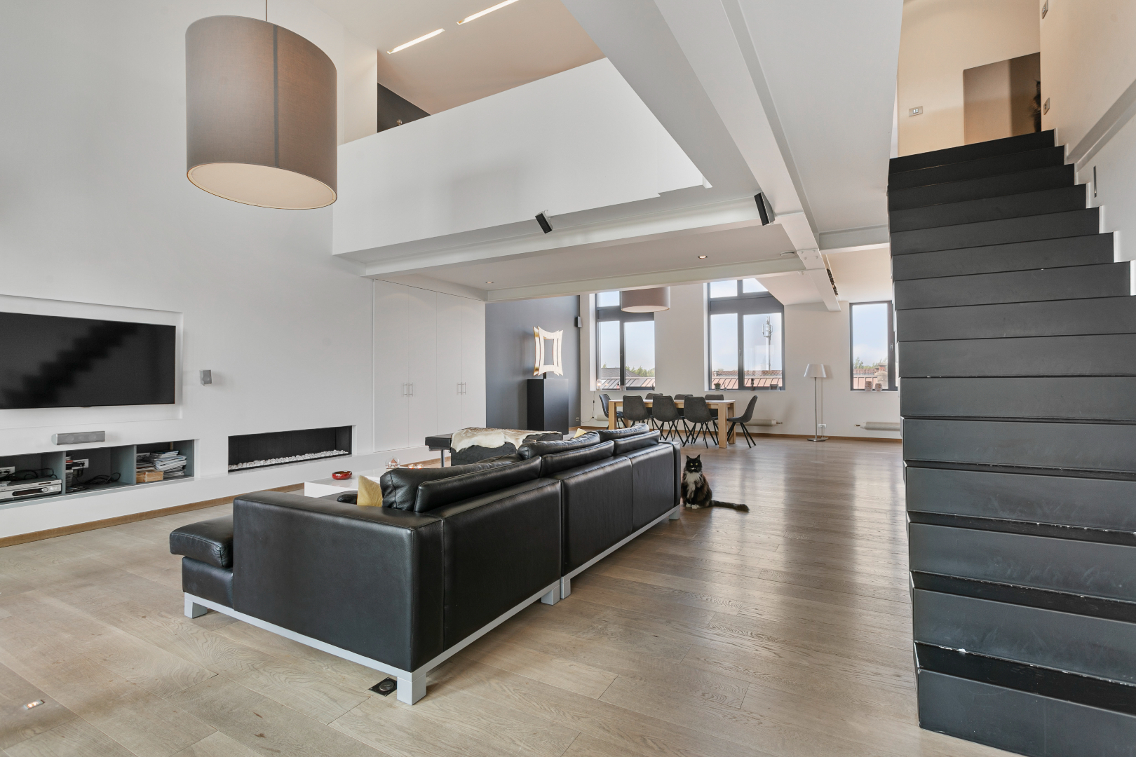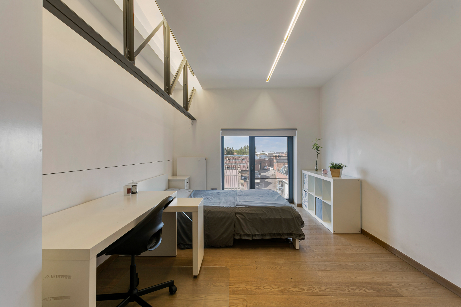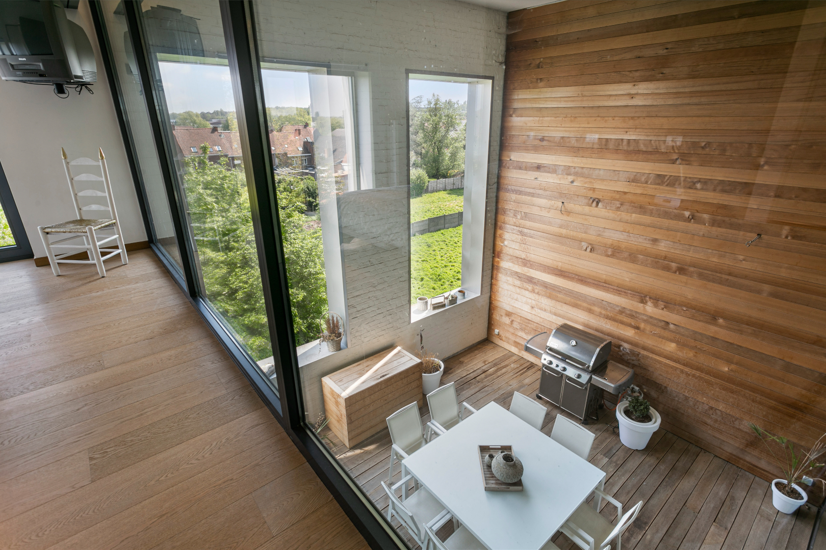 Via de mooie, stalen trap stappen we verwachtingsvol naar de 2e verdieping. Ook hier worden die verwachtingen ruimschoots ingelost. De originele, stalen elementen zijn schitterend. We treffen er 3 slaapkamers en een prachtig, zwevend, open buro. Vanuit de ouderslaapkamer annex dressing hebben we een schitterend zicht op het terras. Deze ruimtes zijn ook allemaal op parket. De grote badkamer bevindt zich tussen de slaapkamers. Deze is voorzien van een bad, inloopdouche, toilet en dubbele lavabo. De glazen deuren zorgen hier voor een maximum aan lichtinval.
