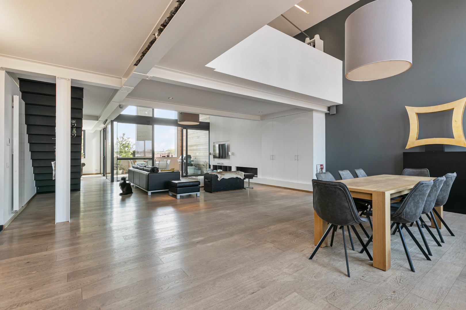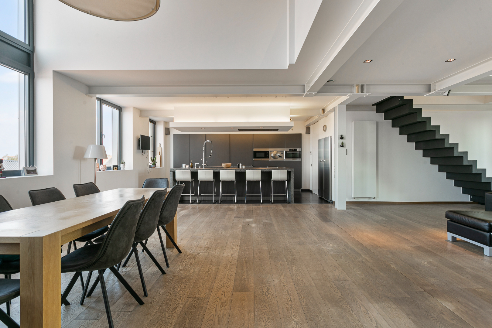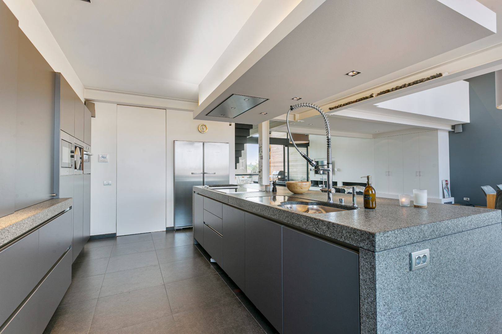 Via een mooie trappenhal komen we terecht op de 1e verdieping. Op de gang boven is er een gastentoilet en vestiaire. Via de kamerhoge pivoterende deur stappen we binnen in de leefruimte. Hier overvalt ons het waw-gevoel. Door de vele ramen en de hoge plafonds baadt deze parel in het zonlicht! Het parket en de gashaard maken van het salon en de eetruimte een zalige ruimte. De grote open keuken is voorzien van alle comfort. Ontbijten kan in alle gezelligheid aan het keukeneiland. De naastgelegen berging omvat alle technieken en biedt ruimschoots plaats aan wasmachine en droogkast. Het ruime, overdekte terras laat u genieten in alle rust!