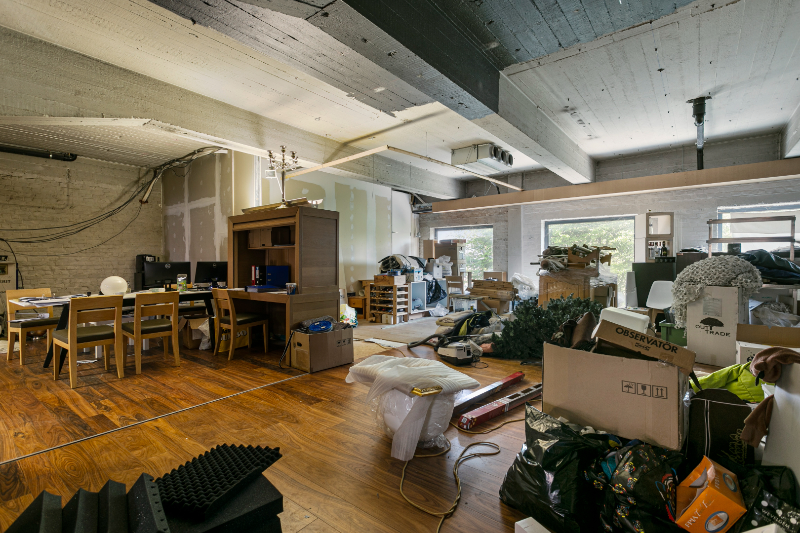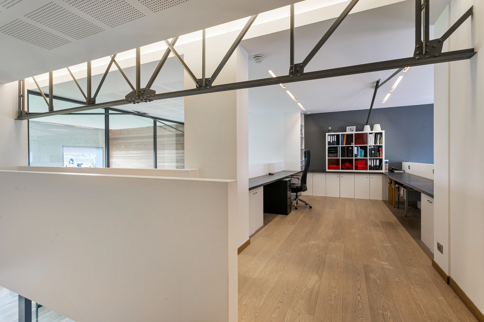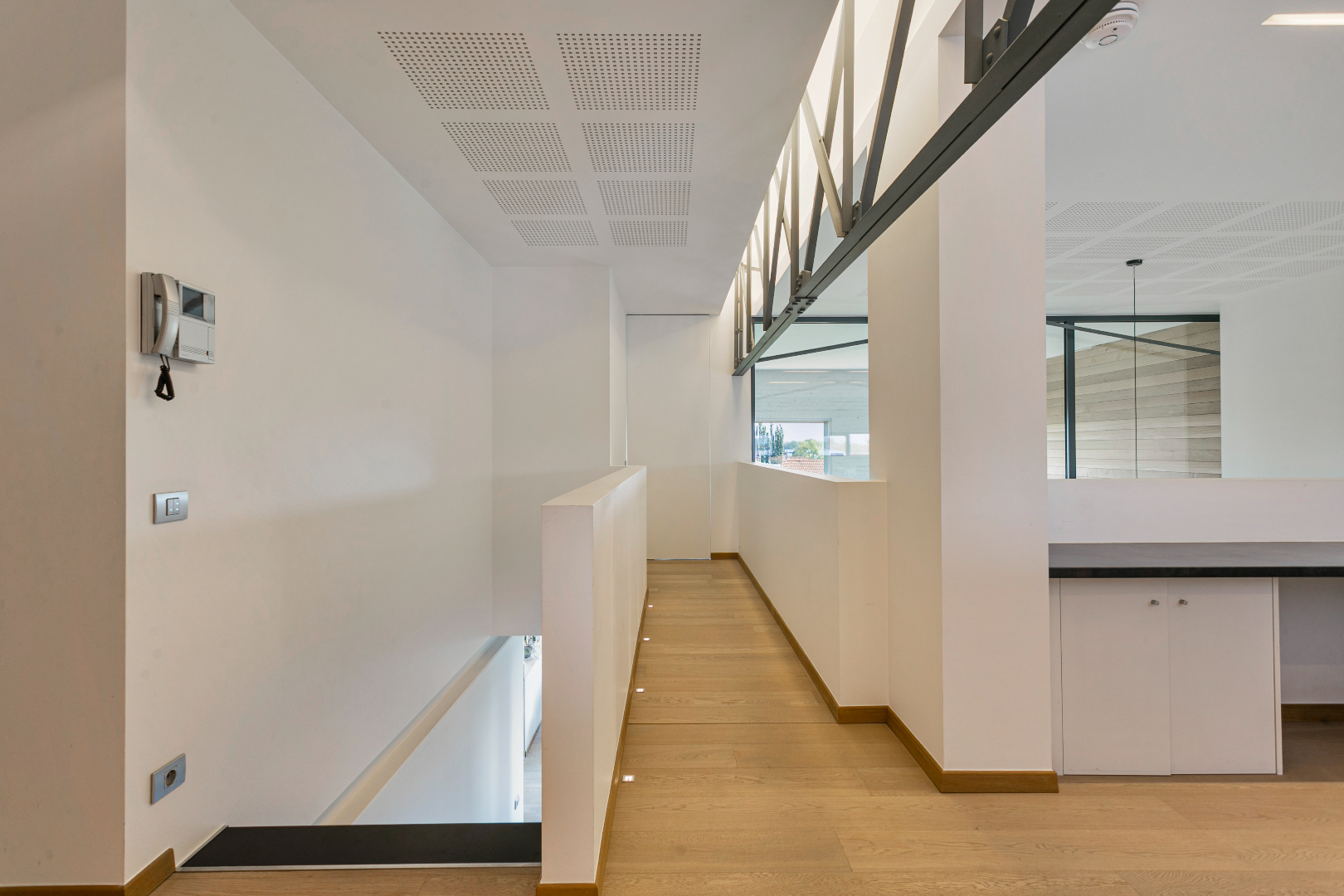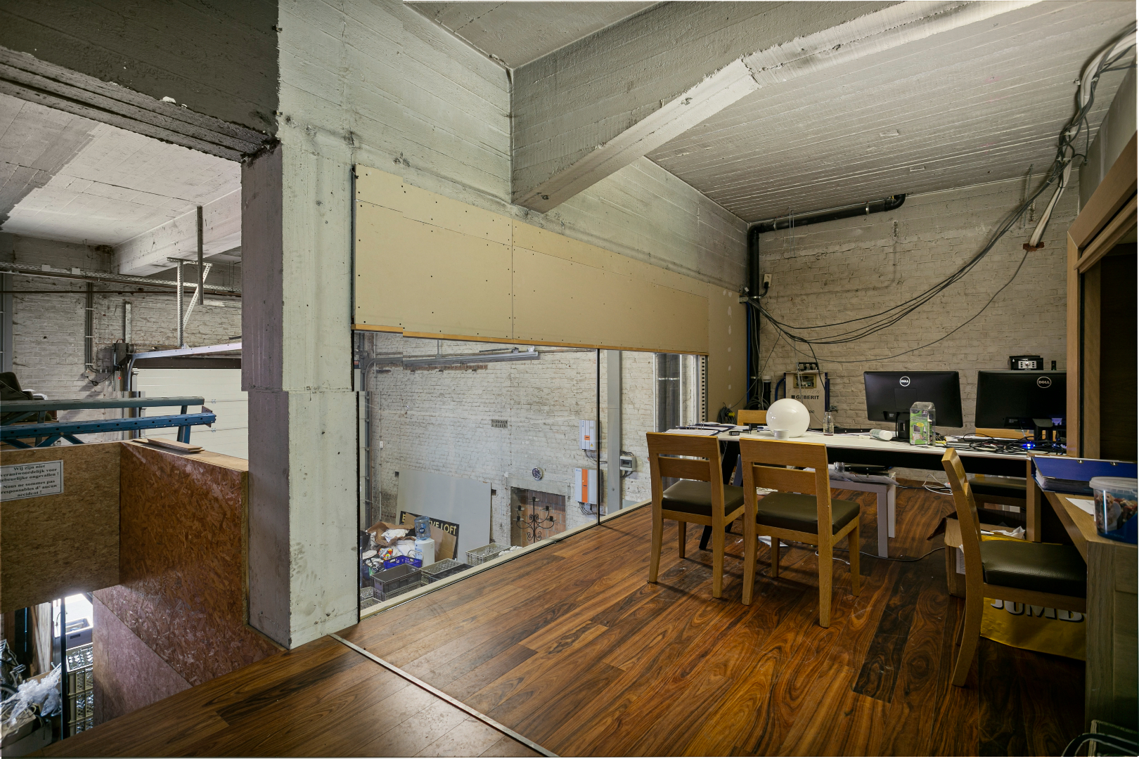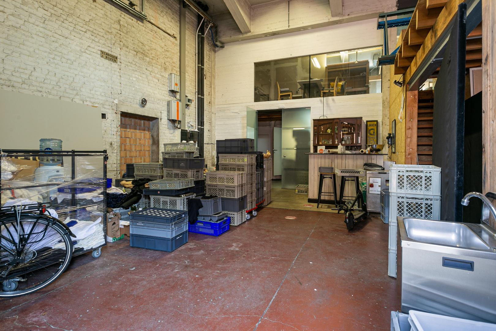 Het benedenverdieping beslaat ongeveer 187 m2, zijnde 17 m diep en 11 m breed. Het atelier omvat quasi de volledige benedenverdieping en is momenteel ingedeeld met valse wanden. Deze ruimte is breed inzetbaar. Via een trap bereiken we de tussenverdieping. Die is momenteel ingericht als buro en stockageplaats en is ongeveer 135m2. Door de vide is er hier veel contact mogelijk met de benedenverdieping.
