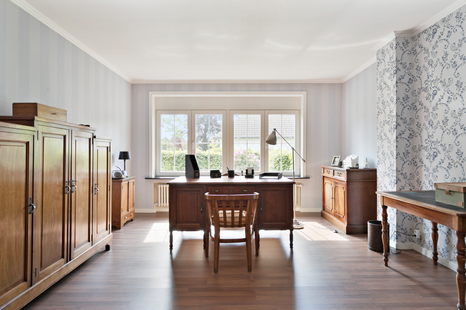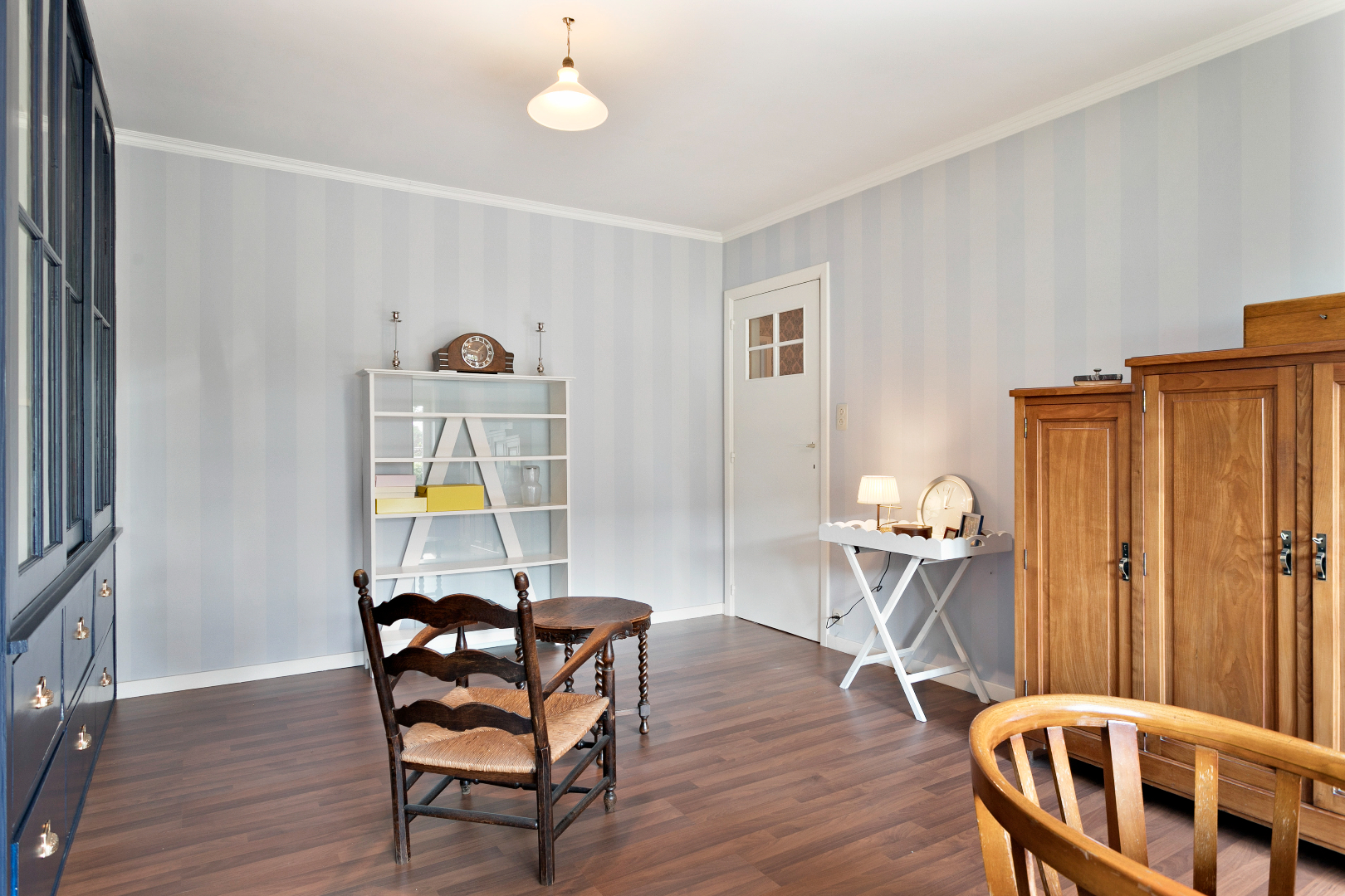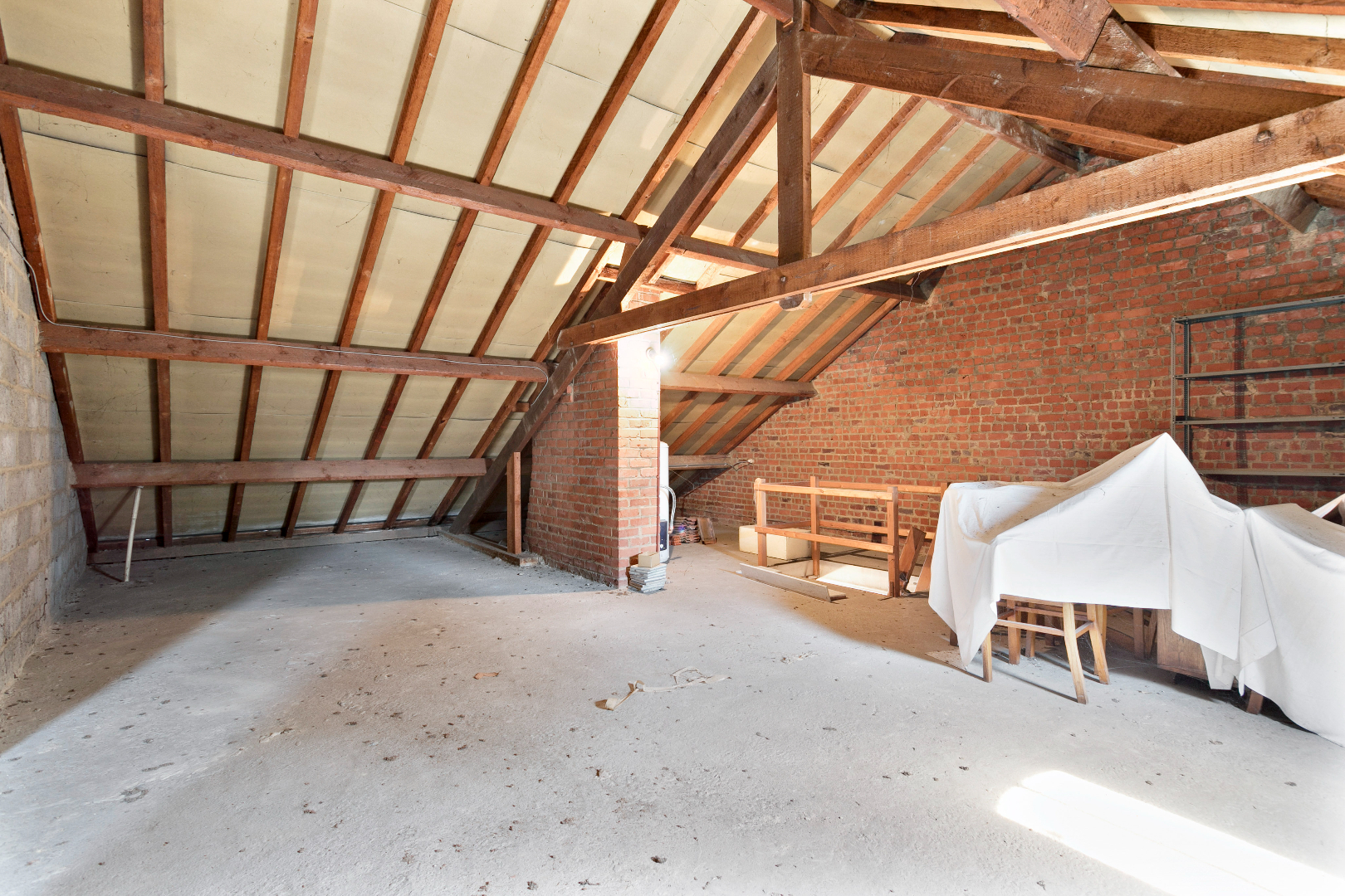 De nachthal boven straalt klasse uit. Langs de voorzijde bevindt zich de grote, vernieuwde badkamer met toilet, grote inloopdouche en lavabo. De ingemaakte kasten bieden veel bergruimte. Langs de voorzijde is er nog een grote slaapkamer. Langs de achterzijde nemen we een kijkje in een uiterst smaakvol gerenoveerde kamer met mooie, vaste, blauwe bibliotheekkast. De ramen zijn hier vernieuwd. Naast deze kamer bevindt zich de master bedroom. Ook hier zijn de ramen vernieuwd. Alle kamers en de nachthal hebben een mooie laminaatvloer. Boven de garage bevindt zich nog een grote kamer die momenteel gebruikt wordt als berging. Van hieruit is er ook een valtrap naar de grote, niet-geïsoleerde zolder. Hier is nog een zee aan ruimte!