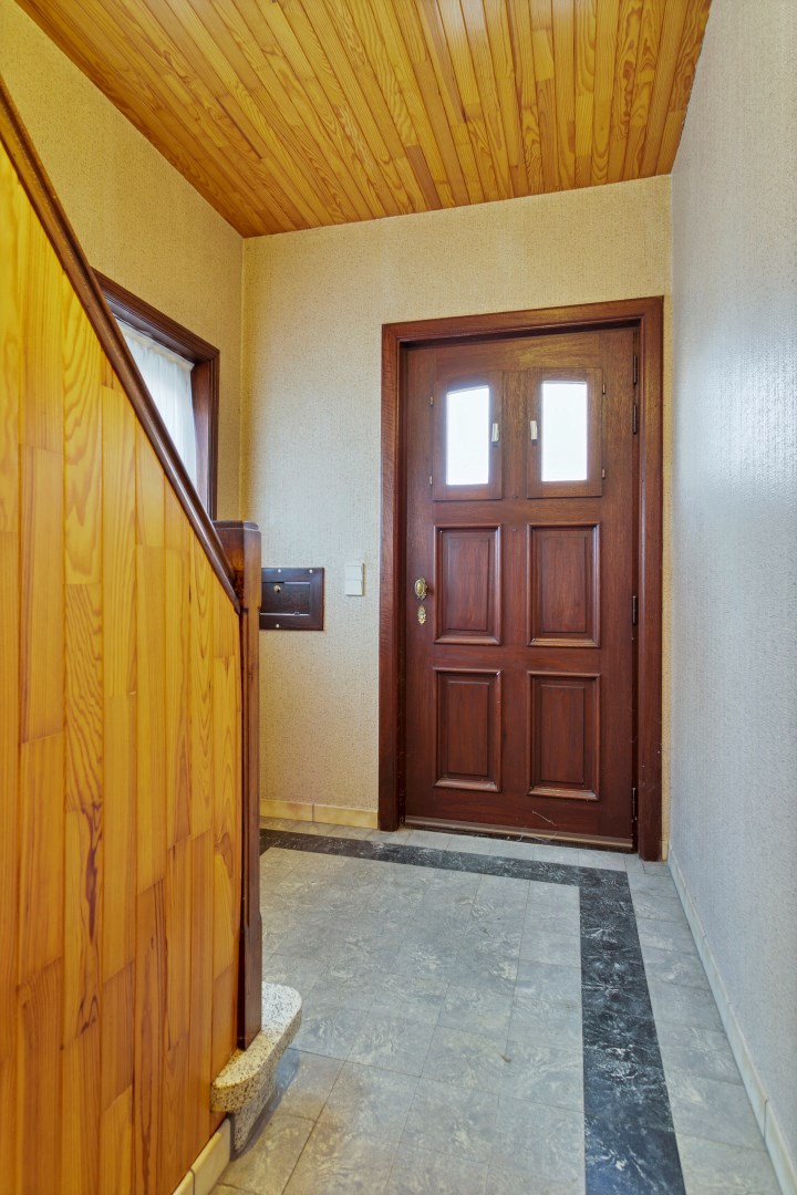 Vanuit de inkomhal kunnen we naar de leefruimte, de kelder of de bovenverdieping. De living is heel lichtrijk en paalt aan de ruime keuken. Zowel vanuit de leefruimte als de keuken is er zicht op de zongerichte tuin. In de keuken is er ook een deur die rechtstreeks op de oprit uitkomt.