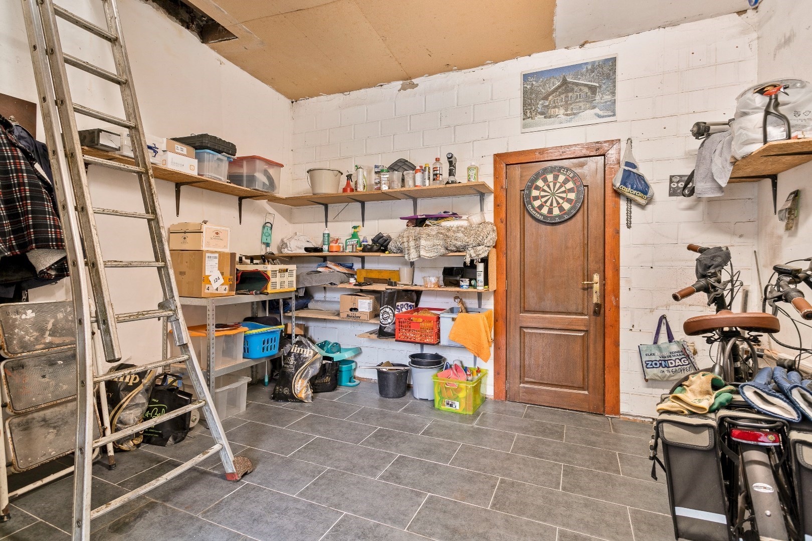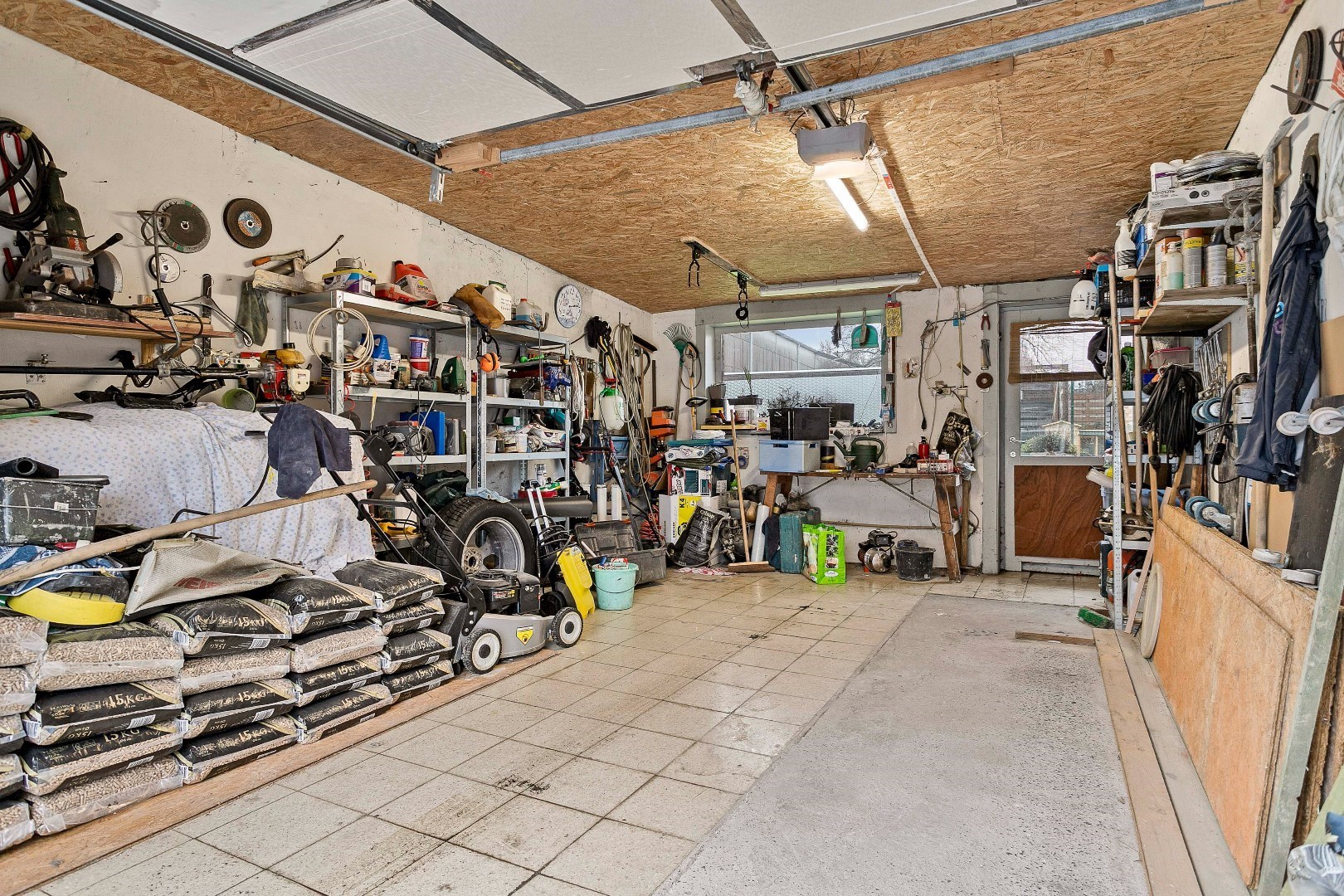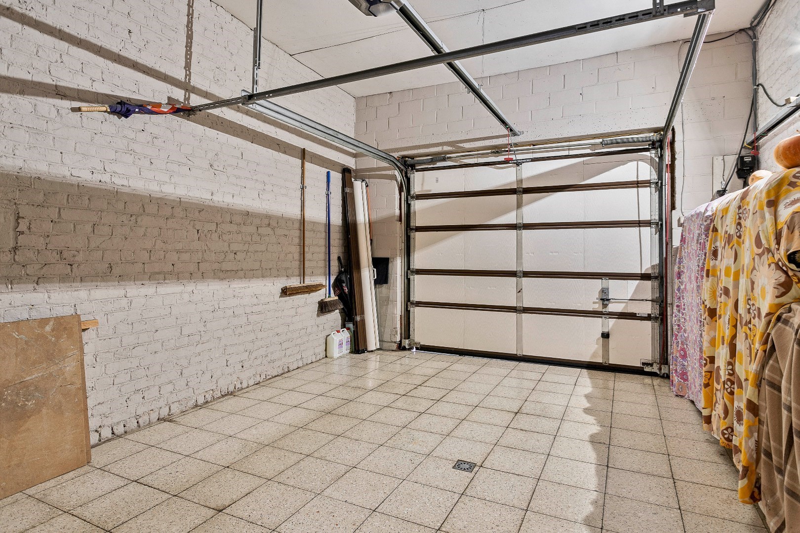 Terug op de gelijkvloerse verdieping vinden we de eerste garage met elektrische poort terug langs de voorzijde. Achter deze garage is er een berging met daarboven een tweede zolder. Op deze zolder kan eventueel nog een kamer worden gemaakt die dan kan bereikt worden via de nachthal vanuit de woning.
