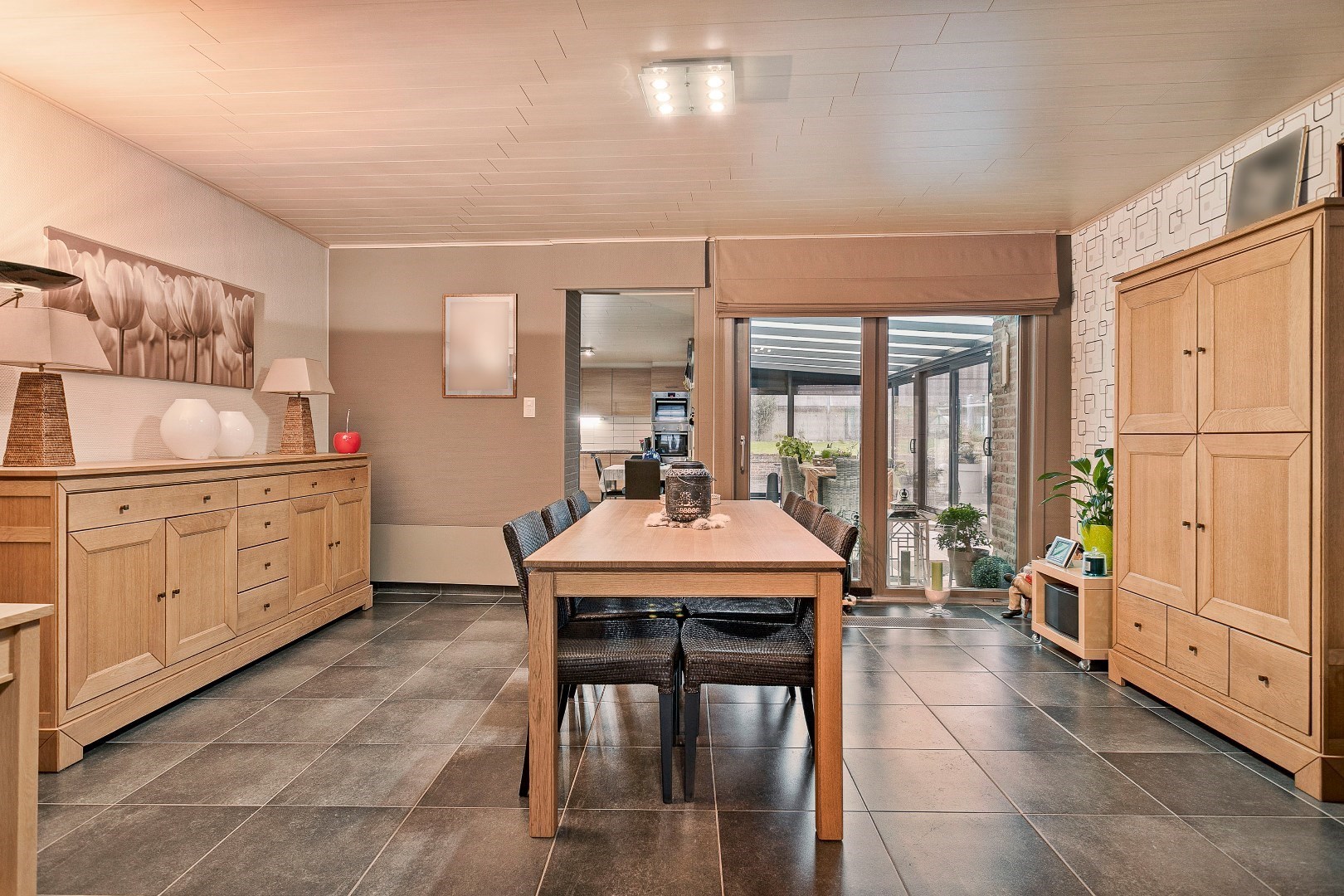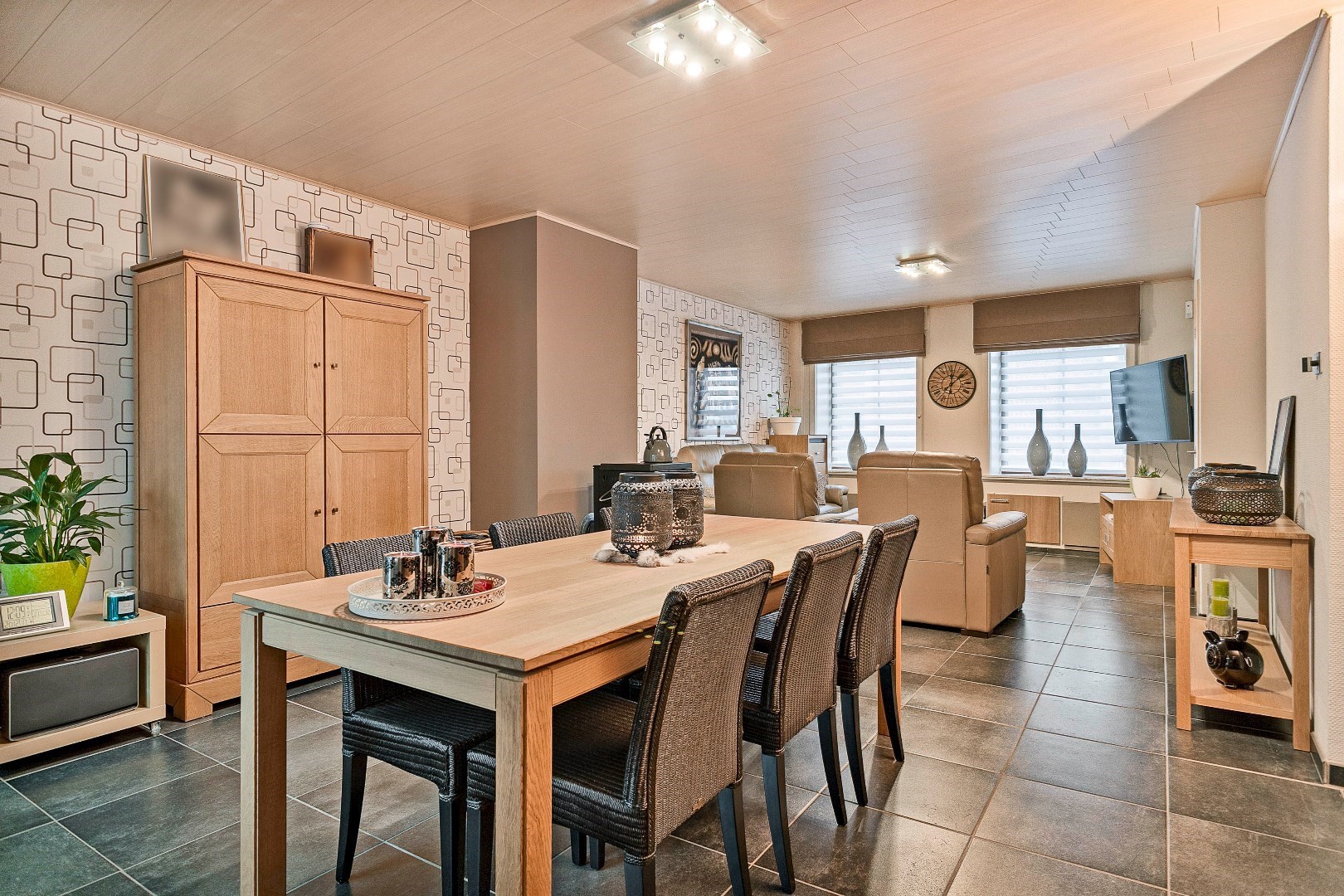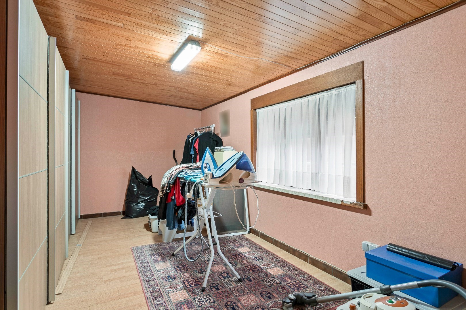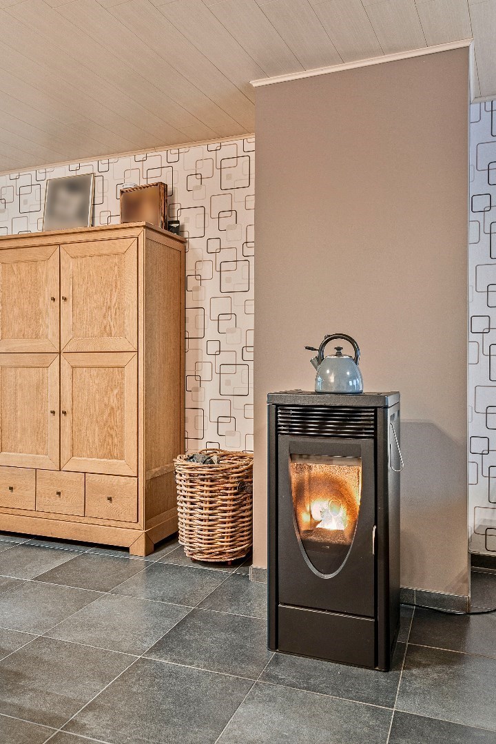 Achter deze nette gevel vinden we een verrassend ruime woning. Via de inkomhal komen we de grote leefruimte binnen. Een 3-tal jaar geleden werden de vloer en plafond hier vernieuwd. De pelletkachel zorgt ervoor dat het hier heel aangenaam vertoeven is. Aanpalend is er de grote, volledig uitgeruste keuken. Ook deze keuken werd 5 jaar geleden vernieuwd. Aansluitend is er nog de recente veranda. Deze dateert van 2018 en wordt ook verwarmd met een pelletkachel. Vanuit de veranda hebben we toegang tot een gastentoilet en een uiterst handige berging. Hier is plaats voor een wasmachine, droogkast en andere huishoudtoestellen. Onder deze berging en een deel van de keuken bevindt zich ook een grote kelder.