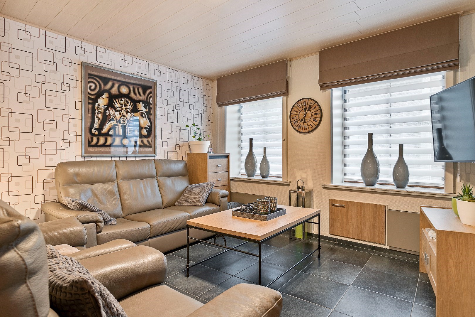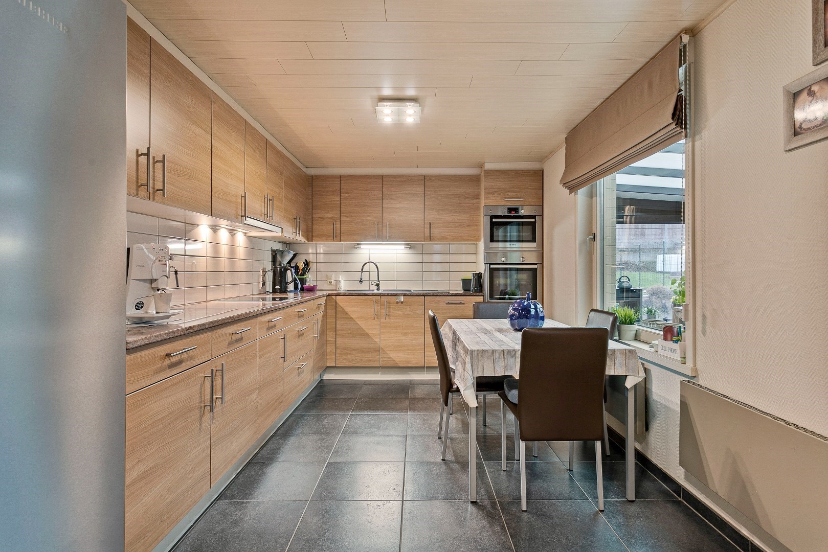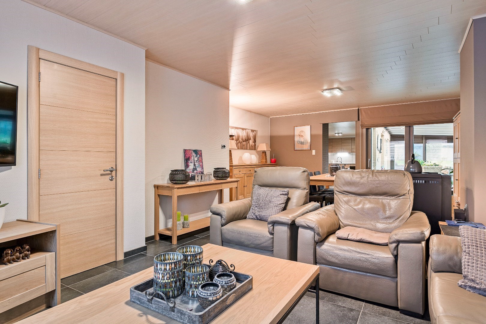 Achter deze nette gevel vinden we een verrassend ruime woning. Via de inkomhal komen we de grote leefruimte binnen. Een 3-tal jaar geleden werden de vloer en plafond hier vernieuwd. De pelletkachel zorgt ervoor dat het hier heel aangenaam vertoeven is. Aanpalend is er de grote, volledig uitgeruste keuken. Ook deze keuken werd 5 jaar geleden vernieuwd. Aansluitend is er nog de recente veranda. Deze dateert van 2018 en wordt ook verwarmd met een pelletkachel. Vanuit de veranda hebben we toegang tot een gastentoilet en een uiterst handige berging. Hier is plaats voor een wasmachine, droogkast en andere huishoudtoestellen. Onder deze berging en een deel van de keuken bevindt zich ook een grote kelder.