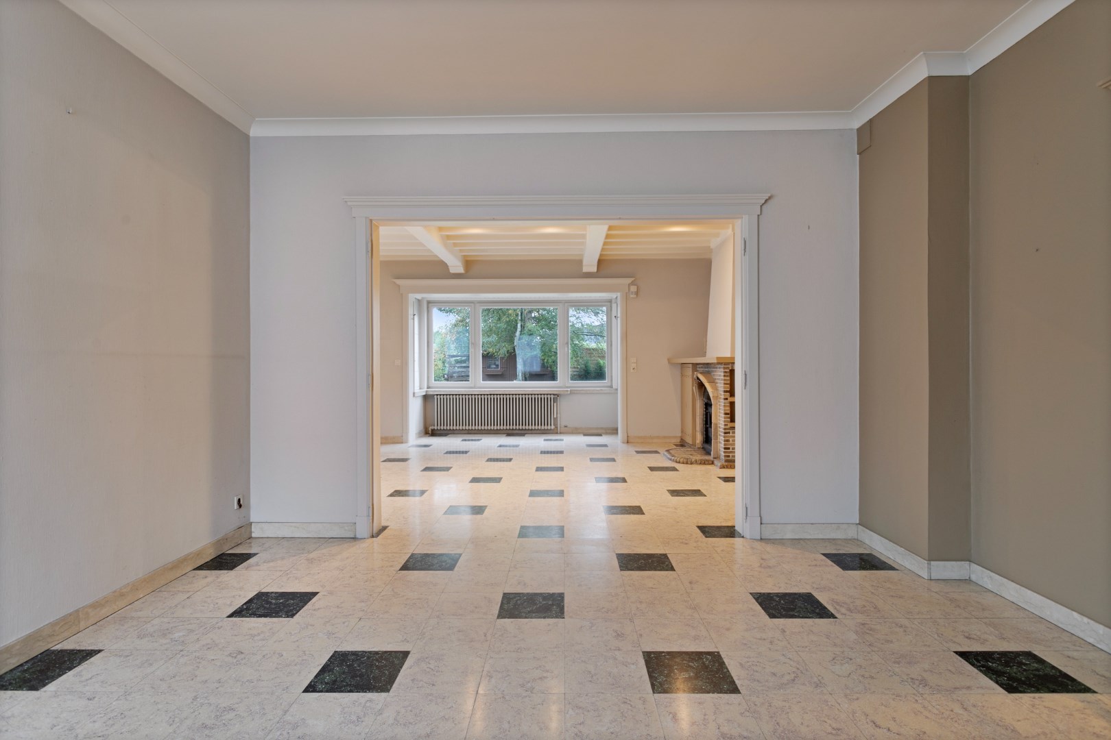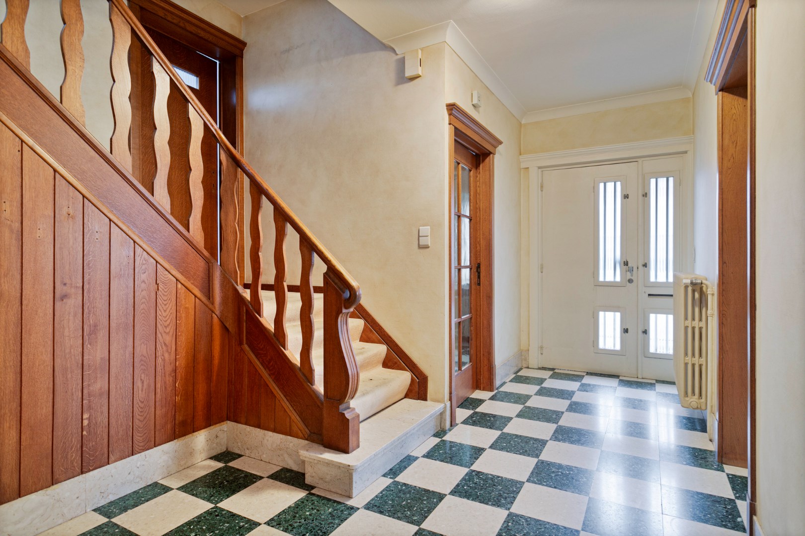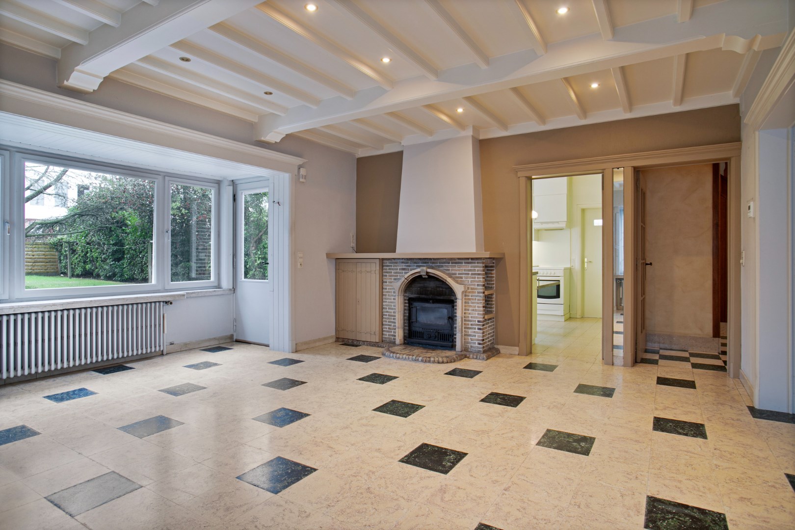 Via de mooie voortuin gaan we de trapjes op tot aan de voordeur. We komen binnen in de mooie, open traphal en gaan verder naar de living. Deze karaktervolle ruimte is ingedeeld in een eetplaats en gezellige zithoek met haard en zicht op de grote tuin. Aansluitend is er de keuken met daarachter een zeer ruime berging. Op het gelijkvloers is er nog een apart toilet. Via de keldertrap kunnen we naar de kelder, de ruime garage en de bureelruimte. Dankzij de aparte ingang langs de straat is deze ruimte uitermate geschikt om klanten te ontvangen in het aparte bureau, de pratijkruimte, ... (voorheen boekhoudkantoor).