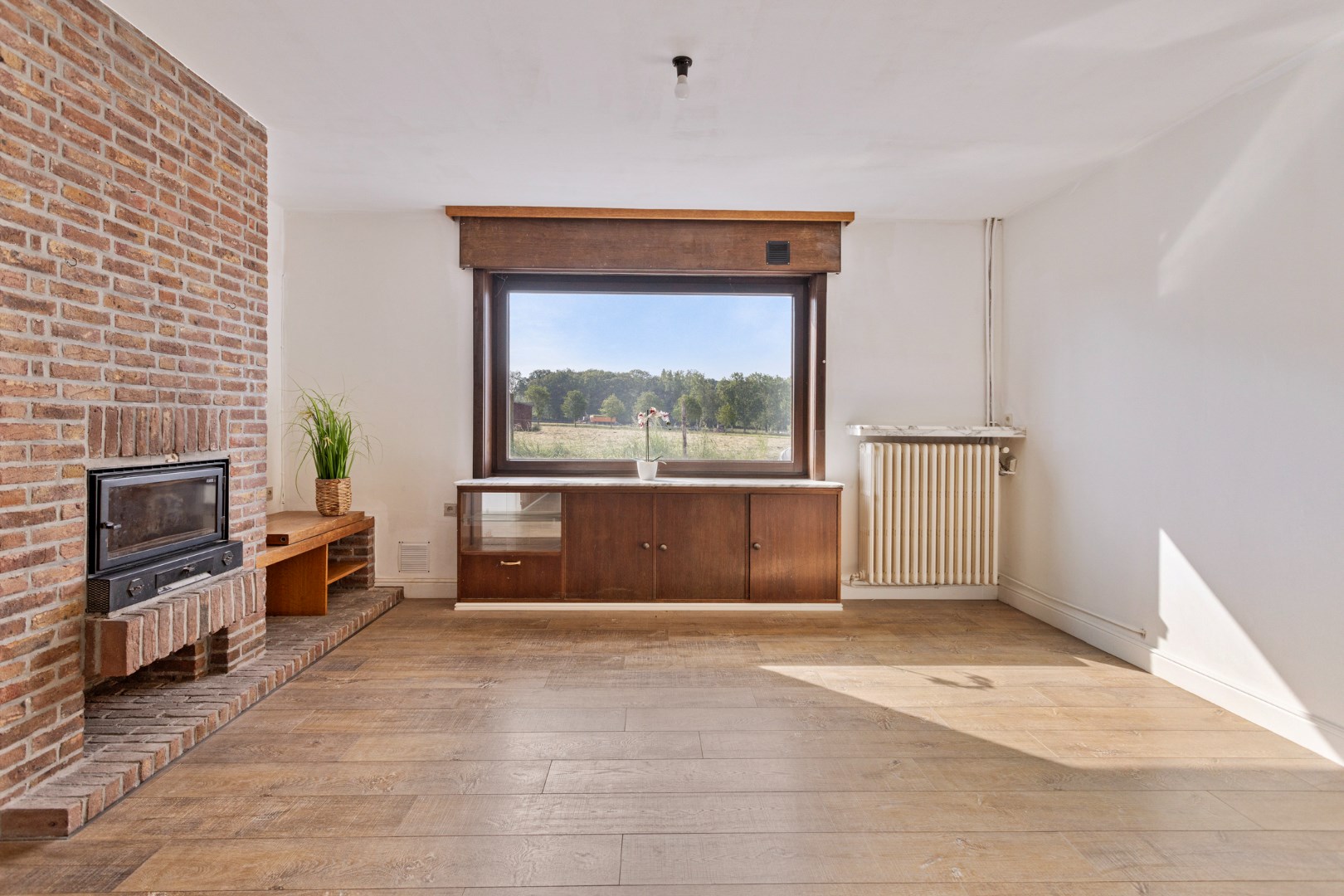 Via enkele landelijke wegen bereiken we deze hoekwoning met veel mogelijkheden. We komen binnen langs de hal en kunnen zo naar de living. Via het grote raam hebben we zicht op de omliggende weiden. De houtkachel zorgt voor de gezelligheid in de winter. Aansluitend is er de eenvoudige keuken. Op het gelijkvloers hebben we verder nog een badkamer met douche en lavabo, een apart toilet en bergingen.