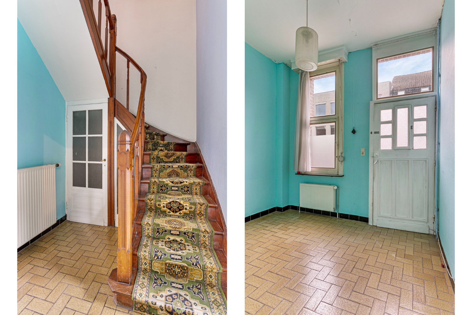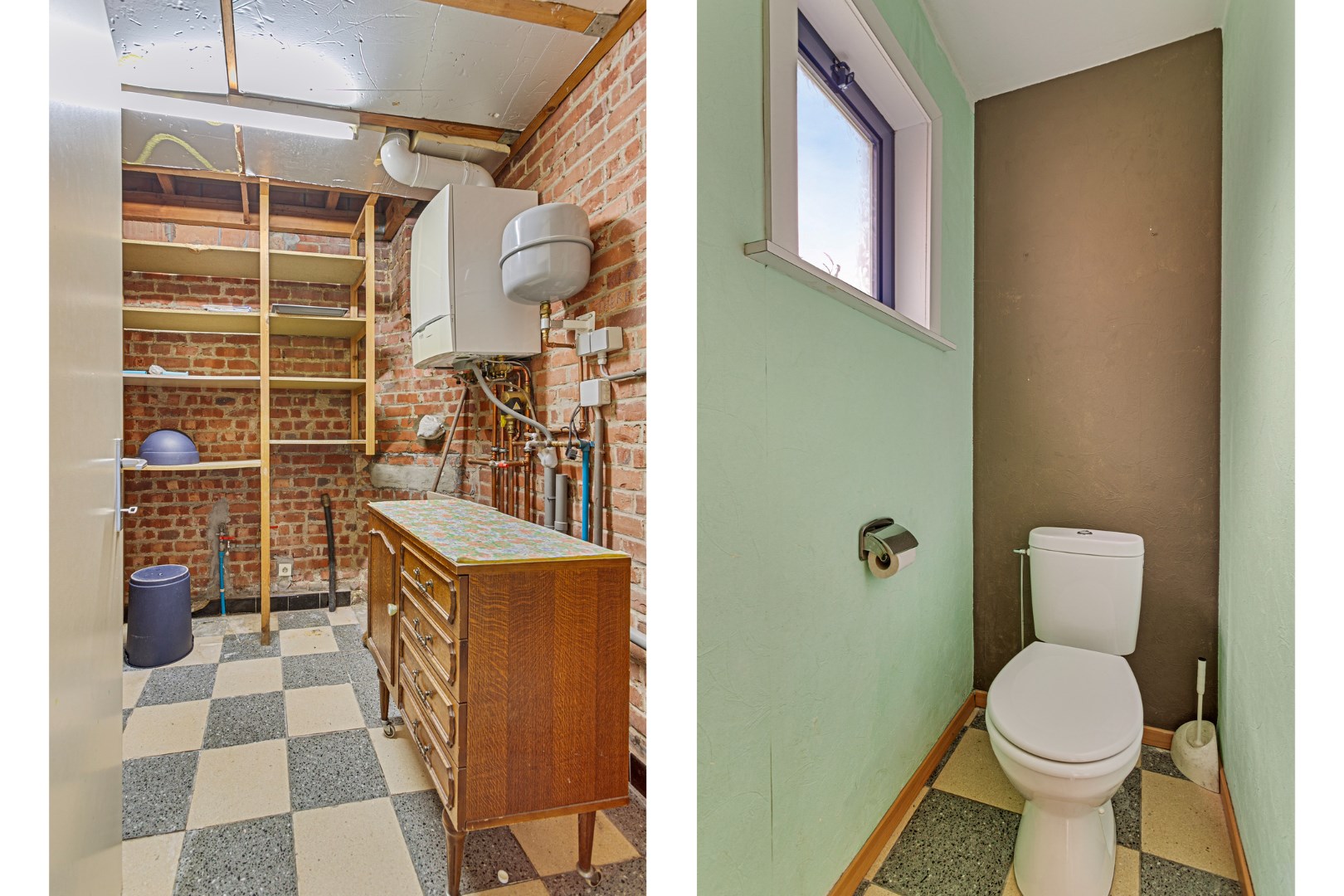 We komen binnen in de ruime inkom. Hier is bijvoorbeeld ook plaats om fietsen te stallen. Vervolgens komen we in de trappenhal met een indrukwekkende trap tot op zolder. Daaraan palend is er een eetplaats met open keuken. Terwijl u kokkerelt heeft u er een mooi zicht op de tuin en de Lauwse kerktoren. Verder zijn er hierachter ook nog een toilet en een achterliggende berging.