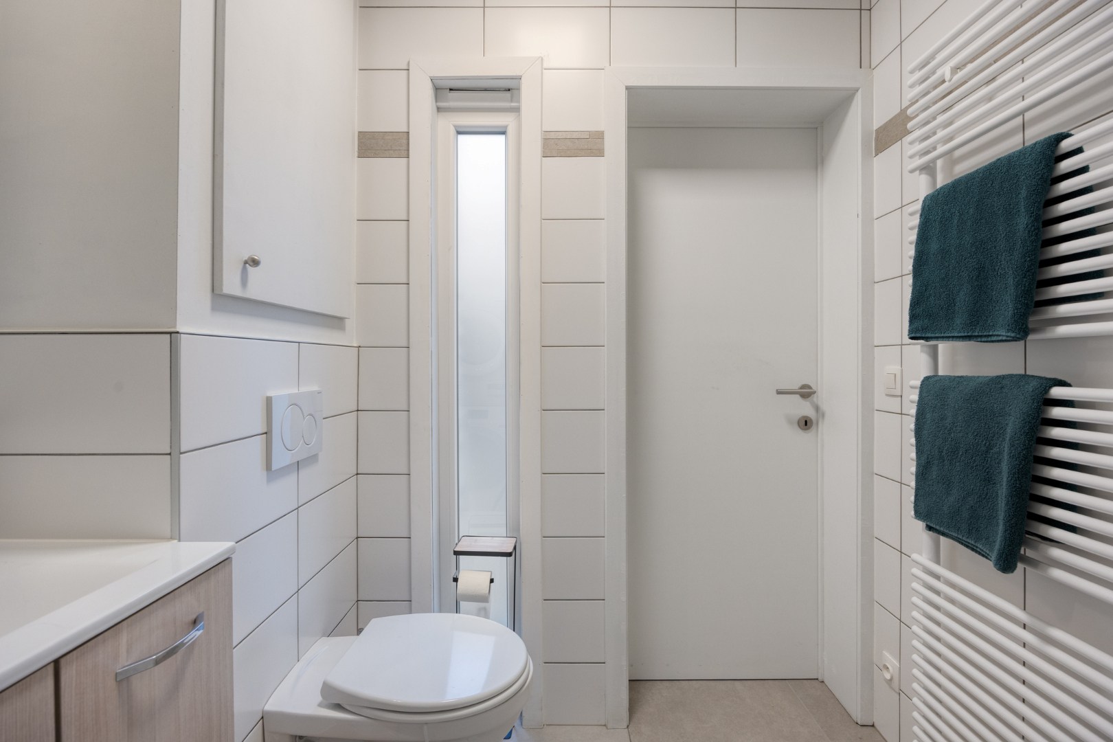 Achter de keuken bevindt zich de badkamer. Deze bestaat uit een mooie inloopdouche, het toilet en het wasmeubel. De nieuwe chauffageketel is hier ook geïnstalleerd. Er is ook plaats voor een droogkast en/of wasmachine.